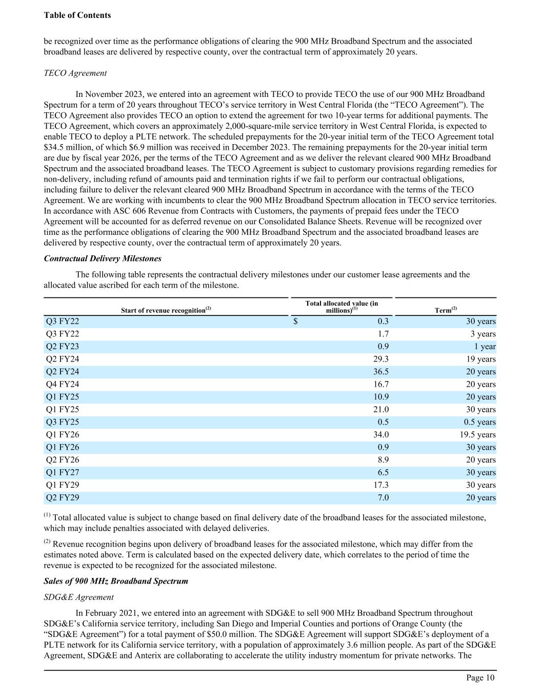 be recognized over time as the performance obligations of clearing the 900 MHz Broadband Spectrum and the associated broadband leases are delivered by respective county, over the contractual term of approximately 20 years. TECO Agreement In November 2023, we entered into an agreement with TECO to provide TECO the use of our 900 MHz Broadband Spectrum for a term of 20 years throughout TECO’s service territory in West Central Florida (the “TECO Agreement”). The TECO Agreement also provides TECO an option to extend the agreement for two 10-year terms for additional payments. The TECO Agreement, which covers an approximately 2,000-square-mile service territory in West Central Florida, is expected to enable TECO to deploy a PLTE network. The scheduled prepayments for the 20-year initial term of the TECO Agreement total $34.5 million, of which $6.9 million was received in December 2023. The remaining prepayments for the 20-year initial term are due by fiscal year 2026, per the terms of the TECO Agreement and as we deliver the relevant cleared 900 MHz Broadband Spectrum and the associated broadband leases. The TECO Agreement is subject to customary provisions regarding remedies for non-delivery, including refund of amounts paid and termination rights if we fail to perform our contractual obligations, including failure to deliver the relevant cleared 900 MHz Broadband Spectrum in accordance with the terms of the TECO Agreement. We are working with incumbents to clear the 900 MHz Broadband Spectrum allocation in TECO service territories. In accordance with ASC 606 Revenue from Contracts with Customers, the payments of prepaid fees under the TECO Agreement will be accounted for as deferred revenue on our Consolidated Balance Sheets. Revenue will be recognized over time as the performance obligations of clearing the 900 MHz Broadband Spectrum and the associated broadband leases are delivered by respective county, over the contractual term of approximately 20 years. Contractual Delivery Milestones The following table represents the contractual delivery milestones under our customer lease agreements and the allocated value ascribed for each term of the milestone. Start of revenue recognition(2) Total allocated value (in millions)(1) Term(2) Q3 FY22 $ 0.3 30 years Q3 FY22 1.7 3 years Q2 FY23 0.9 1 year Q2 FY24 29.3 19 years Q2 FY24 36.5 20 years Q4 FY24 16.7 20 years Q1 FY25 10.9 20 years Q1 FY25 21.0 30 years Q3 FY25 0.5 0.5 years Q1 FY26 34.0 19.5 years Q1 FY26 0.9 30 years Q2 FY26 8.9 20 years Q1 FY27 6.5 30 years Q1 FY29 17.3 30 years Q2 FY29 7.0 20 years (1) Total allocated value is subject to change based on final delivery date of the broadband leases for the associated milestone, which may include penalties associated with delayed deliveries. (2) Revenue recognition begins upon delivery of broadband leases for the associated milestone, which may differ from the estimates noted above. Term is calculated based on the expected delivery date, which correlates to the period of time the revenue is expected to be recognized for the associated milestone. Sales of 900 MHz Broadband Spectrum SDG&E Agreement In February 2021, we entered into an agreement with SDG&E to sell 900 MHz Broadband Spectrum throughout SDG&E’s California service territory, including San Diego and Imperial Counties and portions of Orange County (the “SDG&E Agreement”) for a total payment of $50.0 million. The SDG&E Agreement will support SDG&E’s deployment of a PLTE network for its California service territory, with a population of approximately 3.6 million people. As part of the SDG&E Agreement, SDG&E and Anterix are collaborating to accelerate the utility industry momentum for private networks. The Table of Contents Page 10
