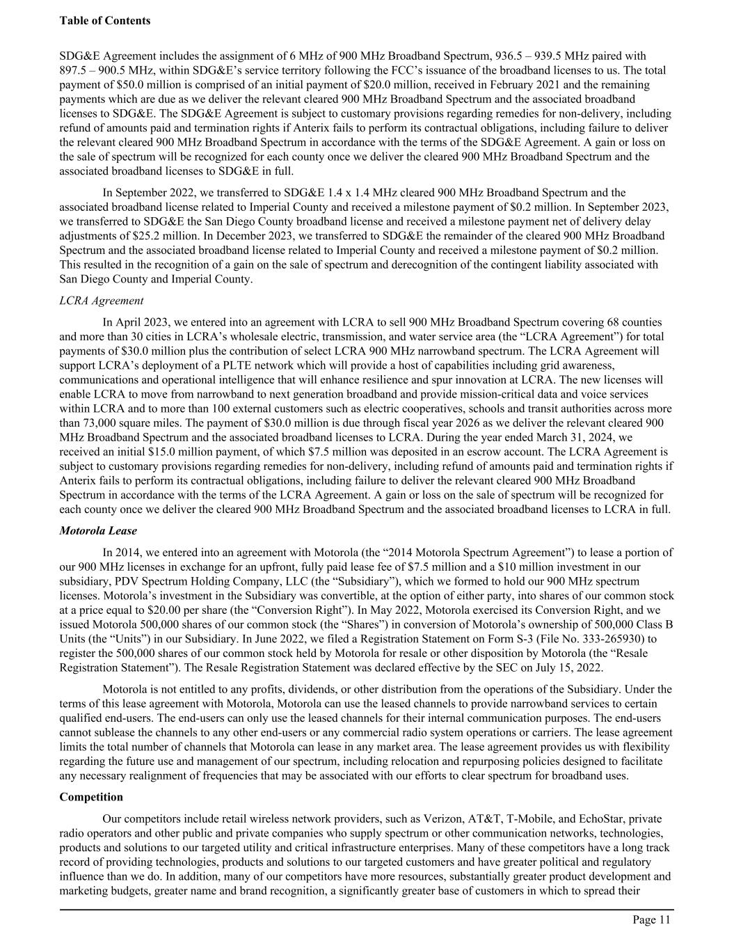SDG&E Agreement includes the assignment of 6 MHz of 900 MHz Broadband Spectrum, 936.5 – 939.5 MHz paired with 897.5 – 900.5 MHz, within SDG&E’s service territory following the FCC’s issuance of the broadband licenses to us. The total payment of $50.0 million is comprised of an initial payment of $20.0 million, received in February 2021 and the remaining payments which are due as we deliver the relevant cleared 900 MHz Broadband Spectrum and the associated broadband licenses to SDG&E. The SDG&E Agreement is subject to customary provisions regarding remedies for non-delivery, including refund of amounts paid and termination rights if Anterix fails to perform its contractual obligations, including failure to deliver the relevant cleared 900 MHz Broadband Spectrum in accordance with the terms of the SDG&E Agreement. A gain or loss on the sale of spectrum will be recognized for each county once we deliver the cleared 900 MHz Broadband Spectrum and the associated broadband licenses to SDG&E in full. In September 2022, we transferred to SDG&E 1.4 x 1.4 MHz cleared 900 MHz Broadband Spectrum and the associated broadband license related to Imperial County and received a milestone payment of $0.2 million. In September 2023, we transferred to SDG&E the San Diego County broadband license and received a milestone payment net of delivery delay adjustments of $25.2 million. In December 2023, we transferred to SDG&E the remainder of the cleared 900 MHz Broadband Spectrum and the associated broadband license related to Imperial County and received a milestone payment of $0.2 million. This resulted in the recognition of a gain on the sale of spectrum and derecognition of the contingent liability associated with San Diego County and Imperial County. LCRA Agreement In April 2023, we entered into an agreement with LCRA to sell 900 MHz Broadband Spectrum covering 68 counties and more than 30 cities in LCRA’s wholesale electric, transmission, and water service area (the “LCRA Agreement”) for total payments of $30.0 million plus the contribution of select LCRA 900 MHz narrowband spectrum. The LCRA Agreement will support LCRA’s deployment of a PLTE network which will provide a host of capabilities including grid awareness, communications and operational intelligence that will enhance resilience and spur innovation at LCRA. The new licenses will enable LCRA to move from narrowband to next generation broadband and provide mission-critical data and voice services within LCRA and to more than 100 external customers such as electric cooperatives, schools and transit authorities across more than 73,000 square miles. The payment of $30.0 million is due through fiscal year 2026 as we deliver the relevant cleared 900 MHz Broadband Spectrum and the associated broadband licenses to LCRA. During the year ended March 31, 2024, we received an initial $15.0 million payment, of which $7.5 million was deposited in an escrow account. The LCRA Agreement is subject to customary provisions regarding remedies for non-delivery, including refund of amounts paid and termination rights if Anterix fails to perform its contractual obligations, including failure to deliver the relevant cleared 900 MHz Broadband Spectrum in accordance with the terms of the LCRA Agreement. A gain or loss on the sale of spectrum will be recognized for each county once we deliver the cleared 900 MHz Broadband Spectrum and the associated broadband licenses to LCRA in full. Motorola Lease In 2014, we entered into an agreement with Motorola (the “2014 Motorola Spectrum Agreement”) to lease a portion of our 900 MHz licenses in exchange for an upfront, fully paid lease fee of $7.5 million and a $10 million investment in our subsidiary, PDV Spectrum Holding Company, LLC (the “Subsidiary”), which we formed to hold our 900 MHz spectrum licenses. Motorola’s investment in the Subsidiary was convertible, at the option of either party, into shares of our common stock at a price equal to $20.00 per share (the “Conversion Right”). In May 2022, Motorola exercised its Conversion Right, and we issued Motorola 500,000 shares of our common stock (the “Shares”) in conversion of Motorola’s ownership of 500,000 Class B Units (the “Units”) in our Subsidiary. In June 2022, we filed a Registration Statement on Form S-3 (File No. 333-265930) to register the 500,000 shares of our common stock held by Motorola for resale or other disposition by Motorola (the “Resale Registration Statement”). The Resale Registration Statement was declared effective by the SEC on July 15, 2022. Motorola is not entitled to any profits, dividends, or other distribution from the operations of the Subsidiary. Under the terms of this lease agreement with Motorola, Motorola can use the leased channels to provide narrowband services to certain qualified end-users. The end-users can only use the leased channels for their internal communication purposes. The end-users cannot sublease the channels to any other end-users or any commercial radio system operations or carriers. The lease agreement limits the total number of channels that Motorola can lease in any market area. The lease agreement provides us with flexibility regarding the future use and management of our spectrum, including relocation and repurposing policies designed to facilitate any necessary realignment of frequencies that may be associated with our efforts to clear spectrum for broadband uses. Competition Our competitors include retail wireless network providers, such as Verizon, AT&T, T-Mobile, and EchoStar, private radio operators and other public and private companies who supply spectrum or other communication networks, technologies, products and solutions to our targeted utility and critical infrastructure enterprises. Many of these competitors have a long track record of providing technologies, products and solutions to our targeted customers and have greater political and regulatory influence than we 
