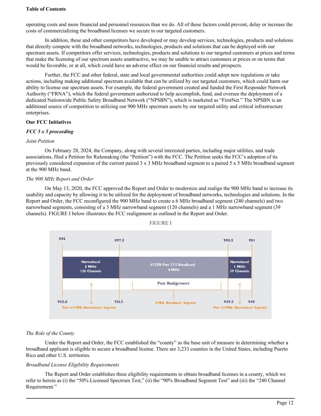 operating costs and more financial and personnel resources than we do. All of these factors could prevent, delay or increase the costs of commercializing the broadband licenses we secure to our targeted customers. In addition, these and other competitors have developed or may develop services, technologies, products and solutions that directly compete with the broadband networks, technologies, products and solutions that can be deployed with our spectrum assets. If competitors offer services, technologies, products and solutions to our targeted customers at prices and terms that make the licensing of our spectrum assets unattractive, we may be unable to attract customers at prices or on terms that would be favorable, or at all, which could have an adverse effect on our financial results and prospects. Further, the FCC and other federal, state and local governmental authorities could adopt new regulations or take actions, including making additional spectrum available that can be utilized by our targeted customers, which could harm our ability to license our spectrum assets. For example, the federal government created and funded the First Responder Network Authority (“FRNA”), which the federal government authorized to help accomplish, fund, and oversee the deployment of a dedicated Nationwide Public Safety Broadband Network (“NPSBN”), which is marketed as “FirstNet.” The NPSBN is an additional source of competition to utilizing our 900 MHz spectrum assets by our targeted utility and critical infrastructure enterprises. Our FCC Initiatives FCC 5 x 5 proceeding Joint Petition On February 28, 2024, the Company, along with several interested parties, including major utilities, and trade associations, filed a Petition for Rulemaking (the “Petition”) with the FCC. The Petition seeks the FCC’s adoption of its previously considered expansion of the current paired 3 x 3 MHz broadband segment to a paired 5 x 5 MHz broadband segment at the 900 MHz band. The 900 MHz Report and Order On May 13, 2020, the FCC approved the Report and Order to modernize and realign the 900 MHz band to increase its usability and capacity by allowing it to be utilized for the deployment of broadband networks, technologies and solutions. In the Report and Order, the FCC reconfigured the 900 MHz band to create a 6 MHz broadband segment (240 channels) and two narrowband segments, consisting of a 3 MHz narrowband segment (120 channels) and a 1 MHz narrowband segment (39 channels). FIGURE I below illustrates the FCC realignment as outlined in the Report and Order. FIGURE I The Role of the County Under the Report and Order, the FCC established the “county” as the base unit of measure in determining whether a broadband applicant is eligible to secure a broadband license. There are 3,233 counties in the United States, including Puerto Rico and other U.S. territories. Broadband License Eligibility Requirements The Report and Order establishes three eligibility requirements to obtain broadband licenses in a county, which we refer to herein as (i) the “50% Licensed Spectrum Test,” (ii) the “90% Broadband Segment Test” and (iii) the “240 Channel Requirement.” Table of Contents Page 12