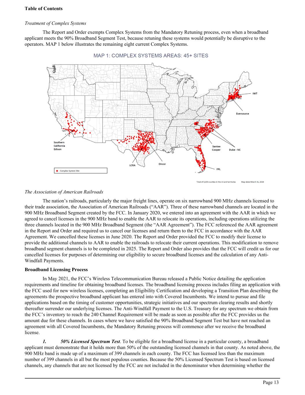 Treatment of Complex Systems The Report and Order exempts Complex Systems from the Mandatory Retuning process, even when a broadband applicant meets the 90% Broadband Segment Test, because retuning these systems would potentially be disruptive to the operators. MAP 1 below illustrates the remaining eight current Complex Systems. The Association of American Railroads The nation’s railroads, particularly the major freight lines, operate on six narrowband 900 MHz channels licensed to their trade association, the Association of American Railroads (“AAR”). Three of these narrowband channels are located in the 900 MHz Broadband Segment created by the FCC. In January 2020, we entered into an agreement with the AAR in which we agreed to cancel licenses in the 900 MHz band to enable the AAR to relocate its operations, including operations utilizing the three channels located in the 900 MHz Broadband Segment (the “AAR Agreement”). The FCC referenced the AAR agreement in the Report and Order and required us to cancel our licenses and return them to the FCC in accordance with the AAR Agreement. We cancelled these licenses in June 2020. The Report and Order provided the FCC to modify their license to provide the additional channels to AAR to enable the railroads to relocate their current operations. This modification to remove broadband segment channels is to be completed in 2025. The Report and Order also provides that the FCC will credit us for our cancelled licenses for purposes of determining our eligibility to secure broadband licenses and the calculation of any Anti- Windfall Payments. Broadband Licensing Process In May 2021, the FCC’s Wireless Telecommunication Bureau released a Public Notice detailing the application requirements and timeline for obtaining broadband licenses. The broadband licensing process includes filing an application with the FCC used for new wireless licenses, completing an Eligibility Certification and developing a Transition Plan describing the agreements the prospective broadband applicant has entered into with Covered Incumbents. We intend to pursue and file applications based on the timing of customer opportunities, strategic initiatives and our spectrum clearing results and shortly thereafter surrender our underlying licenses. The Anti-Windfall Payment to the U.S. Treasury for any spectrum we obtain from the FCC’s inventory to reach the 240 Channel Requirement will be made as soon as possible after the FCC provides us the amount due for these channels. In cases where we have satisfied the 90% Broadband Segment Test but have not reached an agreement with all Covered Incumbents, the Mandatory Retuning process will commence after we receive the broadband license. 1. 50% Licensed Spectrum Test. To be eligible for a broadband license in a particular county, a broadband applicant must demonstrate that it holds more than 50% of the outstanding licensed channels in that county. As noted above, the 900 MHz band is made up of a maximum of 399 channels in each county. The FCC has licensed less than the maximum number of 399 channels in all but the most populous counties. Because the 50% Licensed Spectrum Test is based on licensed channels, any channels that are not licensed by the FCC are not included in the denominator when determining whether the Table of Contents Page 13
