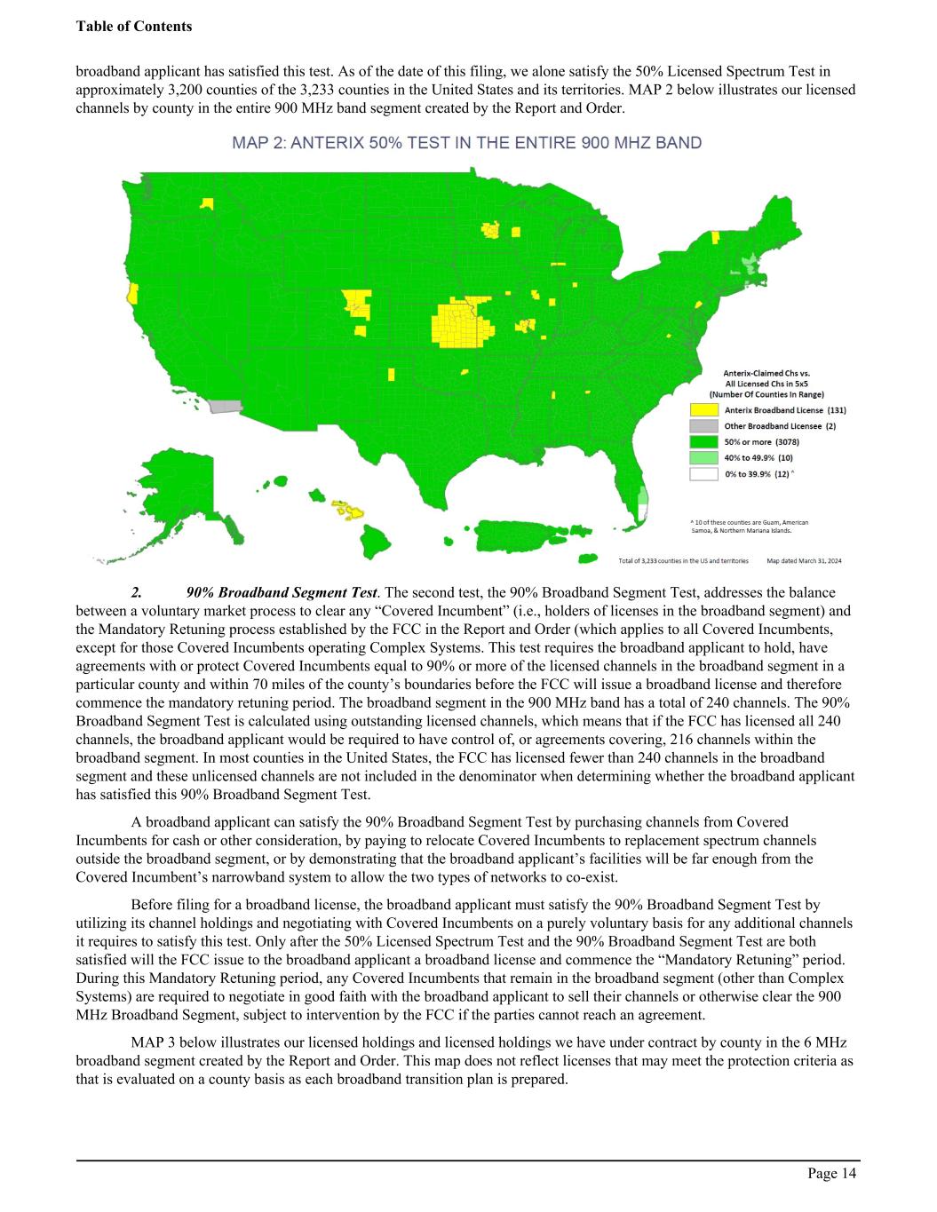 broadband applicant has satisfied this test. As of the date of this filing, we alone satisfy the 50% Licensed Spectrum Test in approximately 3,200 counties of the 3,233 counties in the United States and its territories. MAP 2 below illustrates our licensed channels by county in the entire 900 MHz band segment created by the Report and Order. 2. 90% Broadband Segment Test. The second test, the 90% Broadband Segment Test, addresses the balance between a voluntary market process to clear any “Covered Incumbent” (i.e., holders of licenses in the broadband segment) and the Mandatory Retuning process established by the FCC in the Report and Order (which applies to all Covered Incumbents, except for those Covered Incumbents operating Complex Systems. This test requires the broadband applicant to hold, have agreements with or protect Covered Incumbents equal to 90% or more of the licensed channels in the broadband segment in a particular county and within 70 miles of the county’s boundaries before the FCC will issue a broadband license and therefore commence the mandatory retuning period. The broadband segment in the 900 MHz band has a total of 240 channels. The 90% Broadband Segment Test is calculated using outstanding licensed channels, which means that if the FCC has licensed all 240 channels, the broadband applicant would be required to have control of, or agreements covering, 216 channels within the broadband segment. In most counties in the United States, the FCC has licensed fewer than 240 channels in the broadband segment and these unlicensed channels are not included in the denominator when determining whether the broadband applicant has satisfied this 90% Broadband Segment Test. A broadband applicant can satisfy the 90% Broadband Segment Test by purchasing channels from Covered Incumbents for cash or other consideration, by paying to relocate Covered Incumbents to replacement spectrum channels outside the broadband segment, or by demonstrating that the broadband applicant’s facilities will be far enough from the Covered Incumbent’s narrowband system to allow the two types of networks to co-exist. Before filing for a broadband license, the broadband applicant must satisfy the 90% Broadband Segment Test by utilizing its channel holdings and negotiating with Covered Incumbents on a purely voluntary basis for any additional channels it requires to satisfy this test. Only after the 50% Licensed Spectrum Test and the 90% Broadband Segment Test are both satisfied will the FCC issue to the broadband applicant a broadband license and commence the “Mandatory Retuning” period. During this Mandatory Retuning period, any Covered Incumbents that remain in the broadband segment (other than Complex Systems) are required to negotiate in good faith with the broadband applicant to sell their channels or otherwise clear the 900 MHz Broadband Segment, subject to intervention by the FCC if the parties cannot reach an agreement. MAP 3 below illustrates our licensed holdings and licensed holdings we have under contract by county in the 6 MHz broadband segment created by the Report and Order. This map does not reflect licenses that may meet the protection criteria as that is evaluated on a county basis as each broadband transition plan is prepared. Table of Contents Page 14