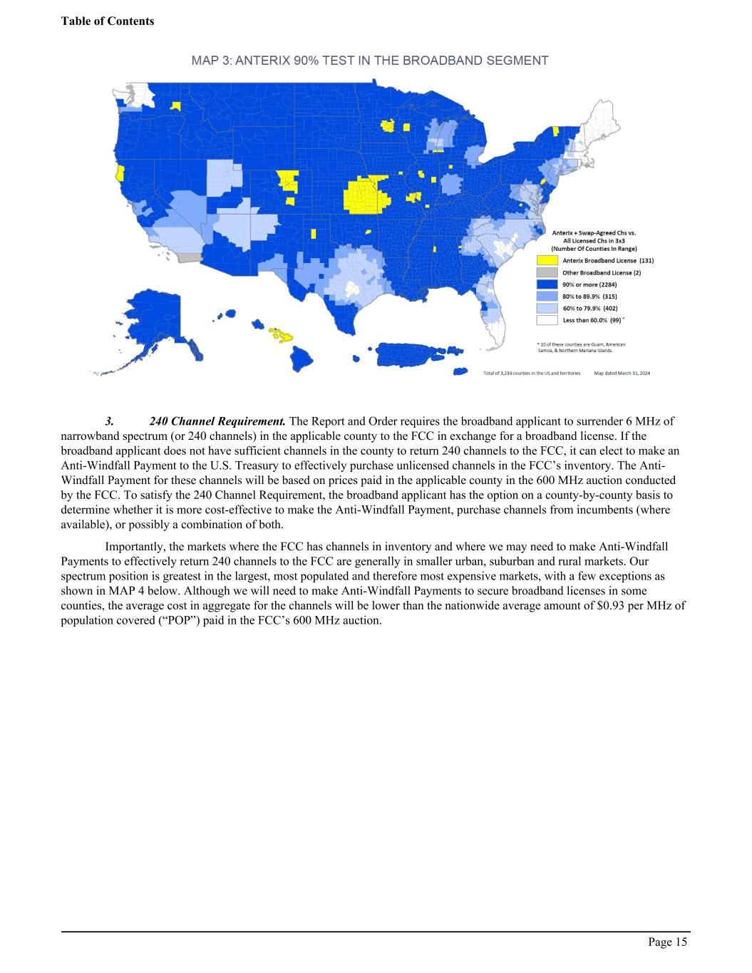 3. 240 Channel Requirement. The Report and Order requires the broadband applicant to surrender 6 MHz of narrowband spectrum (or 240 channels) in the applicable county to the FCC in exchange for a broadband license. If the broadband applicant does not have sufficient channels in the county to return 240 channels to the FCC, it can elect to make an Anti-Windfall Payment to the U.S. Treasury to effectively purchase unlicensed channels in the FCC’s inventory. The Anti- Windfall Payment for these channels will be based on prices paid in the applicable county in the 600 MHz auction conducted by the FCC. To satisfy the 240 Channel Requirement, the broadband applicant has the option on a county-by-county basis to determine whether it is more cost-effective to make the Anti-Windfall Payment, purchase channels from incumbents (where available), or possibly a combination of both. Importantly, the markets where the FCC has channels in inventory and where we may need to make Anti-Windfall Payments to effectively return 240 channels to the FCC are generally in smaller urban, suburban and rural markets. Our spectrum position is greatest in the largest, most populated and therefore most expensive markets, with a few exceptions as shown in MAP 4 below. Although we will need to make Anti-Windfall Payments to secure broadband licenses in some counties, the average cost in aggregate for the channels will be lower than the nationwide average amount of $0.93 per MHz of population covered (“POP”) paid in the FCC’s 600 MHz auction. Table of Contents Page 15