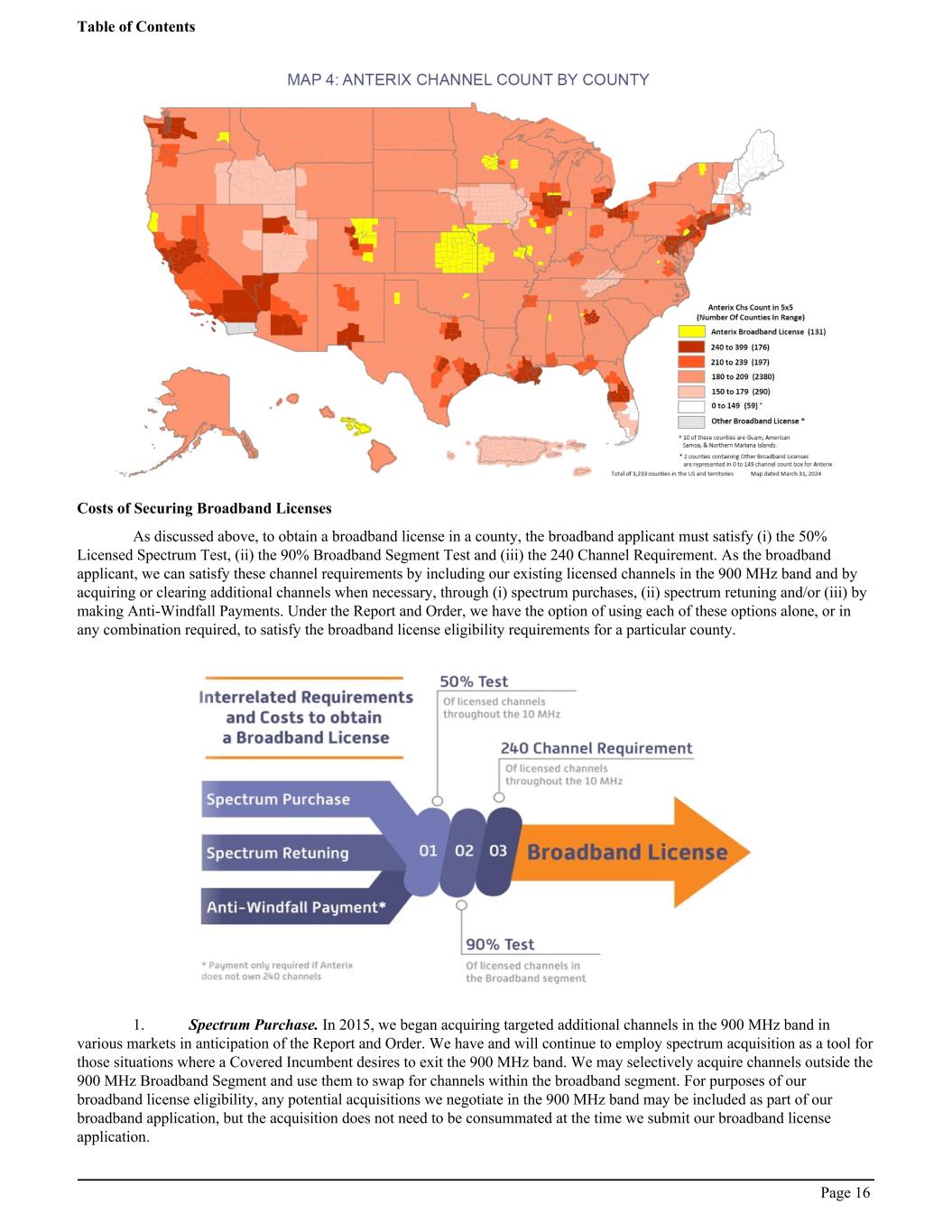 Costs of Securing Broadband Licenses As discussed above, to obtain a broadband license in a county, the broadband applicant must satisfy (i) the 50% Licensed Spectrum Test, (ii) the 90% Broadband Segment Test and (iii) the 240 Channel Requirement. As the broadband applicant, we can satisfy these channel requirements by including our existing licensed channels in the 900 MHz band and by acquiring or clearing additional channels when necessary, through (i) spectrum purchases, (ii) spectrum retuning and/or (iii) by making Anti-Windfall Payments. Under the Report and Order, we have the option of using each of these options alone, or in any combination required, to satisfy the broadband license eligibility requirements for a particular county. 1. Spectrum Purchase. In 2015, we began acquiring targeted additional channels in the 900 MHz band in various markets in anticipation of the Report and Order. We have and will continue to employ spectrum acquisition as a tool for those situations where a Covered Incumbent desires to exit the 900 MHz band. We may selectively acquire channels outside the 900 MHz Broadband Segment and use them to swap for channels within the broadband segment. For purposes of our broadband license eligibility, any potential acquisitions we negotiate in the 900 MHz band may be included as part of our broadband application, but the acquisition does not need to be consummated at the time we submit our broadband license application. Table of Contents Page 16