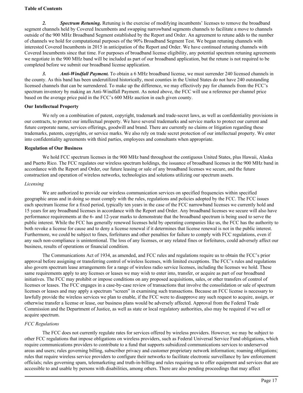 2. Spectrum Retuning. Retuning is the exercise of modifying incumbents’ licenses to remove the broadband segment channels held by Covered Incumbents and swapping narrowband segments channels to facilitate a move to channels outside of the 900 MHz Broadband Segment established by the Report and Order. An agreement to retune adds to the number of channels we hold for computational purposes of the 90% Broadband Segment Test. We began retuning channels with interested Covered Incumbents in 2015 in anticipation of the Report and Order. We have continued retuning channels with Covered Incumbents since that time. For purposes of broadband license eligibility, any potential spectrum retuning agreements we negotiate in the 900 MHz band will be included as part of our broadband application, but the retune is not required to be completed before we submit our broadband license application. 3. Anti-Windfall Payment. To obtain a 6 MHz broadband license, we must surrender 240 licensed channels in the county. As this band has been underutilized historically, most counties in the United States do not have 240 outstanding licensed channels that can be surrendered. To make up the difference, we may effectively pay for channels from the FCC’s spectrum inventory by making an Anti-Windfall Payment. As noted above, the FCC will use a reference per channel price based on the average price paid in the FCC’s 600 MHz auction in each given county. Our Intellectual Property We rely on a combination of patent, copyright, trademark and trade-secret laws, as well as confidentiality provisions in our contracts, to protect our intellectual property. We have several trademarks and service marks to protect our current and future corporate name, services offerings, goodwill and brand. There are currently no claims or litigation regarding these trademarks, patents, copyrights, or service marks. We also rely on trade secret protection of our intellectual property. We enter into confidentiality agreements with third parties, employees and consultants when appropriate. Regulation of Our Business We hold FCC spectrum licenses in the 900 MHz band throughout the contiguous United States, plus Hawaii, Alaska and Puerto Rico. The FCC regulates our wireless spectrum holdings, the issuance of broadband licenses in the 900 MHz band in accordance with the Report and Order, our future leasing or sale of any broadband licenses we secure, and the future construction and operation of wireless networks, technologies and solutions utilizing our spectrum assets. Licensing We are authorized to provide our wireless communication services on specified frequencies within specified geographic areas and in doing so must comply with the rules, regulations and policies adopted by the FCC. The FCC issues each spectrum license for a fixed period, typically ten years in the case of the FCC narrowband licenses we currently hold and 15 years for any broadband licenses in accordance with the Report and Order. Any broadband licenses we secure will also have performance requirements at the 6- and 12-year marks to demonstrate that the broadband spectrum is being used to serve the public interest. While the FCC has generally renewed licenses held by operating companies like us, the FCC has the authority to both revoke a license for cause and to deny a license renewal if it determines that license renewal is not in the public interest. Furthermore, we could be subject to fines, forfeitures and other penalties for failure to comply with FCC regulations, even if any such non-compliance is unintentional. The loss of any licenses, or any related fines or forfeitures, could adversely affect our business, results of operations or financial condition. The Communications Act of 1934, as amended, and FCC rules and regulations require us to obtain the FCC’s prior approval before assigning or transferring control of wireless licenses, with limited exceptions. The FCC’s rules and regulations also govern spectrum lease arrangements for a range of wireless radio service licenses, including the licenses we hold. These same requirements apply to any licenses or leases we may wish to enter into, transfer, or acquire as part of our broadband initiatives. The FCC may prohibit or impose conditions on any proposed acquisitions, sales, or other transfers of control of licenses or leases. The FCC engages in a case-by-case review of transactions that involve the consolidation or sale of spectrum licenses or leases and may apply a spectrum “screen” in examining such transactions. Because an FCC license is necessary to lawfully provide the wireless services we plan to enable, if the FCC were to disapprove any such request to acquire, assign, or otherwise transfer a license or lease, our business plans would be adversely affected. Approval from the Federal Trade Commission and the Department of Justice, as well as state or local regulatory authorities, also may be required if we sell or acquire spectrum. FCC Regulations The FCC does not currently regulate rates for services offered by wireless providers. However, we may be subject to other FCC regulations that impose obligations on wireless providers, such as Federal Universal Service Fund obligations, which require communications providers to contribute to a fund that supports subsidized communications services to underserved areas and users; rules governing billing, subscriber privacy and customer proprietary network information; roaming obligations; rules that require wireless service providers to configure their networks to facilitate electronic surveillance by law enforcement officials; rules governing spam, telemarketing and truth-in-billing and rules requiring us to offer equipment and services that are accessible to and usable by persons with disabilities, among others. There are also pending proceedings that may affect Table of Contents Page 17