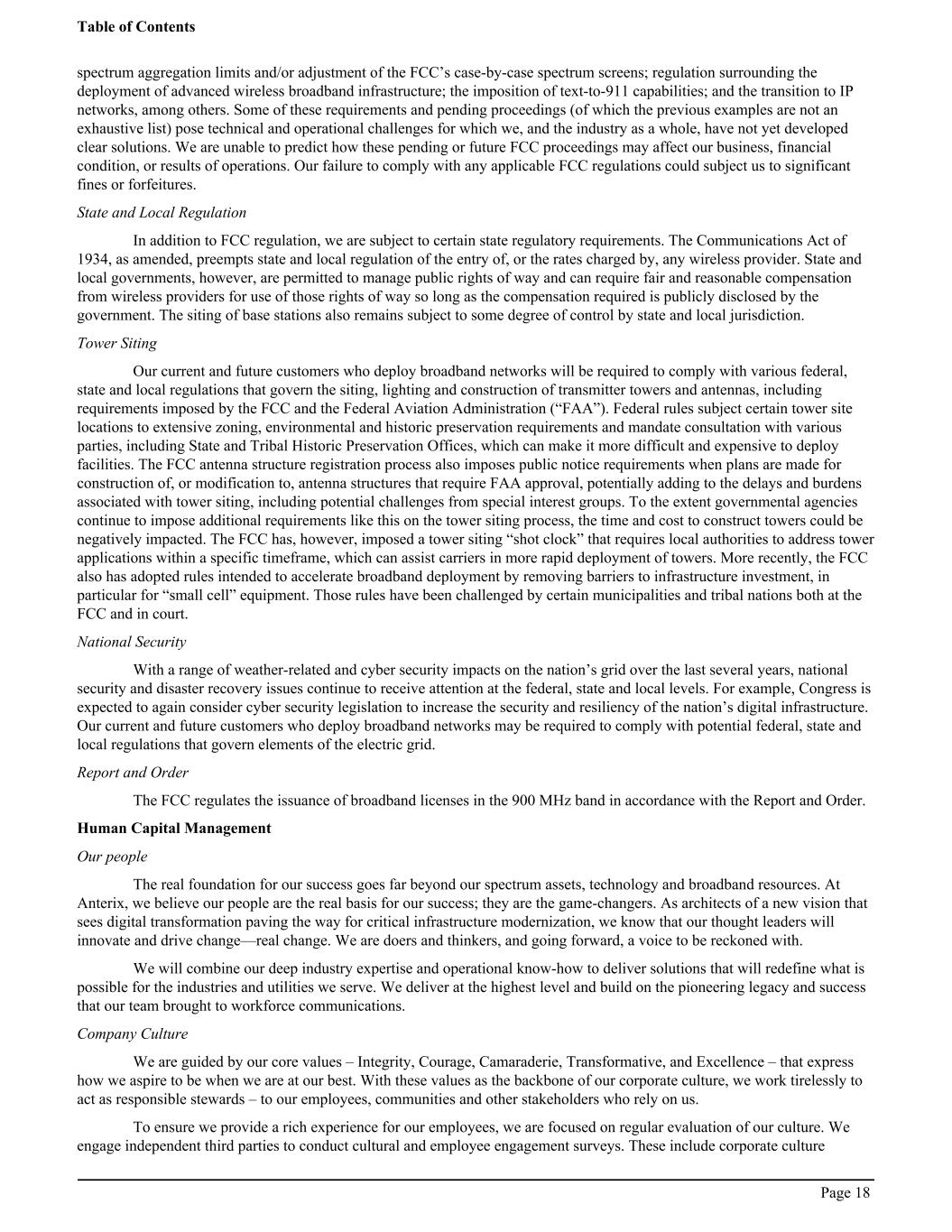 spectrum aggregation limits and/or adjustment of the FCC’s case-by-case spectrum screens; regulation surrounding the deployment of advanced wireless broadband infrastructure; the imposition of text-to-911 capabilities; and the transition to IP networks, among others. Some of these requirements and pending proceedings (of which the previous examples are not an exhaustive list) pose technical and operational challenges for which we, and the industry as a whole, have not yet developed clear solutions. We are unable to predict how these pending or future FCC proceedings may affect our business, financial condition, or results of operations. Our failure to comply with any applicable FCC regulations could subject us to significant fines or forfeitures. State and Local Regulation In addition to FCC regulation, we are subject to certain state regulatory requirements. The Communications Act of 1934, as amended, preempts state and local regulation of the entry of, or the rates charged by, any wireless provider. State and local governments, however, are permitted to manage public rights of way and can require fair and reasonable compensation from wireless providers for use of those rights of way so long as the compensation required is publicly disclosed by the government. The siting of base stations also remains subject to some degree of control by state and local jurisdiction. Tower Siting Our current and future customers who deploy broadband networks will be required to comply with various federal, state and local regulations that govern the siting, lighting and construction of transmitter towers and antennas, including requirements imposed by the FCC and the Federal Aviation Administration (“FAA”). Federal rules subject certain tower site locations to extensive zoning, environmental and historic preservation requirements and mandate consultation with various parties, including State and Tribal Historic Preservation Offices, which can make it more difficult and expensive to deploy facilities. The FCC antenna structure registration process also imposes public notice requirements when plans are made for construction of, or modification to, antenna structures that require FAA approval, potentially adding to the delays and burdens associated with tower siting, including potential challenges from special interest groups. To the extent governmental agencies continue to impose additional requirements like this on the tower siting process, the time and cost to construct towers could be negatively impacted. The FCC has, however, imposed a tower siting “shot clock” that requires local authorities to address tower applications within a specific timeframe, which can assist carriers in more rapid deployment of towers. More recently, the FCC also has adopted rules intended to accelerate broadband deployment by removing barriers to infrastructure investment, in particular for “small cell” equipment. Those rules have been challenged by certain municipalities and tribal nations both at the FCC and in court. National Security With a range of weather-related and cyber security impacts on the nation’s grid over the last several years, national security and disaster recovery issues continue to receive attention at the federal, state and local levels. For example, Congress is expected to again consider cyber security legislation to increase the security and resiliency of the nation’s digital infrastructure. Our current and future customers who deploy broadband networks may be required to comply with potential federal, state and local regulations that govern elements of the electric grid. Report and Order The FCC regulates the issuance of broadband licenses in the 900 MHz band in accordance with the Report and Order. Human Capital Management Our people The real foundation for our success goes far beyond our spectrum assets, technology and broadband resources. At Anterix, we believe our people are the real basis for our success; they are the game-changers. As architects of a new vision that sees digital transformation paving the way for critical infrastructure modernization, we know that our thought leaders will innovate and drive change—real change. We are doers and thinkers, and going forward, a voice to be reckoned with. We will combine our deep industry expertise and operational know-how to deliver solutions that will redefine what is possible for the industries and utilities we serve. We deliver at the highest level and build on the pioneering legacy and success that our team brought to workforce communications. Company Culture We are guided by our core values – Integrity, Courage, Camaraderie, Transformative, and Excellence – that express how we aspire to be when we are at our best. With these values as the backbone of our corporate culture, we work tirelessly to act as responsible stewards – to our employees, communities and other stakeholders who rely on us. To ensure we provide a rich experience for our employees, we are focused on regular evaluation of our culture. We engage independent third parties to conduct cultural and employee engagement surveys. These include corporate culture Table of Contents Page 18