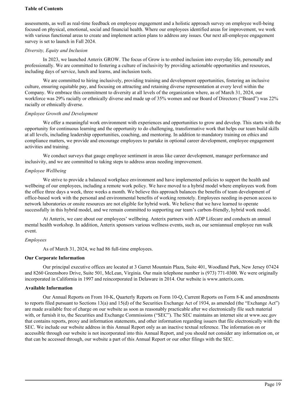 assessments, as well as real-time feedback on employee engagement and a holistic approach survey on employee well-being focused on physical, emotional, social and financial health. Where our employees identified areas for improvement, we work with various functional areas to create and implement action plans to address any issues. Our next all-employee engagement survey is set to launch in Fall 2024. Diversity, Equity and Inclusion In 2023, we launched Anterix GROW. The focus of Grow is to embed inclusion into everyday life, personally and professionally. We are committed to fostering a culture of inclusivity by providing actionable opportunities and resources, including days of service, lunch and learns, and inclusion tools. We are committed to hiring inclusively, providing training and development opportunities, fostering an inclusive culture, ensuring equitable pay, and focusing on attracting and retaining diverse representation at every level within the Company. We embrace this commitment to diversity at all levels of the organization where, as of March 31, 2024, our workforce was 29% racially or ethnically diverse and made up of 35% women and our Board of Directors (“Board”) was 22% racially or ethnically diverse. Employee Growth and Development We offer a meaningful work environment with experiences and opportunities to grow and develop. This starts with the opportunity for continuous learning and the opportunity to do challenging, transformative work that helps our team build skills at all levels, including leadership opportunities, coaching, and mentoring. In addition to mandatory training on ethics and compliance matters, we provide and encourage employees to partake in optional career development, employee engagement activities and training. We conduct surveys that gauge employee sentiment in areas like career development, manager performance and inclusivity, and we are committed to taking steps to address areas needing improvement. Employee Wellbeing We strive to provide a balanced workplace environment and have implemented policies to support the health and wellbeing of our employees, including a remote work policy. We have moved to a hybrid model where employees work from the office three days a week, three weeks a month. We believe this approach balances the benefits of team development of office-based work with the personal and environmental benefits of working remotely. Employees needing in-person access to network laboratories or onsite resources are not eligible for hybrid work. We believe that we have learned to operate successfully in this hybrid model, and we remain committed to supporting our team’s carbon-friendly, hybrid work model. At Anterix, we care about our employees’ wellbeing. Anterix partners with ADP Lifecare and conducts an annual mental health workshop. In addition, Anterix sponsors various wellness events, such as, our semiannual employee run walk event. Employees As of March 31, 2024, we had 86 full-time employees. Our Corporate Information Our principal executive offices are located at 3 Garret Mountain Plaza, Suite 401, Woodland Park, New Jersey 07424 and 8260 Greensboro Drive, Suite 501, McLean, Virginia. Our main telephone number is (973) 771-0300. We were originally incorporated in California in 1997 and reincorporated in Delaware in 2014. Our website is www.anterix.com. Available Information Our Annual Reports on From 10-K, Quarterly Reports on Form 10-Q, Current Reports on Form 8-K and amendments to reports filed pursuant to Sections 13(a) and 15(d) of the Securities Exchange Act of 1934, as amended (the “Exchange Act”) are made available free of charge on our website as soon as reasonably practicable after we electronically file such material with, or furnish it to, the Securities and Exchange Commissions (“SEC”). The SEC maintains an internet site at www.sec.gov that contains reports, proxy and information statements, and other information regarding issuers that file electronically with the SEC. We include our website address in this Annual Report only as an inactive textual reference. The information on or accessible through our website is not incorporated into this Annual Report, and you should not consider any information on, or that can be accessed through, our website a part of this Annual Report or our other filings with the SEC. Table of Contents Page 19