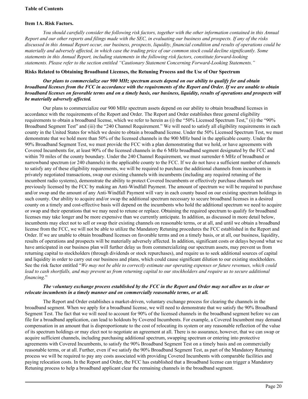 Item 1A. Risk Factors. You should carefully consider the following risk factors, together with the other information contained in this Annual Report and our other reports and filings made with the SEC, in evaluating our business and prospects. If any of the risks discussed in this Annual Report occur, our business, prospects, liquidity, financial condition and results of operations could be materially and adversely affected, in which case the trading price of our common stock could decline significantly. Some statements in this Annual Report, including statements in the following risk factors, constitute forward-looking statements. Please refer to the section entitled “Cautionary Statement Concerning Forward-Looking Statements.” Risks Related to Obtaining Broadband Licenses, the Retuning Process and the Use of Our Spectrum Our plans to commercialize our 900 MHz spectrum assets depend on our ability to qualify for and obtain broadband licenses from the FCC in accordance with the requirements of the Report and Order. If we are unable to obtain broadband licenses on favorable terms and on a timely basis, our business, liquidity, results of operations and prospects will be materially adversely affected. Our plans to commercialize our 900 MHz spectrum assets depend on our ability to obtain broadband licenses in accordance with the requirements of the Report and Order. The Report and Order establishes three general eligibility requirements to obtain a broadband license, which we refer to herein as (i) the “50% Licensed Spectrum Test,” (ii) the “90% Broadband Segment Test” and (iii) the “240 Channel Requirement.” We will need to satisfy all eligibility requirements in each county in the United States for which we desire to obtain a broadband license. Under the 50% Licensed Spectrum Test, we must demonstrate that we hold more than 50% of the licensed channels in the 900 MHz band in the applicable county. Under the 90% Broadband Segment Test, we must provide the FCC with a plan demonstrating that we hold, or have agreements with Covered Incumbents for, at least 90% of the licensed channels in the 6 MHz broadband segment designated by the FCC and within 70 miles of the county boundary. Under the 240 Channel Requirement, we must surrender 6 MHz of broadband or narrowband spectrum (or 240 channels) in the applicable county to the FCC. If we do not have a sufficient number of channels to satisfy any of these eligibility requirements, we will be required to purchase the additional channels from incumbents in privately negotiated transactions, swap our existing channels with incumbents (including any required retuning of the incumbent radio systems), demonstrate the ability to protect Covered Incumbents or effectively purchase channels not previously licensed by the FCC by making an Anti-Windfall Payment. The amount of spectrum we will be required to purchase and/or swap and the amount of any Anti-Windfall Payment will vary in each county based on our existing spectrum holdings in such county. Our ability to acquire and/or swap the additional spectrum necessary to secure broadband licenses in a desired county on a timely and cost-effective basis will depend on the incumbents who hold the additional spectrum we need to acquire or swap and their operations that we may need to retune or replace. Obtaining the required spectrum to qualify for broadband licenses may take longer and be more expensive than we currently anticipate. In addition, as discussed in more detail below, incumbents may elect not to sell or swap their existing channels on reasonable terms, or at all, and until we obtain a broadband license from the FCC, we will not be able to utilize the Mandatory Retuning procedures the FCC established in the Report and Order. If we are unable to obtain broadband licenses on favorable terms and on a timely basis, or at all, our business, liquidity, results of operations and prospects will be materially adversely affected. In addition, significant costs or delays beyond what we have anticipated in our business plan will further delay us from commercializing our spectrum assets, may prevent us from returning capital to stockholders (through dividends or stock repurchases), and require us to seek additional sources of capital and liquidity in order to carry out our business and plans, which could cause significant dilution to our existing stockholders. See the risk factor entitled “We may not be able to correctly estimate our operating expenses or future revenues, which could lead to cash shortfalls, and may prevent us from returning capital to our stockholders and require us to secure additional financing.” The voluntary exchange process established by the FCC in the Report and Order may not allow us to clear or relocate incumbents in a timely manner and on commercially reasonable terms, or at all. The Report and Order establishes a market-driven, voluntary exchange process for clearing the channels in the broadband segment. When we apply for a broadband license, we will need to demonstrate that we satisfy the 90% Broadband Segment Test. The fact that we will need to account for 90% of the licensed channels in the broadband segment before we can file for a broadband application, can lead to holdouts by Covered Incumbents. For example, a Covered Incumbent may demand compensation in an amount that is disproportionate to the cost of relocating its system or any reasonable reflection of the value of its spectrum holdings or may elect not to negotiate an agreement at all. There is no assurance, however, that we can swap or acquire sufficient channels, including purchasing additional spectrum, swapping spectrum or entering into protective agreements with Covered Incumbents, to satisfy the 90% Broadband Segment Test on a timely basis and on commercially reasonable terms, or at all. Further, even if we satisfy the 90% Broadband Segment Test, as part of the Mandatory Retuning process we will b