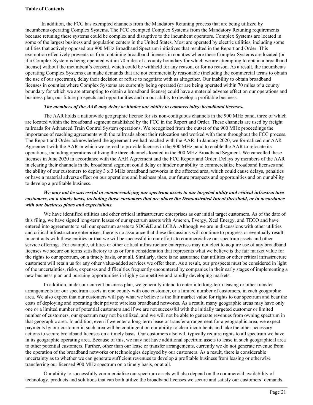In addition, the FCC has exempted channels from the Mandatory Retuning process that are being utilized by incumbents operating Complex Systems. The FCC exempted Complex Systems from the Mandatory Retuning requirements because retuning these systems could be complex and disruptive to the incumbent operators. Complex Systems are located in some of the largest business and population centers in the United States. Most are operated by electric utilities, including some utilities that actively opposed our 900 MHz Broadband Spectrum initiatives that resulted in the Report and Order. This exemption effectively prevents us from obtaining broadband licenses in counties where these Complex Systems are located (or if a Complex System is being operated within 70 miles of a county boundary for which we are attempting to obtain a broadband license) without the incumbent’s consent, which could be withheld for any reason, or for no reason. As a result, the incumbents operating Complex Systems can make demands that are not commercially reasonable (including the commercial terms to obtain the use of our spectrum), delay their decision or refuse to negotiate with us altogether. Our inability to obtain broadband licenses in counties where Complex Systems are currently being operated (or are being operated within 70 miles of a county boundary for which we are attempting to obtain a broadband license) could have a material adverse effect on our operations and business plan, our future prospects and opportunities and on our ability to develop a profitable business. The members of the AAR may delay or hinder our ability to commercialize broadband licenses. The AAR holds a nationwide geographic license for six non-contiguous channels in the 900 MHz band, three of which are located within the broadband segment established by the FCC in the Report and Order. These channels are used by freight railroads for Advanced Train Control System operations. We recognized from the outset of the 900 MHz proceedings the importance of reaching agreements with the railroads about their relocation and worked with them throughout the FCC process. The Report and Order acknowledged the agreement we had reached with the AAR. In January 2020, we formalized our AAR Agreement with the AAR in which we agreed to provide licenses in the 900 MHz band to enable the AAR to relocate its operations, including operations utilizing the three channels located in the 900 MHz Broadband Segment. We cancelled these licenses in June 2020 in accordance with the AAR Agreement and the FCC Report and Order. Delays by members of the AAR in clearing their channels in the broadband segment could delay or hinder our ability to commercialize broadband licenses and the ability of our customers to deploy 3 x 3 MHz broadband networks in the affected area, which could cause delays, penalties or have a material adverse effect on our operations and business plan, our future prospects and opportunities and on our ability to develop a profitable business. We may not be successful in commercializing our spectrum assets to our targeted utility and critical infrastructure customers, on a timely basis, including those customers that are above the Demonstrated Intent threshold, or in accordance with our business plans and expectations. We have identified utilities and other critical infrastructure enterprises as our initial target customers. As of the date of this filing, we have signed long-term leases of our spectrum assets with Ameren, Evergy, Xcel Energy, and TECO and have entered into agreements to sell our spectrum assets to SDG&E and LCRA. Although we are in discussions with other utilities and critical infrastructure enterprises, there is no assurance that these discussions will continue to progress or eventually result in contracts with these entities or that we will be successful in our efforts to commercialize our spectrum assets and other service offerings. For example, utilities or other critical infrastructure enterprises may not elect to acquire use of any broadband licenses we secure on terms satisfactory to us or for a consideration that represents what we believe is the fair market value for the rights to our spectrum, on a timely basis, or at all. Similarly, there is no assurance that utilities or other critical infrastructure customers will retain us for any other value-added services we offer them. As a result, our prospects must be considered in light of the uncertainties, risks, expenses and difficulties frequently encountered by companies in their early stages of implementing a new business plan and pursuing opportunities in highly competitive and rapidly developing markets. In addition, under our current business plan, we generally intend to enter into long-term leasing or other transfer arrangements for our spectrum assets in one county with one customer, or a limited number of customers, in each geographic area. We also expect that our customers will pay what we believe is the fair market value for rights to our spectrum and bear the costs of deploying and operating their private wireless broadband networks. As a result, many geographic areas may have only one or a limited number of potential customers and if we are not successful with the initially targeted customer or limited number of customers, our spectrum may not be utilized, and we will not be able to generate revenues from owning spectrum in that geographic area. In addition, even if we enter a long-term lease or transfer arrangement for a geographic area, we expect payments by our customer in such area will be contingent on our ability to clear incumbents and take the other necessary actions to secure broadband licenses on a timely basis. Our customers also will typically require rights to all spectrum we have in its geographic operating area. Because of this, we may not have additional spectrum assets to lease in such geographical area to other potential customers. Further, other than 