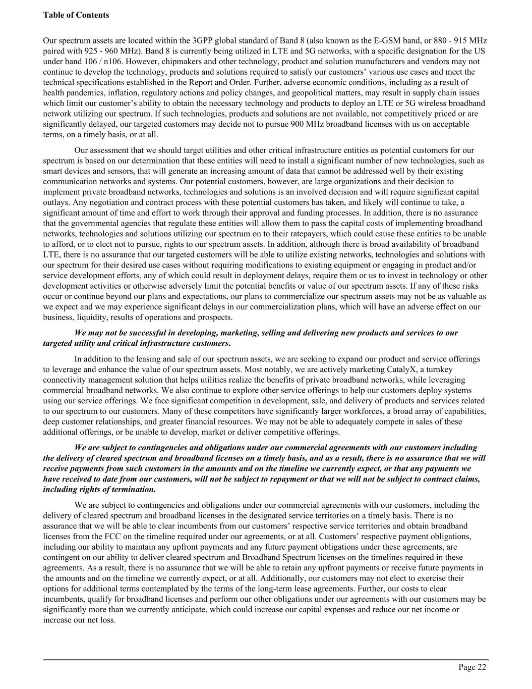 Our spectrum assets are located within the 3GPP global standard of Band 8 (also known as the E-GSM band, or 880 - 915 MHz paired with 925 - 960 MHz). Band 8 is currently being utilized in LTE and 5G networks, with a specific designation for the US under band 106 / n106. However, chipmakers and other technology, product and solution manufacturers and vendors may not continue to develop the technology, products and solutions required to satisfy our customers’ various use cases and meet the technical specifications established in the Report and Order. Further, adverse economic conditions, including as a result of health pandemics, inflation, regulatory actions and policy changes, and geopolitical matters, may result in supply chain issues which limit our customer’s ability to obtain the necessary technology and products to deploy an LTE or 5G wireless broadband network utilizing our spectrum. If such technologies, products and solutions are not available, not competitively priced or are significantly delayed, our targeted customers may decide not to pursue 900 MHz broadband licenses with us on acceptable terms, on a timely basis, or at all. Our assessment that we should target utilities and other critical infrastructure entities as potential customers for our spectrum is based on our determination that these entities will need to install a significant number of new technologies, such as smart devices and sensors, that will generate an increasing amount of data that cannot be addressed well by their existing communication networks and systems. Our potential customers, however, are large organizations and their decision to implement private broadband networks, technologies and solutions is an involved decision and will require significant capital outlays. Any negotiation and contract process with these potential customers has taken, and likely will continue to take, a significant amount of time and effort to work through their approval and funding processes. In addition, there is no assurance that the governmental agencies that regulate these entities will allow them to pass the capital costs of implementing broadband networks, technologies and solutions utilizing our spectrum on to their ratepayers, which could cause these entities to be unable to afford, or to elect not to pursue, rights to our spectrum assets. In addition, although there is broad availability of broadband LTE, there is no assurance that our targeted customers will be able to utilize existing networks, technologies and solutions with our spectrum for their desired use cases without requiring modifications to existing equipment or engaging in product and/or service development efforts, any of which could result in deployment delays, require them or us to invest in technology or other development activities or otherwise adversely limit the potential benefits or value of our spectrum assets. If any of these risks occur or continue beyond our plans and expectations, our plans to commercialize our spectrum assets may not be as valuable as we expect and we may experience significant delays in our commercialization plans, which will have an adverse effect on our business, liquidity, results of operations and prospects. We may not be successful in developing, marketing, selling and delivering new products and services to our targeted utility and critical infrastructure customers. In addition to the leasing and sale of our spectrum assets, we are seeking to expand our product and service offerings to leverage and enhance the value of our spectrum assets. Most notably, we are actively marketing CatalyX, a turnkey connectivity management solution that helps utilities realize the benefits of private broadband networks, while leveraging commercial broadband networks. We also continue to explore other service offerings to help our customers deploy systems using our service offerings. We face significant competition in development, sale, and delivery of products and services related to our spectrum to our customers. Many of these competitors have significantly larger workforces, a broad array of capabilities, deep customer relationships, and greater financial resources. We may not be able to adequately compete in sales of these additional offerings, or be unable to develop, market or deliver competitive offerings. We are subject to contingencies and obligations under our commercial agreements with our customers including the delivery of cleared spectrum and broadband licenses on a timely basis, and as a result, there is no assurance that we will receive payments from such customers in the amounts and on the timeline we currently expect, or that any payments we have received to date from our customers, will not be subject to repayment or that we will not be subject to contract claims, including rights of termination. We are subject to contingencies and obligations under our commercial agreements with our customers, including the delivery of cleared spectrum and broadband licenses in the designated service territories on a timely basis. There is no assurance that we will be able to clear incumbents from our customers’ respective service territories and obtain broadband licenses from the FCC on the timeline required under our agreements, or at all. Customers’ respective payment obligations, including our ability to maintain any upfront payments and any future payment obligations under these agreements, are contingent on our ability to deliver cleared spectrum and Broadband Spectrum licenses on the timelines required in these agreements. As a result, there is no assurance that we will be able to retain any upfront payments or receive future payments in the amounts and on the timeline we currently expect, or at all. Additionally, our customers may not elect to exercise their options for additional terms contemplated by the terms of the long-term lease agreements. Further, our costs to clear incumbents, qualify for broadband licenses an