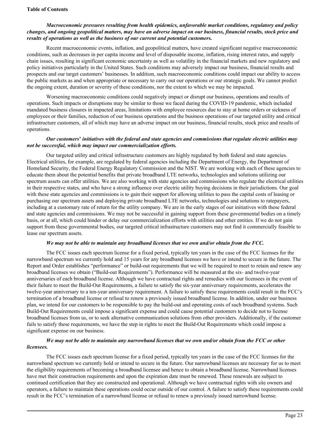 Macroeconomic pressures resulting from health epidemics, unfavorable market conditions, regulatory and policy changes, and ongoing geopolitical matters, may have an adverse impact on our business, financial results, stock price and results of operations as well as the business of our current and potential customers. Recent macroeconomic events, inflation, and geopolitical matters, have created significant negative macroeconomic conditions, such as decreases in per capita income and level of disposable income, inflation, rising interest rates, and supply chain issues, resulting in significant economic uncertainty as well as volatility in the financial markets and new regulatory and policy initiatives particularly in the United States. Such conditions may adversely impact our business, financial results and prospects and our target customers’ businesses. In addition, such macroeconomic conditions could impact our ability to access the public markets as and when appropriate or necessary to carry out our operations or our strategic goals. We cannot predict the ongoing extent, duration or severity of these conditions, nor the extent to which we may be impacted. Worsening macroeconomic conditions could negatively impact or disrupt our business, operations and results of operations. Such impacts or disruptions may be similar to those we faced during the COVID-19 pandemic, which included mandated business closures in impacted areas, limitations with employee resources due to stay at home orders or sickness of employees or their families, reduction of our business operations and the business operations of our targeted utility and critical infrastructure customers, all of which may have an adverse impact on our business, financial results, stock price and results of operations. Our customers’ initiatives with the federal and state agencies and commissions that regulate electric utilities may not be successful, which may impact our commercialization efforts. Our targeted utility and critical infrastructure customers are highly regulated by both federal and state agencies. Electrical utilities, for example, are regulated by federal agencies including the Department of Energy, the Department of Homeland Security, the Federal Energy Regulatory Commission and the NIST. We are working with each of these agencies to educate them about the potential benefits that private broadband LTE networks, technologies and solutions utilizing our spectrum assets can offer utilities. We are also working with state agencies and commissions who regulate the electrical utilities in their respective states, and who have a strong influence over electric utility buying decisions in their jurisdictions. Our goal with these state agencies and commissions is to gain their support for allowing utilities to pass the capital costs of leasing or purchasing our spectrum assets and deploying private broadband LTE networks, technologies and solutions to ratepayers, including at a customary rate of return for the utility company. We are in the early stages of our initiatives with these federal and state agencies and commissions. We may not be successful in gaining support from these governmental bodies on a timely basis, or at all, which could hinder or delay our commercialization efforts with utilities and other entities. If we do not gain support from these governmental bodies, our targeted critical infrastructure customers may not find it commercially feasible to lease our spectrum assets. We may not be able to maintain any broadband licenses that we own and/or obtain from the FCC. The FCC issues each spectrum license for a fixed period, typically ten years in the case of the FCC licenses for the narrowband spectrum we currently hold and 15 years for any broadband licenses we have or intend to secure in the future. The Report and Order establishes “performance” or build-out requirements that we will be required to meet to retain and renew any broadband licenses we obtain (“Build-out Requirements”). Performance will be measured at the six- and twelve-year anniversaries of each broadband license. Although we have contractual rights and remedies with our licensees in the event of their failure to meet the Build-Out Requirements, a failure to satisfy the six-year anniversary requirements, accelerates the twelve-year anniversary to a ten-year anniversary requirement. A failure to satisfy these requirements could result in the FCC’s termination of a broadband license or refusal to renew a previously issued broadband license. In addition, under our business plan, we intend for our customers to be responsible to pay the build-out and operating costs of such broadband systems. Such Build-Out Requirements could impose a significant expense and could cause potential customers to decide not to license broadband licenses from us, or to seek alternative communication solutions from other providers. Additionally, if the customer fails to satisfy these requirements, we have the step in rights to meet the Build-Out Requirements which could impose a significant expense on our business. We may not be able to maintain any narrowband licenses that we own and/or obtain from the FCC or other licensees. The FCC issues each spectrum license for a fixed period, typically ten years in the case of the FCC licenses for the narrowband spectrum we currently hold or intend to secure in the future. Our narrowband licenses are necessary for us to meet the eligibility requirements of becoming a broadband licensee and hence to obtain a broadband license. Narrowband licenses have met their construction requirements and upon the expiration date must be renewed. These renewals are subject to continued certification that they are constructed and operational. Although we have contractual rights with site owners and operators, a failure to maintain these operations could occur outside of our control. A failure to satisfy these requirements could result in the