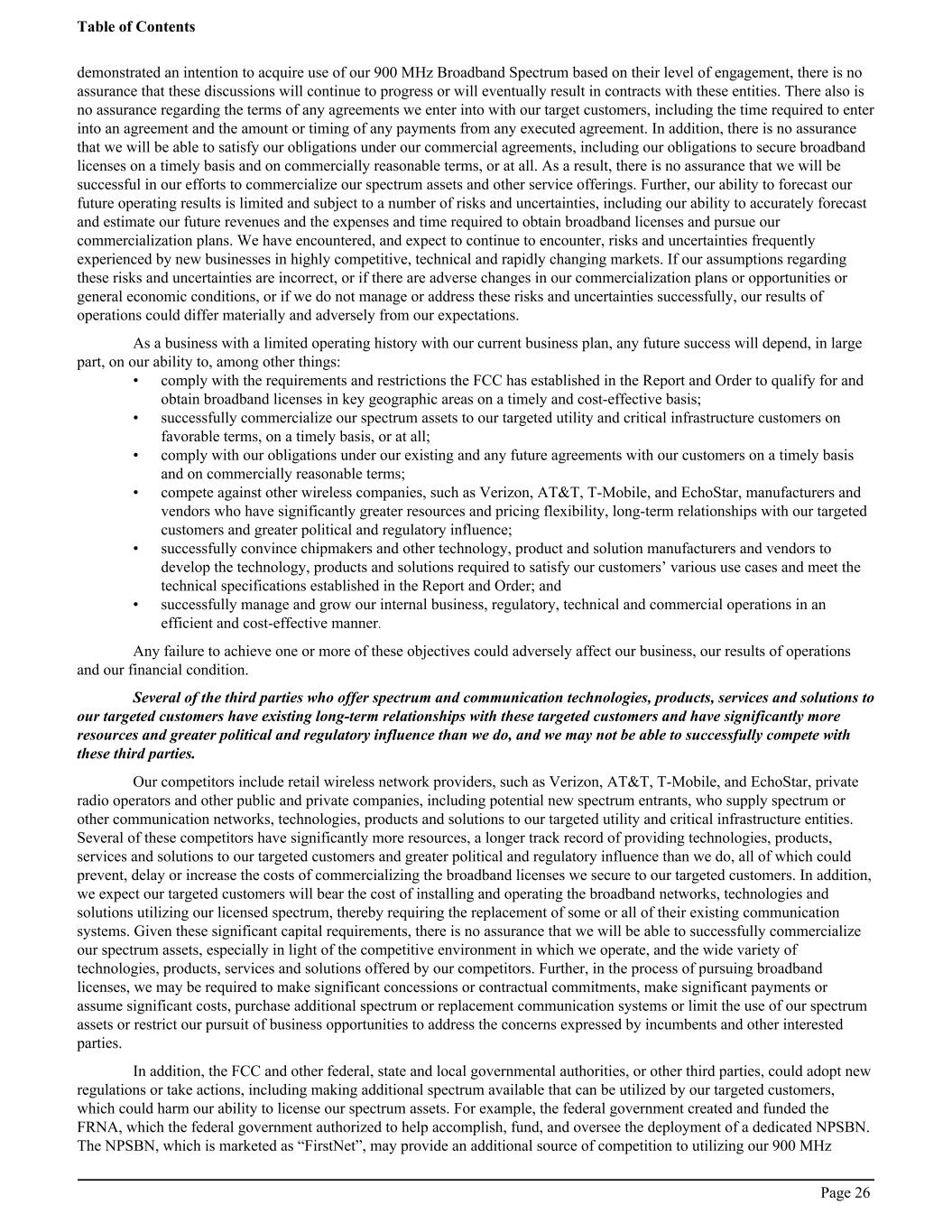 demonstrated an intention to acquire use of our 900 MHz Broadband Spectrum based on their level of engagement, there is no assurance that these discussions will continue to progress or will eventually result in contracts with these entities. There also is no assurance regarding the terms of any agreements we enter into with our target customers, including the time required to enter into an agreement and the amount or timing of any payments from any executed agreement. In addition, there is no assurance that we will be able to satisfy our obligations under our commercial agreements, including our obligations to secure broadband licenses on a timely basis and on commercially reasonable terms, or at all. As a result, there is no assurance that we will be successful in our efforts to commercialize our spectrum assets and other service offerings. Further, our ability to forecast our future operating results is limited and subject to a number of risks and uncertainties, including our ability to accurately forecast and estimate our future revenues and the expenses and time required to obtain broadband licenses and pursue our commercialization plans. We have encountered, and expect to continue to encounter, risks and uncertainties frequently experienced by new businesses in highly competitive, technical and rapidly changing markets. If our assumptions regarding these risks and uncertainties are incorrect, or if there are adverse changes in our commercialization plans or opportunities or general economic conditions, or if we do not manage or address these risks and uncertainties successfully, our results of operations could differ materially and adversely from our expectations. As a business with a limited operating history with our current business plan, any future success will depend, in large part, on our ability to, among other things: • comply with the requirements and restrictions the FCC has established in the Report and Order to qualify for and obtain broadband licenses in key geographic areas on a timely and cost-effective basis; • successfully commercialize our spectrum assets to our targeted utility and critical infrastructure customers on favorable terms, on a timely basis, or at all; • comply with our obligations under our existing and any future agreements with our customers on a timely basis and on commercially reasonable terms; • compete against other wireless companies, such as Verizon, AT&T, T-Mobile, and EchoStar, manufacturers and vendors who have significantly greater resources and pricing flexibility, long-term relationships with our targeted customers and greater political and regulatory influence; • successfully convince chipmakers and other technology, product and solution manufacturers and vendors to develop the technology, products and solutions required to satisfy our customers’ various use cases and meet the technical specifications established in the Report and Order; and • successfully manage and grow our internal business, regulatory, technical and commercial operations in an efficient and cost-effective manner. Any failure to achieve one or more of these objectives could adversely affect our business, our results of operations and our financial condition. Several of the third parties who offer spectrum and communication technologies, products, services and solutions to our targeted customers have existing long-term relationships with these targeted customers and have significantly more resources and greater political and regulatory influence than we do, and we may not be able to successfully compete with these third parties. Our competitors include retail wireless network providers, such as Verizon, AT&T, T-Mobile, and EchoStar, private radio operators and other public and private companies, including potential new spectrum entrants, who supply spectrum or other communication networks, technologies, products and solutions to our targeted utility and critical infrastructure entities. Several of these competitors have significantly more resources, a longer track record of providing technologies, products, services and solutions to our targeted customers and greater political and regulatory influence than we do, all of which could prevent, delay or increase the costs of commercializing the broadband licenses we secure to our targeted customers. In addition, we expect our targeted customers will bear the cost of installing and operating the broadband networks, technologies and solutions utilizing our licensed spectrum, thereby requiring the replacement of some or all of their existing communication systems. Given these significant capital requirements, there is no assurance that we will be able to successfully commercialize our spectrum assets, especially in light of the competitive environment in which we operate, and the wide variety of technologies, products, services and solutions offered by our competitors. Further, in the process of pursuing broadband licenses, we may be required to make significant concessions or contractual commitments, make significant payments or assume significant costs, purchase additional spectrum or replacement communication systems or limit the use of our spectrum assets or restrict our pursuit of business opportunities to address the concerns expressed by incumbents and other interested parties. In addition, the FCC and other federal, state and local governmental authorities, or other third parties, could adopt new regulations or take actions, including making additional spectrum available that can be utilized by our targeted customers, which could harm our ability to license our spectrum assets. For example, the federal government created and funded the FRNA, which the federal government authorized to help accomplish, fund, and oversee the deployment of a dedicated NPSBN. The NPSBN, which is marketed as “FirstNet”, may provide an additional source of competition to utilizing our 900 MHz Table of Contents Page 26