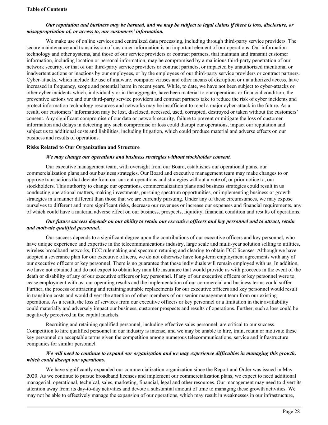 Our reputation and business may be harmed, and we may be subject to legal claims if there is loss, disclosure, or misappropriation of, or access to, our customers’ information. We make use of online services and centralized data processing, including through third-party service providers. The secure maintenance and transmission of customer information is an important element of our operations. Our information technology and other systems, and those of our service providers or contract partners, that maintain and transmit customer information, including location or personal information, may be compromised by a malicious third-party penetration of our network security, or that of our third-party service providers or contract partners, or impacted by unauthorized intentional or inadvertent actions or inactions by our employees, or by the employees of our third-party service providers or contract partners. Cyber-attacks, which include the use of malware, computer viruses and other means of disruption or unauthorized access, have increased in frequency, scope and potential harm in recent years. While, to date, we have not been subject to cyber-attacks or other cyber incidents which, individually or in the aggregate, have been material to our operations or financial condition, the preventive actions we and our third-party service providers and contract partners take to reduce the risk of cyber incidents and protect information technology resources and networks may be insufficient to repel a major cyber-attack in the future. As a result, our customers’ information may be lost, disclosed, accessed, used, corrupted, destroyed or taken without the customers’ consent. Any significant compromise of our data or network security, failure to prevent or mitigate the loss of customer information and delays in detecting any such compromise or loss could disrupt our operations, impact our reputation and subject us to additional costs and liabilities, including litigation, which could produce material and adverse effects on our business and results of operations. Risks Related to Our Organization and Structure We may change our operations and business strategies without stockholder consent. Our executive management team, with oversight from our Board, establishes our operational plans, our commercialization plans and our business strategies. Our Board and executive management team may make changes to or approve transactions that deviate from our current operations and strategies without a vote of, or prior notice to, our stockholders. This authority to change our operations, commercialization plans and business strategies could result in us conducting operational matters, making investments, pursuing spectrum opportunities, or implementing business or growth strategies in a manner different than those that we are currently pursuing. Under any of these circumstances, we may expose ourselves to different and more significant risks, decrease our revenues or increase our expenses and financial requirements, any of which could have a material adverse effect on our business, prospects, liquidity, financial condition and results of operations. Our future success depends on our ability to retain our executive officers and key personnel and to attract, retain and motivate qualified personnel. Our success depends to a significant degree upon the contributions of our executive officers and key personnel, who have unique experience and expertise in the telecommunications industry, large scale and multi-year solution selling to utilities, wireless broadband networks, FCC rulemaking and spectrum retuning and clearing to obtain FCC licenses. Although we have adopted a severance plan for our executive officers, we do not otherwise have long-term employment agreements with any of our executive officers or key personnel. There is no guarantee that these individuals will remain employed with us. In addition, we have not obtained and do not expect to obtain key man life insurance that would provide us with proceeds in the event of the death or disability of any of our executive officers or key personnel. If any of our executive officers or key personnel were to cease employment with us, our operating results and the implementation of our commercial and business terms could suffer. Further, the process of attracting and retaining suitable replacements for our executive officers and key personnel would result in transition costs and would divert the attention of other members of our senior management team from our existing operations. As a result, the loss of services from our executive officers or key personnel or a limitation in their availability could materially and adversely impact our business, customer prospects and results of operations. Further, such a loss could be negatively perceived in the capital markets. Recruiting and retaining qualified personnel, including effective sales personnel, are critical to our success. Competition to hire qualified personnel in our industry is intense, and we may be unable to hire, train, retain or motivate these key personnel on acceptable terms given the competition among numerous telecommunications, service and infrastructure companies for similar personnel. We will need to continue to expand our organization and we may experience difficulties in managing this growth, which could disrupt our operations. We have significantly expanded our commercialization organization since the Report and Order was issued in May 2020. As we continue to pursue broadband licenses and implement our commercialization plans, we expect to need additional managerial, operational, technical, sales, marketing, financial, legal and other resources. Our management may need to divert its attention away from its day-to-day activities and devote a substantial amount of time to managing these growth activities. We may not be able to effectively manage the expansion of our operations, which may result in weak