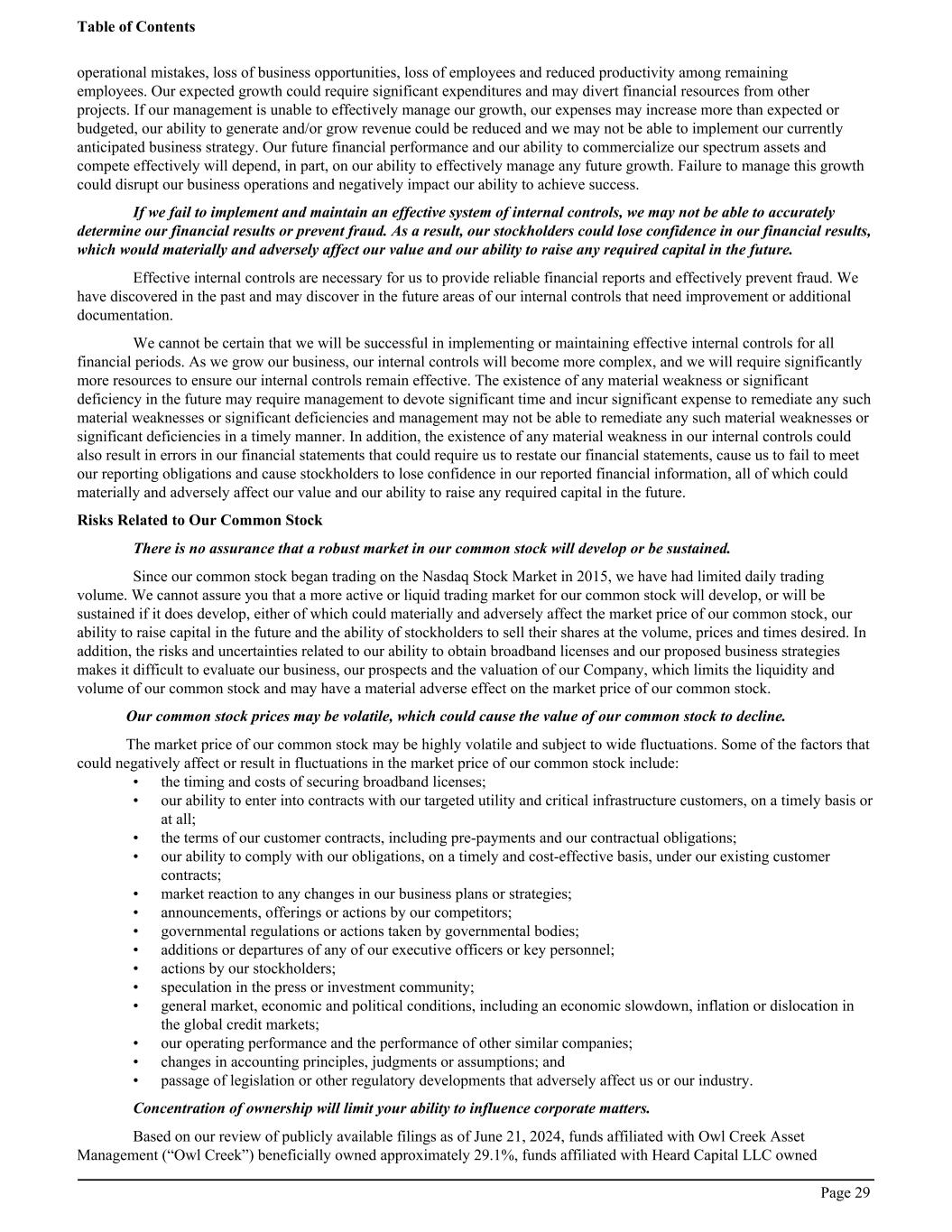 operational mistakes, loss of business opportunities, loss of employees and reduced productivity among remaining employees. Our expected growth could require significant expenditures and may divert financial resources from other projects. If our management is unable to effectively manage our growth, our expenses may increase more than expected or budgeted, our ability to generate and/or grow revenue could be reduced and we may not be able to implement our currently anticipated business strategy. Our future financial performance and our ability to commercialize our spectrum assets and compete effectively will depend, in part, on our ability to effectively manage any future growth. Failure to manage this growth could disrupt our business operations and negatively impact our ability to achieve success. If we fail to implement and maintain an effective system of internal controls, we may not be able to accurately determine our financial results or prevent fraud. As a result, our stockholders could lose confidence in our financial results, which would materially and adversely affect our value and our ability to raise any required capital in the future. Effective internal controls are necessary for us to provide reliable financial reports and effectively prevent fraud. We have discovered in the past and may discover in the future areas of our internal controls that need improvement or additional documentation. We cannot be certain that we will be successful in implementing or maintaining effective internal controls for all financial periods. As we grow our business, our internal controls will become more complex, and we will require significantly more resources to ensure our internal controls remain effective. The existence of any material weakness or significant deficiency in the future may require management to devote significant time and incur significant expense to remediate any such material weaknesses or significant deficiencies and management may not be able to remediate any such material weaknesses or significant deficiencies in a timely manner. In addition, the existence of any material weakness in our internal controls could also result in errors in our financial statements that could require us to restate our financial statements, cause us to fail to meet our reporting obligations and cause stockholders to lose confidence in our reported financial information, all of which could materially and adversely affect our value and our ability to raise any required capital in the future. Risks Related to Our Common Stock There is no assurance that a robust market in our common stock will develop or be sustained. Since our common stock began trading on the Nasdaq Stock Market in 2015, we have had limited daily trading volume. We cannot assure you that a more active or liquid trading market for our common stock will develop, or will be sustained if it does develop, either of which could materially and adversely affect the market price of our common stock, our ability to raise capital in the future and the ability of stockholders to sell their shares at the volume, prices and times desired. In addition, the risks and uncertainties related to our ability to obtain broadband licenses and our proposed business strategies makes it difficult to evaluate our business, our prospects and the valuation of our Company, which limits the liquidity and volume of our common stock and may have a material adverse effect on the market price of our common stock. Our common stock prices may be volatile, which could cause the value of our common stock to decline. The market price of our common stock may be highly volatile and subject to wide fluctuations. Some of the factors that could negatively affect or result in fluctuations in the market price of our common stock include: • the timing and costs of securing broadband licenses; • our ability to enter into contracts with our targeted utility and critical infrastructure customers, on a timely basis or at all; • the terms of our customer contracts, including pre-payments and our contractual obligations; • our ability to comply with our obligations, on a timely and cost-effective basis, under our existing customer contracts; • market reaction to any changes in our business plans or strategies; • announcements, offerings or actions by our competitors; • governmental regulations or actions taken by governmental bodies; • additions or departures of any of our executive officers or key personnel; • actions by our stockholders; • speculation in the press or investment community; • general market, economic and political conditions, including an economic slowdown, inflation or dislocation in the global credit markets; • our operating performance and the performance of other similar companies; • changes in accounting principles, judgments or assumptions; and • passage of legislation or other regulatory developments that adversely affect us or our industry. Concentration of ownership will limit your ability to influence corporate matters. Based on our review of publicly available filings as of June 21, 2024, funds affiliated with Owl Creek Asset Management (“Owl Creek”) beneficially owned approximately 29.1%, funds affiliated with Heard Capital LLC owned Table of Contents Page 29