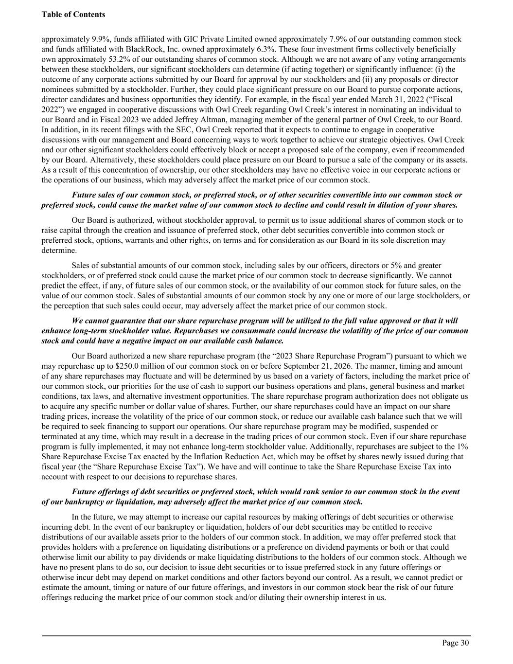 approximately 9.9%, funds affiliated with GIC Private Limited owned approximately 7.9% of our outstanding common stock and funds affiliated with BlackRock, Inc. owned approximately 6.3%. These four investment firms collectively beneficially own approximately 53.2% of our outstanding shares of common stock. Although we are not aware of any voting arrangements between these stockholders, our significant stockholders can determine (if acting together) or significantly influence: (i) the outcome of any corporate actions submitted by our Board for approval by our stockholders and (ii) any proposals or director nominees submitted by a stockholder. Further, they could place significant pressure on our Board to pursue corporate actions, director candidates and business opportunities they identify. For example, in the fiscal year ended March 31, 2022 (“Fiscal 2022”) we engaged in cooperative discussions with Owl Creek regarding Owl Creek’s interest in nominating an individual to our Board and in Fiscal 2023 we added Jeffrey Altman, managing member of the general partner of Owl Creek, to our Board. In addition, in its recent filings with the SEC, Owl Creek reported that it expects to continue to engage in cooperative discussions with our management and Board concerning ways to work together to achieve our strategic objectives. Owl Creek and our other significant stockholders could effectively block or accept a proposed sale of the company, even if recommended by our Board. Alternatively, these stockholders could place pressure on our Board to pursue a sale of the company or its assets. As a result of this concentration of ownership, our other stockholders may have no effective voice in our corporate actions or the operations of our business, which may adversely affect the market price of our common stock. Future sales of our common stock, or preferred stock, or of other securities convertible into our common stock or preferred stock, could cause the market value of our common stock to decline and could result in dilution of your shares. Our Board is authorized, without stockholder approval, to permit us to issue additional shares of common stock or to raise capital through the creation and issuance of preferred stock, other debt securities convertible into common stock or preferred stock, options, warrants and other rights, on terms and for consideration as our Board in its sole discretion may determine. Sales of substantial amounts of our common stock, including sales by our officers, directors or 5% and greater stockholders, or of preferred stock could cause the market price of our common stock to decrease significantly. We cannot predict the effect, if any, of future sales of our common stock, or the availability of our common stock for future sales, on the value of our common stock. Sales of substantial amounts of our common stock by any one or more of our large stockholders, or the perception that such sales could occur, may adversely affect the market price of our common stock. We cannot guarantee that our share repurchase program will be utilized to the full value approved or that it will enhance long-term stockholder value. Repurchases we consummate could increase the volatility of the price of our common stock and could have a negative impact on our available cash balance. Our Board authorized a new share repurchase program (the “2023 Share Repurchase Program”) pursuant to which we may repurchase up to $250.0 million of our common stock on or before September 21, 2026. The manner, timing and amount of any share repurchases may fluctuate and will be determined by us based on a variety of factors, including the market price of our common stock, our priorities for the use of cash to support our business operations and plans, general business and market conditions, tax laws, and alternative investment opportunities. The share repurchase program authorization does not obligate us to acquire any specific number or dollar value of shares. Further, our share repurchases could have an impact on our share trading prices, increase the volatility of the price of our common stock, or reduce our available cash balance such that we will be required to seek financing to support our operations. Our share repurchase program may be modified, suspended or terminated at any time, which may result in a decrease in the trading prices of our common stock. Even if our share repurchase program is fully implemented, it may not enhance long-term stockholder value. Additionally, repurchases are subject to the 1% Share Repurchase Excise Tax enacted by the Inflation Reduction Act, which may be offset by shares newly issued during that fiscal year (the “Share Repurchase Excise Tax”). We have and will continue to take the Share Repurchase Excise Tax into account with respect to our decisions to repurchase shares. Future offerings of debt securities or preferred stock, which would rank senior to our common stock in the event of our bankruptcy or liquidation, may adversely affect the market price of our common stock. In the future, we may attempt to increase our capital resources by making offerings of debt securities or otherwise incurring debt. In the event of our bankruptcy or liquidation, holders of our debt securities may be entitled to receive distributions of our available assets prior to the holders of our common stock. In addition, we may offer preferred stock that provides holders with a preference on liquidating distributions or a preference on dividend payments or both or that could otherwise limit our ability to pay dividends or make liquidating distributions to the holders of our common stock. Although we have no present plans to do so, our decision to issue debt securities or to issue preferred stock in any future offerings or otherwise incur debt may depend on market conditions and other factors beyond our control. As a result, we cannot predict or estimate the amount, timing or nature of our 