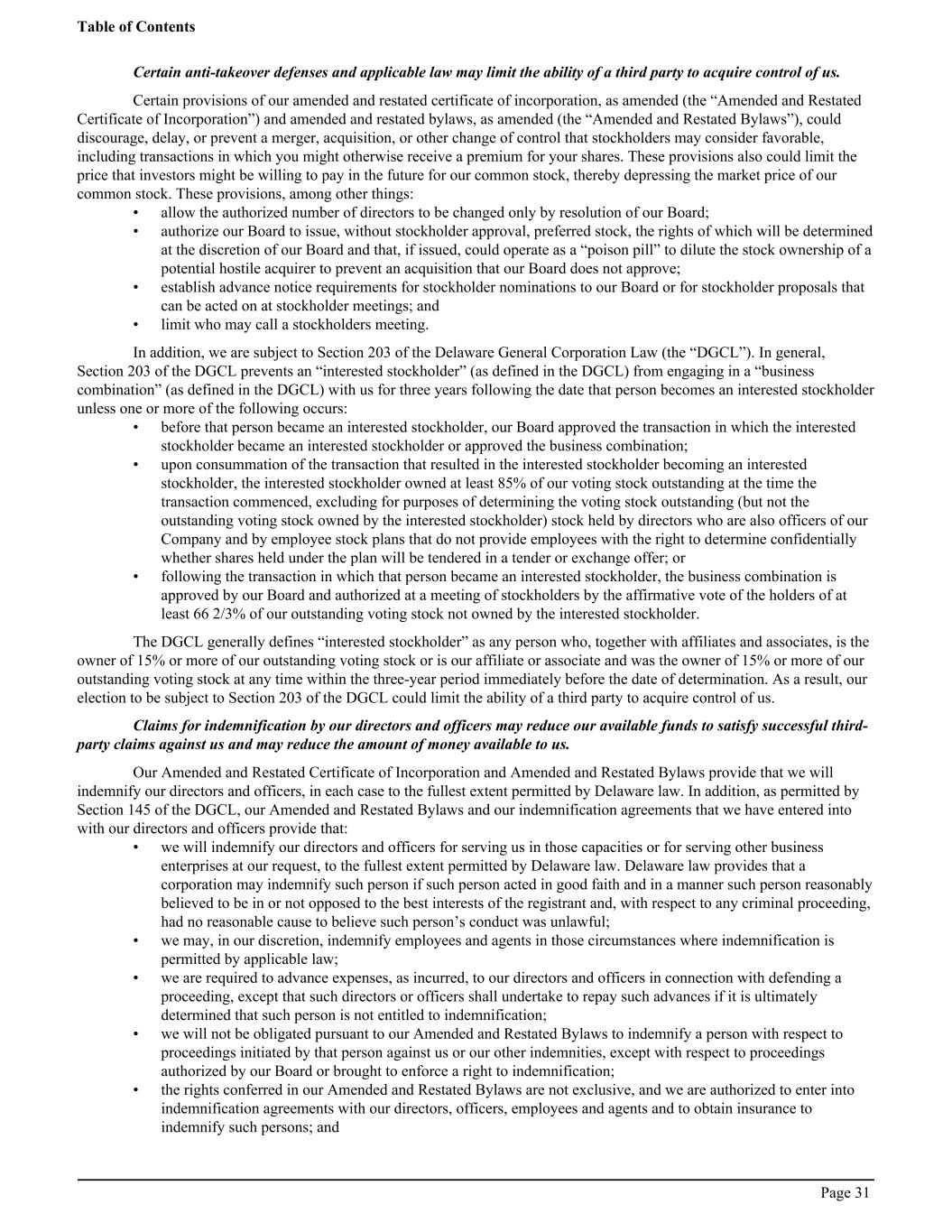Certain anti-takeover defenses and applicable law may limit the ability of a third party to acquire control of us. Certain provisions of our amended and restated certificate of incorporation, as amended (the “Amended and Restated Certificate of Incorporation”) and amended and restated bylaws, as amended (the “Amended and Restated Bylaws”), could discourage, delay, or prevent a merger, acquisition, or other change of control that stockholders may consider favorable, including transactions in which you might otherwise receive a premium for your shares. These provisions also could limit the price that investors might be willing to pay in the future for our common stock, thereby depressing the market price of our common stock. These provisions, among other things: • allow the authorized number of directors to be changed only by resolution of our Board; • authorize our Board to issue, without stockholder approval, preferred stock, the rights of which will be determined at the discretion of our Board and that, if issued, could operate as a “poison pill” to dilute the stock ownership of a potential hostile acquirer to prevent an acquisition that our Board does not approve; • establish advance notice requirements for stockholder nominations to our Board or for stockholder proposals that can be acted on at stockholder meetings; and • limit who may call a stockholders meeting. In addition, we are subject to Section 203 of the Delaware General Corporation Law (the “DGCL”). In general, Section 203 of the DGCL prevents an “interested stockholder” (as defined in the DGCL) from engaging in a “business combination” (as defined in the DGCL) with us for three years following the date that person becomes an interested stockholder unless one or more of the following occurs: • before that person became an interested stockholder, our Board approved the transaction in which the interested stockholder became an interested stockholder or approved the business combination; • upon consummation of the transaction that resulted in the interested stockholder becoming an interested stockholder, the interested stockholder owned at least 85% of our voting stock outstanding at the time the transaction commenced, excluding for purposes of determining the voting stock outstanding (but not the outstanding voting stock owned by the interested stockholder) stock held by directors who are also officers of our Company and by employee stock plans that do not provide employees with the right to determine confidentially whether shares held under the plan will be tendered in a tender or exchange offer; or • following the transaction in which that person became an interested stockholder, the business combination is approved by our Board and authorized at a meeting of stockholders by the affirmative vote of the holders of at least 66 2/3% of our outstanding voting stock not owned by the interested stockholder. The DGCL generally defines “interested stockholder” as any person who, together with affiliates and associates, is the owner of 15% or more of our outstanding voting stock or is our affiliate or associate and was the owner of 15% or more of our outstanding voting stock at any time within the three-year period immediately before the date of determination. As a result, our election to be subject to Section 203 of the DGCL could limit the ability of a third party to acquire control of us. Claims for indemnification by our directors and officers may reduce our available funds to satisfy successful third- party claims against us and may reduce the amount of money available to us. Our Amended and Restated Certificate of Incorporation and Amended and Restated Bylaws provide that we will indemnify our directors and officers, in each case to the fullest extent permitted by Delaware law. In addition, as permitted by Section 145 of the DGCL, our Amended and Restated Bylaws and our indemnification agreements that we have entered into with our directors and officers provide that: • we will indemnify our directors and officers for serving us in those capacities or for serving other business enterprises at our request, to the fullest extent permitted by Delaware law. Delaware law provides that a corporation may indemnify such person if such person acted in good faith and in a manner such person reasonably believed to be in or not opposed to the best interests of the registrant and, with respect to any criminal proceeding, had no reasonable cause to believe such person’s conduct was unlawful; • we may, in our discretion, indemnify employees and agents in those circumstances where indemnification is permitted by applicable law; • we are required to advance expenses, as incurred, to our directors and officers in connection with defending a proceeding, except that such directors or officers shall undertake to repay such advances if it is ultimately determined that such person is not entitled to indemnification; • we will not be obligated pursuant to our Amended and Restated Bylaws to indemnify a person with respect to proceedings initiated by that person against us or our other indemnities, except with respect to proceedings authorized by our Board or brought to enforce a right to indemnification; • the rights conferred in our Amended and Restated Bylaws are not exclusive, and we are authorized to enter into indemnification agreements with our directors, officers, employees and agents and to obtain insurance to indemnify such persons; and Table of Contents Page 31