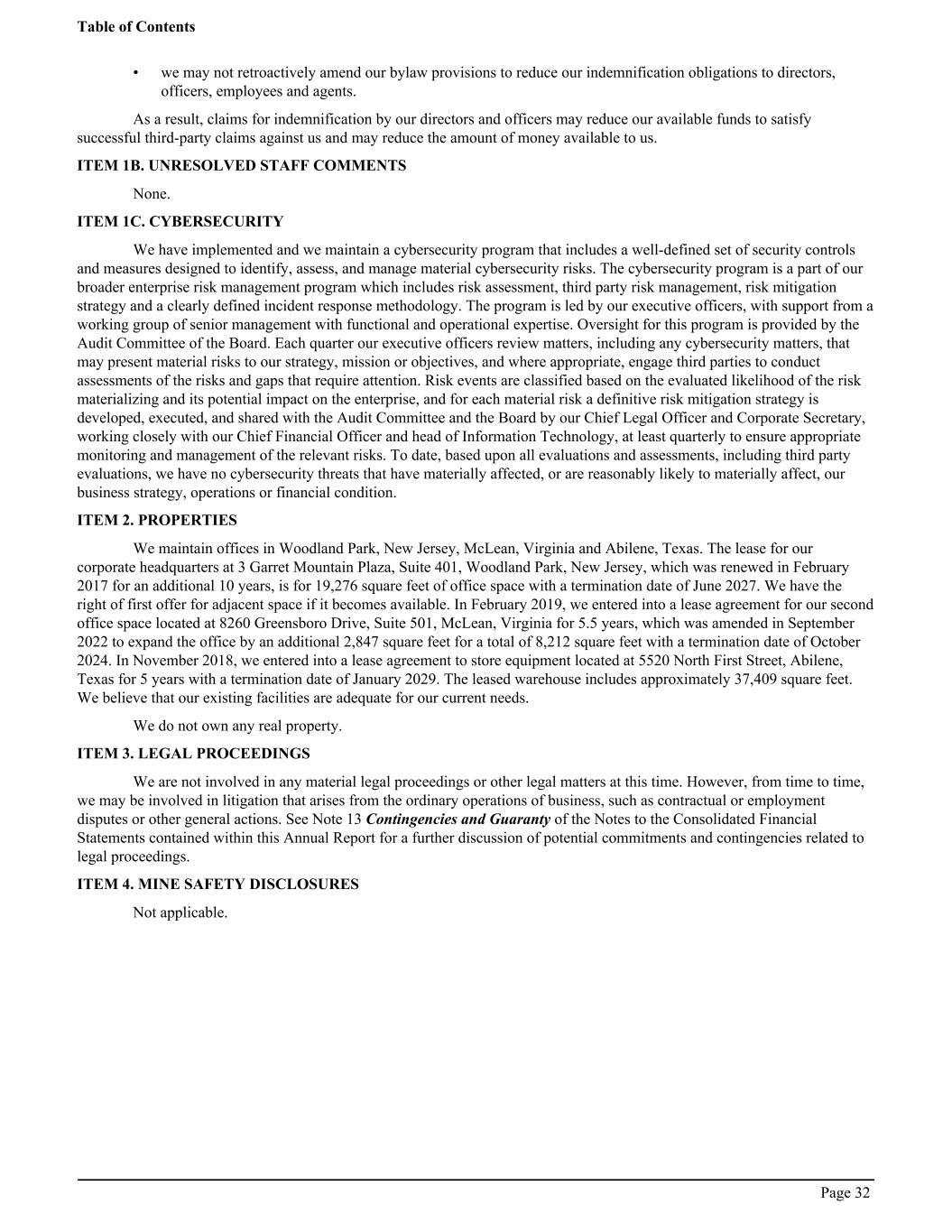 • we may not retroactively amend our bylaw provisions to reduce our indemnification obligations to directors, officers, employees and agents. As a result, claims for indemnification by our directors and officers may reduce our available funds to satisfy successful third-party claims against us and may reduce the amount of money available to us. ITEM 1B. UNRESOLVED STAFF COMMENTS None. ITEM 1C. CYBERSECURITY We have implemented and we maintain a cybersecurity program that includes a well-defined set of security controls and measures designed to identify, assess, and manage material cybersecurity risks. The cybersecurity program is a part of our broader enterprise risk management program which includes risk assessment, third party risk management, risk mitigation strategy and a clearly defined incident response methodology. The program is led by our executive officers, with support from a working group of senior management with functional and operational expertise. Oversight for this program is provided by the Audit Committee of the Board. Each quarter our executive officers review matters, including any cybersecurity matters, that may present material risks to our strategy, mission or objectives, and where appropriate, engage third parties to conduct assessments of the risks and gaps that require attention. Risk events are classified based on the evaluated likelihood of the risk materializing and its potential impact on the enterprise, and for each material risk a definitive risk mitigation strategy is developed, executed, and shared with the Audit Committee and the Board by our Chief Legal Officer and Corporate Secretary, working closely with our Chief Financial Officer and head of Information Technology, at least quarterly to ensure appropriate monitoring and management of the relevant risks. To date, based upon all evaluations and assessments, including third party evaluations, we have no cybersecurity threats that have materially affected, or are reasonably likely to materially affect, our business strategy, operations or financial condition. ITEM 2. PROPERTIES We maintain offices in Woodland Park, New Jersey, McLean, Virginia and Abilene, Texas. The lease for our corporate headquarters at 3 Garret Mountain Plaza, Suite 401, Woodland Park, New Jersey, which was renewed in February 2017 for an additional 10 years, is for 19,276 square feet of office space with a termination date of June 2027. We have the right of first offer for adjacent space if it becomes available. In February 2019, we entered into a lease agreement for our second office space located at 8260 Greensboro Drive, Suite 501, McLean, Virginia for 5.5 years, which was amended in September 2022 to expand the office by an additional 2,847 square feet for a total of 8,212 square feet with a termination date of October 2024. In November 2018, we entered into a lease agreement to store equipment located at 5520 North First Street, Abilene, Texas for 5 years with a termination date of January 2029. The leased warehouse includes approximately 37,409 square feet. We believe that our existing facilities are adequate for our current needs. We do not own any real property. ITEM 3. LEGAL PROCEEDINGS We are not involved in any material legal proceedings or other legal matters at this time. However, from time to time, we may be involved in litigation that arises from the ordinary operations of business, such as contractual or employment disputes or other general actions. See Note 13 Contingencies and Guaranty of the Notes to the Consolidated Financial Statements contained within this Annual Report for a further discussion of potential commitments and contingencies related to legal proceedings. ITEM 4. MINE SAFETY DISCLOSURES Not applicable. Table of Contents Page 32