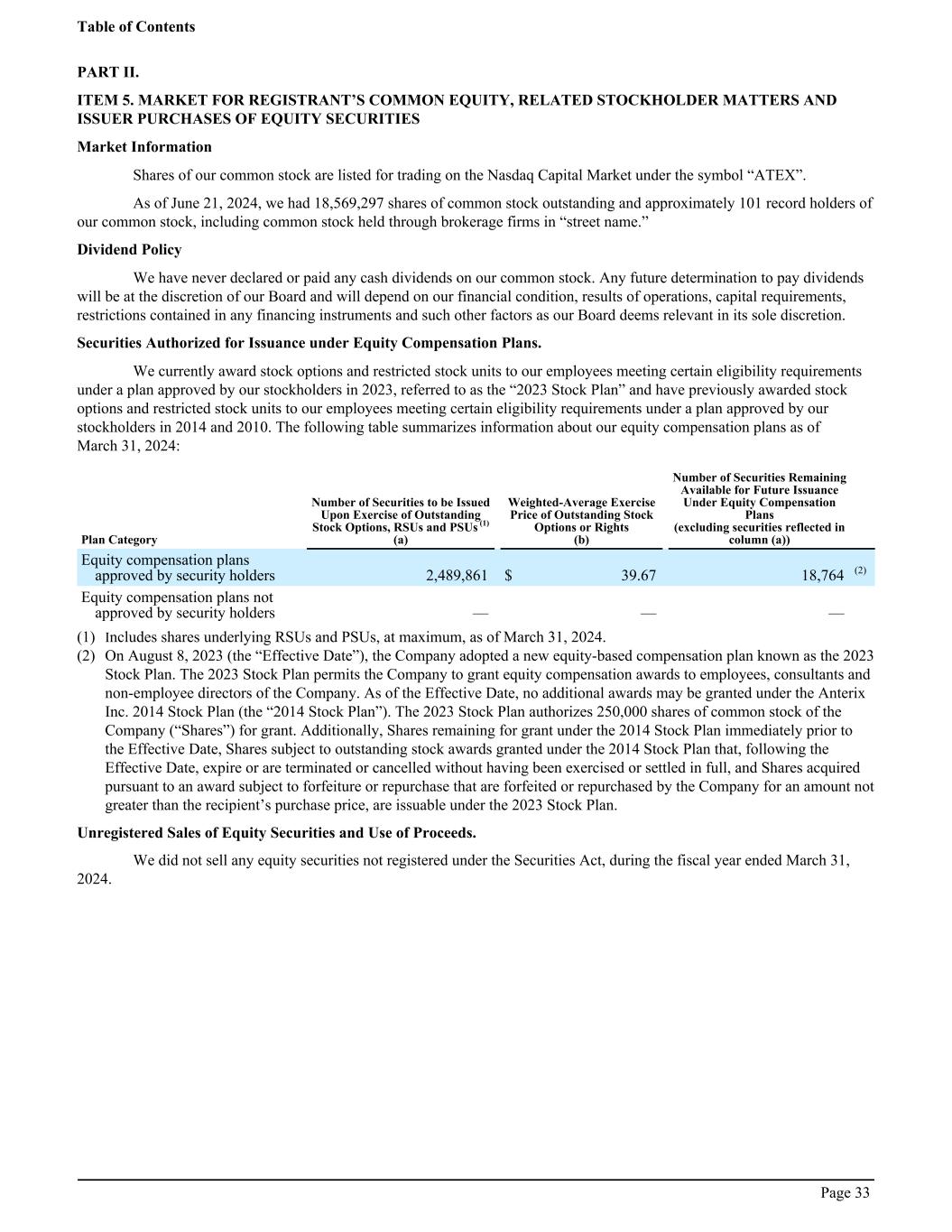 PART II. ITEM 5. MARKET FOR REGISTRANT’S COMMON EQUITY, RELATED STOCKHOLDER MATTERS AND ISSUER PURCHASES OF EQUITY SECURITIES Market Information Shares of our common stock are listed for trading on the Nasdaq Capital Market under the symbol “ATEX”. As of June 21, 2024, we had 18,569,297 shares of common stock outstanding and approximately 101 record holders of our common stock, including common stock held through brokerage firms in “street name.” Dividend Policy We have never declared or paid any cash dividends on our common stock. Any future determination to pay dividends will be at the discretion of our Board and will depend on our financial condition, results of operations, capital requirements, restrictions contained in any financing instruments and such other factors as our Board deems relevant in its sole discretion. Securities Authorized for Issuance under Equity Compensation Plans. We currently award stock options and restricted stock units to our employees meeting certain eligibility requirements under a plan approved by our stockholders in 2023, referred to as the “2023 Stock Plan” and have previously awarded stock options and restricted stock units to our employees meeting certain eligibility requirements under a plan approved by our stockholders in 2014 and 2010. The following table summarizes information about our equity compensation plans as of March 31, 2024: Plan Category Number of Securities to be Issued Upon Exercise of Outstanding Stock Options, RSUs and PSUs (1) (a) Weighted-Average Exercise Price of Outstanding Stock Options or Rights (b) Number of Securities Remaining Available for Future Issuance Under Equity Compensation Plans (excluding securities reflected in column (a)) Equity compensation plans approved by security holders 2,489,861 $ 39.67 18,764 (2) Equity compensation plans not approved by security holders — — — (1) Includes shares underlying RSUs and PSUs, at maximum, as of March 31, 2024. (2) On August 8, 2023 (the “Effective Date”), the Company adopted a new equity-based compensation plan known as the 2023 Stock Plan. The 2023 Stock Plan permits the Company to grant equity compensation awards to employees, consultants and non-employee directors of the Company. As of the Effective Date, no additional awards may be granted under the Anterix Inc. 2014 Stock Plan (the “2014 Stock Plan”). The 2023 Stock Plan authorizes 250,000 shares of common stock of the Company (“Shares”) for grant. Additionally, Shares remaining for grant under the 2014 Stock Plan immediately prior to the Effective Date, Shares subject to outstanding stock awards granted under the 2014 Stock Plan that, following the Effective Date, expire or are terminated or cancelled without having been exercised or settled in full, and Shares acquired pursuant to an award subject to forfeiture or repurchase that are forfeited or repurchased by the Company for an amount not greater than the recipient’s purchase price, are issuable under the 2023 Stock Plan. Unregistered Sales of Equity Securities and Use of Proceeds. We did not sell any equity securities not registered under the Securities Act, during the fiscal year ended March 31, 2024. Table of Contents Page 33