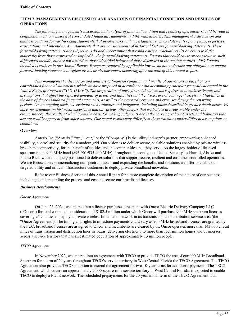 ITEM 7. MANAGEMENT’S DISCUSSION AND ANALYSIS OF FINANCIAL CONDITION AND RESULTS OF OPERATIONS The following management’s discussion and analysis of financial condition and results of operations should be read in conjunction with our historical consolidated financial statements and the related notes. This management’s discussion and analysis contains forward-looking statements that involve risks and uncertainties, such as statements of our plans, objectives, expectations and intentions. Any statements that are not statements of historical fact are forward-looking statements. These forward-looking statements are subject to risks and uncertainties that could cause our actual results or events to differ materially from those expressed or implied by the forward-looking statements. Factors that could cause or contribute to such differences include, but are not limited to, those identified below and those discussed in the section entitled “Risk Factors” included elsewhere in this Annual Report. Except as required by applicable law we do not undertake any obligation to update forward-looking statements to reflect events or circumstances occurring after the date of this Annual Report. This management’s discussion and analysis of financial condition and results of operations is based on our consolidated financial statements, which we have prepared in accordance with accounting principles generally accepted in the United States of America (“U.S. GAAP”). The preparation of these financial statements requires us to make estimates and assumptions that affect the reported amounts of assets and liabilities and the disclosure of contingent assets and liabilities at the date of the consolidated financial statements, as well as the reported revenues and expenses during the reporting periods. On an ongoing basis, we evaluate such estimates and judgments, including those described in greater detail below. We base our estimates on historical experience and on various other factors that we believe are reasonable under the circumstances, the results of which form the basis for making judgments about the carrying value of assets and liabilities that are not readily apparent from other sources. Our actual results may differ from these estimates under different assumptions or conditions. Overview Anterix Inc (“Anterix,” “we,” “our,” or the “Company”) is the utility industry’s partner, empowering enhanced visibility, control and security for a modern grid. Our vision is to deliver secure, scalable solutions enabled by private wireless broadband connectivity, for the benefit of utilities and the communities that they serve. As the largest holder of licensed spectrum in the 900 MHz band (896-901/935-940 MHz) throughout the contiguous United States, plus Hawaii, Alaska and Puerto Rico, we are uniquely positioned to deliver solutions that support secure, resilient and customer-controlled operations. We are focused on commercializing our spectrum assets and expanding the benefits and solutions we offer to enable our targeted utility and critical infrastructure customers to deploy private broadband networks. Refer to our Business Section of this Annual Report for a more complete description of the nature of our business, including details regarding the process and costs to secure our broadband licenses. Business Developments Oncor Agreement On June 26, 2024, we entered into a license purchase agreement with Oncor Electric Delivery Company LLC (“Oncor”) for total estimated consideration of $102.5 million under which Oncor will purchase 900 MHz spectrum licenses covering 95 counties to deploy a private wireless broadband network in its transmission and distribution service area (the “Oncor Agreement”). The timing and rights to milestone payments could vary as 900 MHz broadband licenses are granted by the FCC, broadband licenses are assigned to Oncor and incumbents are cleared by us. Oncor operates more than 143,000 circuit miles of transmission and distribution lines in Texas, delivering electricity to more than four million homes and businesses across a service territory that has an estimated population of approximately 13 million people. TECO Agreement In November 2023, we entered into an agreement with TECO to provide TECO the use of our 900 MHz Broadband Spectrum for a term of 20 years throughout TECO’s service territory in West Central Florida the TECO Agreement. The TECO Agreement also provides TECO an option to extend the agreement for two 10-year terms for additional payments. The TECO Agreement, which covers an approximately 2,000-square-mile service territory in West Central Florida, is expected to enable TECO to deploy a PLTE network. The scheduled prepayments for the 20-year initial term of the TECO Agreement total Table of Contents Page 35