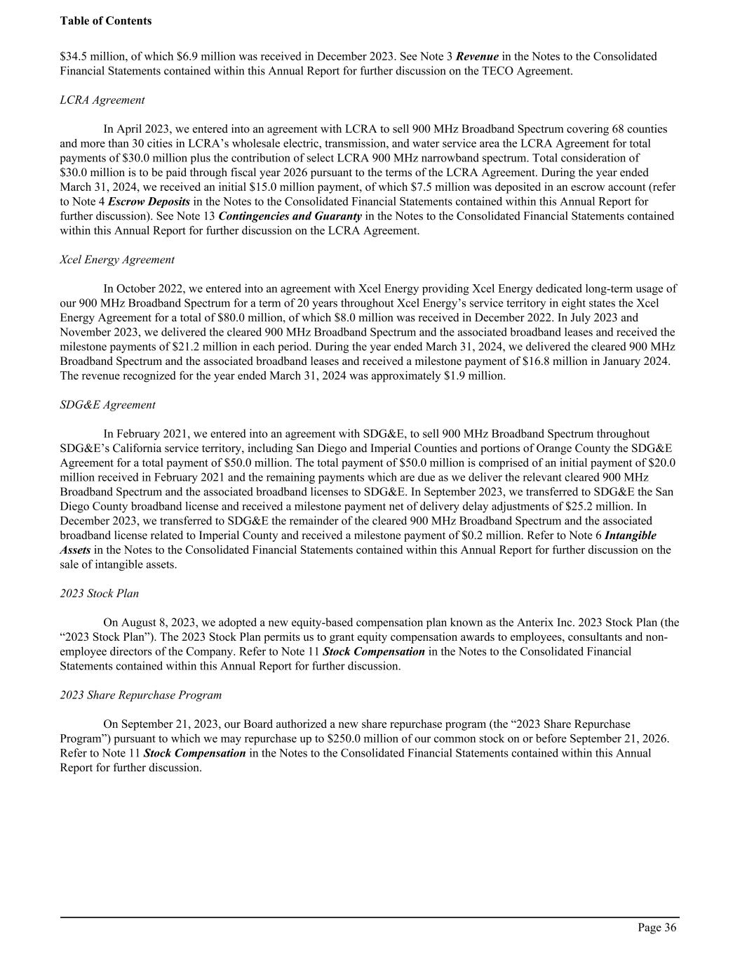 $34.5 million, of which $6.9 million was received in December 2023. See Note 3 Revenue in the Notes to the Consolidated Financial Statements contained within this Annual Report for further discussion on the TECO Agreement. LCRA Agreement In April 2023, we entered into an agreement with LCRA to sell 900 MHz Broadband Spectrum covering 68 counties and more than 30 cities in LCRA’s wholesale electric, transmission, and water service area the LCRA Agreement for total payments of $30.0 million plus the contribution of select LCRA 900 MHz narrowband spectrum. Total consideration of $30.0 million is to be paid through fiscal year 2026 pursuant to the terms of the LCRA Agreement. During the year ended March 31, 2024, we received an initial $15.0 million payment, of which $7.5 million was deposited in an escrow account (refer to Note 4 Escrow Deposits in the Notes to the Consolidated Financial Statements contained within this Annual Report for further discussion). See Note 13 Contingencies and Guaranty in the Notes to the Consolidated Financial Statements contained within this Annual Report for further discussion on the LCRA Agreement. Xcel Energy Agreement In October 2022, we entered into an agreement with Xcel Energy providing Xcel Energy dedicated long-term usage of our 900 MHz Broadband Spectrum for a term of 20 years throughout Xcel Energy’s service territory in eight states the Xcel Energy Agreement for a total of $80.0 million, of which $8.0 million was received in December 2022. In July 2023 and November 2023, we delivered the cleared 900 MHz Broadband Spectrum and the associated broadband leases and received the milestone payments of $21.2 million in each period. During the year ended March 31, 2024, we delivered the cleared 900 MHz Broadband Spectrum and the associated broadband leases and received a milestone payment of $16.8 million in January 2024. The revenue recognized for the year ended March 31, 2024 was approximately $1.9 million. SDG&E Agreement In February 2021, we entered into an agreement with SDG&E, to sell 900 MHz Broadband Spectrum throughout SDG&E’s California service territory, including San Diego and Imperial Counties and portions of Orange County the SDG&E Agreement for a total payment of $50.0 million. The total payment of $50.0 million is comprised of an initial payment of $20.0 million received in February 2021 and the remaining payments which are due as we deliver the relevant cleared 900 MHz Broadband Spectrum and the associated broadband licenses to SDG&E. In September 2023, we transferred to SDG&E the San Diego County broadband license and received a milestone payment net of delivery delay adjustments of $25.2 million. In December 2023, we transferred to SDG&E the remainder of the cleared 900 MHz Broadband Spectrum and the associated broadband license related to Imperial County and received a milestone payment of $0.2 million. Refer to Note 6 Intangible Assets in the Notes to the Consolidated Financial Statements contained within this Annual Report for further discussion on the sale of intangible assets. 2023 Stock Plan On August 8, 2023, we adopted a new equity-based compensation plan known as the Anterix Inc. 2023 Stock Plan (the “2023 Stock Plan”). The 2023 Stock Plan permits us to grant equity compensation awards to employees, consultants and non- employee directors of the Company. Refer to Note 11 Stock Compensation in the Notes to the Consolidated Financial Statements contained within this Annual Report for further discussion. 2023 Share Repurchase Program On September 21, 2023, our Board authorized a new share repurchase program (the “2023 Share Repurchase Program”) pursuant to which we may repurchase up to $250.0 million of our common stock on or before September 21, 2026. Refer to Note 11 Stock Compensation in the Notes to the Consolidated Financial Statements contained within this Annual Report for further discussion. Table of Contents Page 36