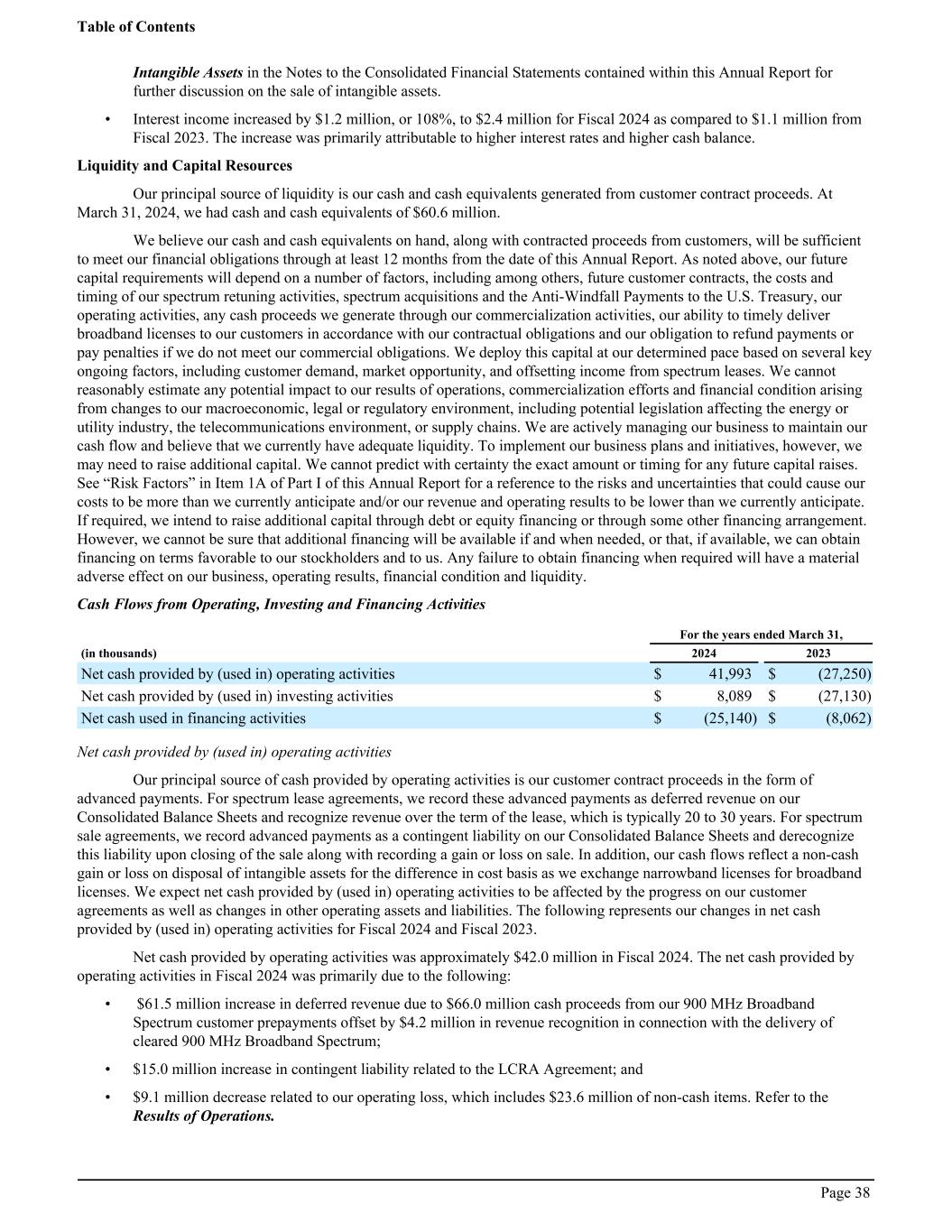 Intangible Assets in the Notes to the Consolidated Financial Statements contained within this Annual Report for further discussion on the sale of intangible assets. • Interest income increased by $1.2 million, or 108%, to $2.4 million for Fiscal 2024 as compared to $1.1 million from Fiscal 2023. The increase was primarily attributable to higher interest rates and higher cash balance. Liquidity and Capital Resources Our principal source of liquidity is our cash and cash equivalents generated from customer contract proceeds. At March 31, 2024, we had cash and cash equivalents of $60.6 million. We believe our cash and cash equivalents on hand, along with contracted proceeds from customers, will be sufficient to meet our financial obligations through at least 12 months from the date of this Annual Report. As noted above, our future capital requirements will depend on a number of factors, including among others, future customer contracts, the costs and timing of our spectrum retuning activities, spectrum acquisitions and the Anti-Windfall Payments to the U.S. Treasury, our operating activities, any cash proceeds we generate through our commercialization activities, our ability to timely deliver broadband licenses to our customers in accordance with our contractual obligations and our obligation to refund payments or pay penalties if we do not meet our commercial obligations. We deploy this capital at our determined pace based on several key ongoing factors, including customer demand, market opportunity, and offsetting income from spectrum leases. We cannot reasonably estimate any potential impact to our results of operations, commercialization efforts and financial condition arising from changes to our macroeconomic, legal or regulatory environment, including potential legislation affecting the energy or utility industry, the telecommunications environment, or supply chains. We are actively managing our business to maintain our cash flow and believe that we currently have adequate liquidity. To implement our business plans and initiatives, however, we may need to raise additional capital. We cannot predict with certainty the exact amount or timing for any future capital raises. See “Risk Factors” in Item 1A of Part I of this Annual Report for a reference to the risks and uncertainties that could cause our costs to be more than we currently anticipate and/or our revenue and operating results to be lower than we currently anticipate. If required, we intend to raise additional capital through debt or equity financing or through some other financing arrangement. However, we cannot be sure that additional financing will be available if and when needed, or that, if available, we can obtain financing on terms favorable to our stockholders and to us. Any failure to obtain financing when required will have a material adverse effect on our business, operating results, financial condition and liquidity. Cash Flows from Operating, Investing and Financing Activities ͏ For the years ended March 31, (in thousands) 2024 2023 Net cash provided by (used in) operating activities $ 41,993 $ (27,250) Net cash provided by (used in) investing activities $ 8,089 $ (27,130) Net cash used in financing activities $ (25,140) $ (8,062) Net cash provided by (used in) operating activities Our principal source of cash provided by operating activities is our customer contract proceeds in the form of advanced payments. For spectrum lease agreements, we record these advanced payments as deferred revenue on our Consolidated Balance Sheets and recognize revenue over the term of the lease, which is typically 20 to 30 years. For spectrum sale agreements, we record advanced payments as a contingent liability on our Consolidated Balance Sheets and derecognize this liability upon closing of the sale along with recording a gain or loss on sale. In addition, our cash flows reflect a non-cash gain or loss on disposal of intangible assets for the difference in cost basis as we exchange narrowband licenses for broadband licenses. We expect net cash provided by (used in) operating activities to be affected by the progress on our customer agreements as well as changes in other operating assets and liabilities. The following represents our changes in net cash provided by (used in) operating activities for Fiscal 2024 and Fiscal 2023. Net cash provided by operating activities was approximately $42.0 million in Fiscal 2024. The net cash provided by operating activities in Fiscal 2024 was primarily due to the following: • $61.5 million increase in deferred revenue due to $66.0 million cash proceeds from our 900 MHz Broadband Spectrum customer prepayments offset by $4.2 million in revenue recognition in connection with the delivery of cleared 900 MHz Broadband Spectrum; • $15.0 million increase in contingent liability related to the LCRA Agreement; and • $9.1 million decrease related to our operating loss, which includes $23.6 million of non-cash items. Refer to the Results of Operations. Table of Contents Page 38