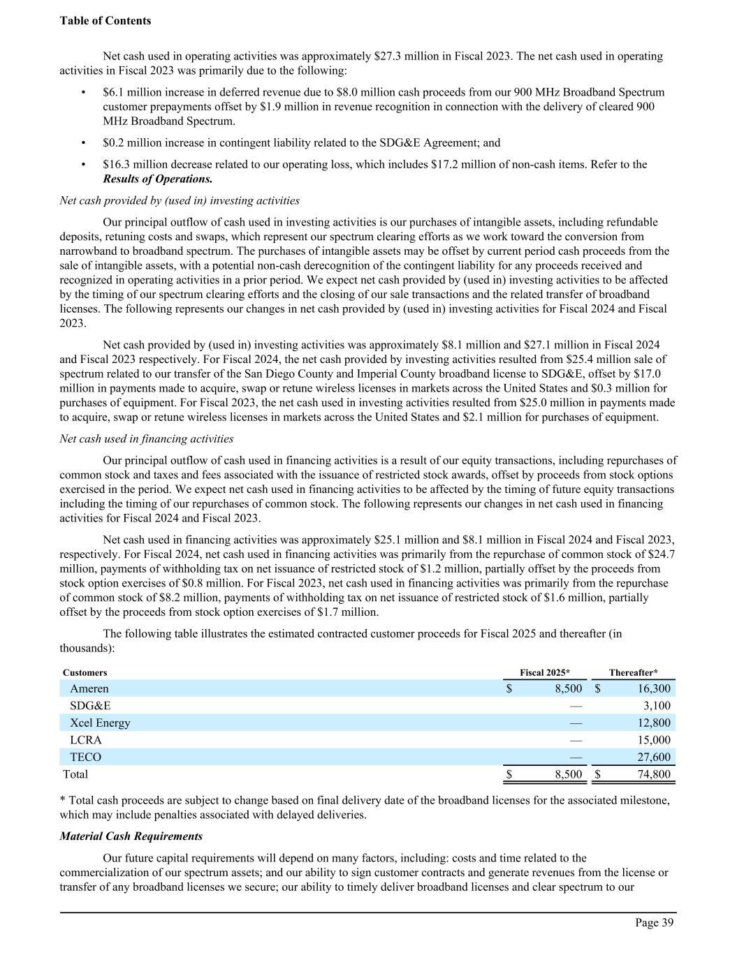Net cash used in operating activities was approximately $27.3 million in Fiscal 2023. The net cash used in operating activities in Fiscal 2023 was primarily due to the following: • $6.1 million increase in deferred revenue due to $8.0 million cash proceeds from our 900 MHz Broadband Spectrum customer prepayments offset by $1.9 million in revenue recognition in connection with the delivery of cleared 900 MHz Broadband Spectrum. • $0.2 million increase in contingent liability related to the SDG&E Agreement; and • $16.3 million decrease related to our operating loss, which includes $17.2 million of non-cash items. Refer to the Results of Operations. Net cash provided by (used in) investing activities Our principal outflow of cash used in investing activities is our purchases of intangible assets, including refundable deposits, retuning costs and swaps, which represent our spectrum clearing efforts as we work toward the conversion from narrowband to broadband spectrum. The purchases of intangible assets may be offset by current period cash proceeds from the sale of intangible assets, with a potential non-cash derecognition of the contingent liability for any proceeds received and recognized in operating activities in a prior period. We expect net cash provided by (used in) investing activities to be affected by the timing of our spectrum clearing efforts and the closing of our sale transactions and the related transfer of broadband licenses. The following represents our changes in net cash provided by (used in) investing activities for Fiscal 2024 and Fiscal 2023. Net cash provided by (used in) investing activities was approximately $8.1 million and $27.1 million in Fiscal 2024 and Fiscal 2023 respectively. For Fiscal 2024, the net cash provided by investing activities resulted from $25.4 million sale of spectrum related to our transfer of the San Diego County and Imperial County broadband license to SDG&E, offset by $17.0 million in payments made to acquire, swap or retune wireless licenses in markets across the United States and $0.3 million for purchases of equipment. For Fiscal 2023, the net cash used in investing activities resulted from $25.0 million in payments made to acquire, swap or retune wireless licenses in markets across the United States and $2.1 million for purchases of equipment. Net cash used in financing activities Our principal outflow of cash used in financing activities is a result of our equity transactions, including repurchases of common stock and taxes and fees associated with the issuance of restricted stock awards, offset by proceeds from stock options exercised in the period. We expect net cash used in financing activities to be affected by the timing of future equity transactions including the timing of our repurchases of common stock. The following represents our changes in net cash used in financing activities for Fiscal 2024 and Fiscal 2023. Net cash used in financing activities was approximately $25.1 million and $8.1 million in Fiscal 2024 and Fiscal 2023, respectively. For Fiscal 2024, net cash used in financing activities was primarily from the repurchase of common stock of $24.7 million, payments of withholding tax on net issuance of restricted stock of $1.2 million, partially offset by the proceeds from stock option exercises of $0.8 million. For Fiscal 2023, net cash used in financing activities was primarily from the repurchase of common stock of $8.2 million, payments of withholding tax on net issuance of restricted stock of $1.6 million, partially offset by the proceeds from stock option exercises of $1.7 million. The following table illustrates the estimated contracted customer proceeds for Fiscal 2025 and thereafter (in thousands): Customers Fiscal 2025* Thereafter* Ameren $ 8,500 $ 16,300 SDG&E — 3,100 Xcel Energy — 12,800 LCRA — 15,000 TECO — 27,600 Total $ 8,500 $ 74,800 * Total cash proceeds are subject to change based on final delivery date of the broadband licenses for the associated milestone, which may include penalties associated with delayed deliveries. Material Cash Requirements Our future capital requirements will depend on many factors, including: costs and time related to the commercialization of our spectrum assets; and our ability to sign customer contracts and generate revenues from the license or transfer of any broadband licenses we secure; our ability to timely deliver broadband licenses and clear spectrum to our Table of Contents Page 39