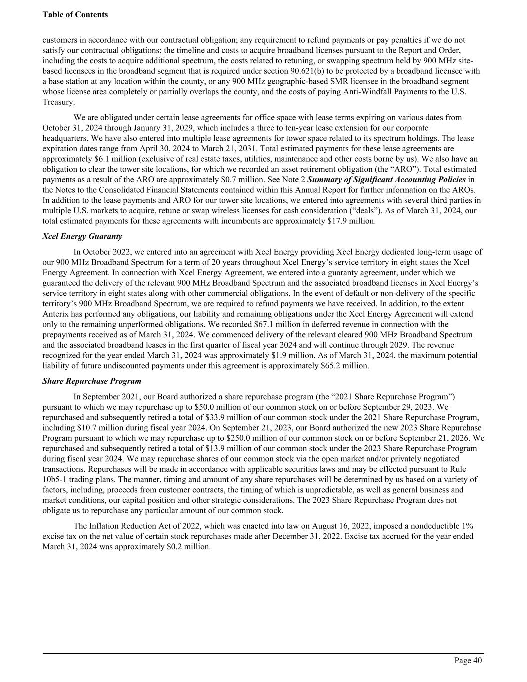 customers in accordance with our contractual obligation; any requirement to refund payments or pay penalties if we do not satisfy our contractual obligations; the timeline and costs to acquire broadband licenses pursuant to the Report and Order, including the costs to acquire additional spectrum, the costs related to retuning, or swapping spectrum held by 900 MHz site- based licensees in the broadband segment that is required under section 90.621(b) to be protected by a broadband licensee with a base station at any location within the county, or any 900 MHz geographic-based SMR licensee in the broadband segment whose license area completely or partially overlaps the county, and the costs of paying Anti-Windfall Payments to the U.S. Treasury. We are obligated under certain lease agreements for office space with lease terms expiring on various dates from October 31, 2024 through January 31, 2029, which includes a three to ten-year lease extension for our corporate headquarters. We have also entered into multiple lease agreements for tower space related to its spectrum holdings. The lease expiration dates range from April 30, 2024 to March 21, 2031. Total estimated payments for these lease agreements are approximately $6.1 million (exclusive of real estate taxes, utilities, maintenance and other costs borne by us). We also have an obligation to clear the tower site locations, for which we recorded an asset retirement obligation (the “ARO”). Total estimated payments as a result of the ARO are approximately $0.7 million. See Note 2 Summary of Significant Accounting Policies in the Notes to the Consolidated Financial Statements contained within this Annual Report for further information on the AROs. In addition to the lease payments and ARO for our tower site locations, we entered into agreements with several third parties in multiple U.S. markets to acquire, retune or swap wireless licenses for cash consideration (“deals”). As of March 31, 2024, our total estimated payments for these agreements with incumbents are approximately $17.9 million. Xcel Energy Guaranty In October 2022, we entered into an agreement with Xcel Energy providing Xcel Energy dedicated long-term usage of our 900 MHz Broadband Spectrum for a term of 20 years throughout Xcel Energy’s service territory in eight states the Xcel Energy Agreement. In connection with Xcel Energy Agreement, we entered into a guaranty agreement, under which we guaranteed the delivery of the relevant 900 MHz Broadband Spectrum and the associated broadband licenses in Xcel Energy’s service territory in eight states along with other commercial obligations. In the event of default or non-delivery of the specific territory’s 900 MHz Broadband Spectrum, we are required to refund payments we have received. In addition, to the extent Anterix has performed any obligations, our liability and remaining obligations under the Xcel Energy Agreement will extend only to the remaining unperformed obligations. We recorded $67.1 million in deferred revenue in connection with the prepayments received as of March 31, 2024. We commenced delivery of the relevant cleared 900 MHz Broadband Spectrum and the associated broadband leases in the first quarter of fiscal year 2024 and will continue through 2029. The revenue recognized for the year ended March 31, 2024 was approximately $1.9 million. As of March 31, 2024, the maximum potential liability of future undiscounted payments under this agreement is approximately $65.2 million. Share Repurchase Program In September 2021, our Board authorized a share repurchase program (the “2021 Share Repurchase Program”) pursuant to which we may repurchase up to $50.0 million of our common stock on or before September 29, 2023. We repurchased and subsequently retired a total of $33.9 million of our common stock under the 2021 Share Repurchase Program, including $10.7 million during fiscal year 2024. On September 21, 2023, our Board authorized the new 2023 Share Repurchase Program pursuant to which we may repurchase up to $250.0 million of our common stock on or before September 21, 2026. We repurchased and subsequently retired a total of $13.9 million of our common stock under the 2023 Share Repurchase Program during fiscal year 2024. We may repurchase shares of our common stock via the open market and/or privately negotiated transactions. Repurchases will be made in accordance with applicable securities laws and may be effected pursuant to Rule 10b5-1 trading plans. The manner, timing and amount of any share repurchases will be determined by us based on a variety of factors, including, proceeds from customer contracts, the timing of which is unpredictable, as well as general business and market conditions, our capital position and other strategic considerations. The 2023 Share Repurchase Program does not obligate us to repurchase any particular amount of our common stock. The Inflation Reduction Act of 2022, which was enacted into law on August 16, 2022, imposed a nondeductible 1% excise tax on the net value of certain stock repurchases made after December 31, 2022. Excise tax accrued for the year ended March 31, 2024 was approximately $0.2 million. Table of Contents Page 40