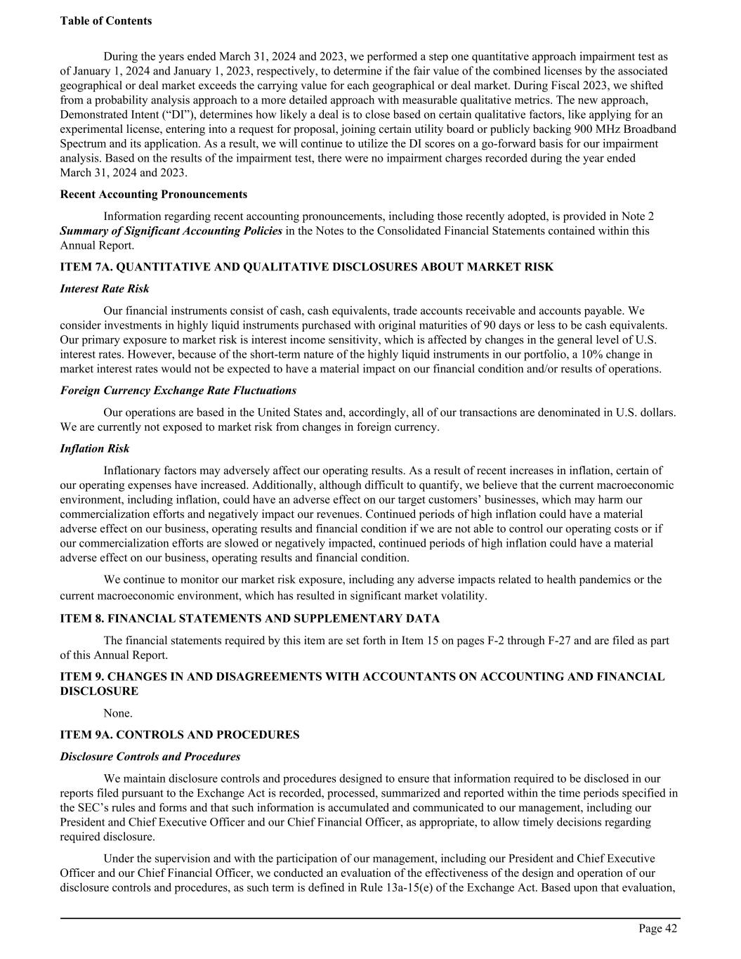 During the years ended March 31, 2024 and 2023, we performed a step one quantitative approach impairment test as of January 1, 2024 and January 1, 2023, respectively, to determine if the fair value of the combined licenses by the associated geographical or deal market exceeds the carrying value for each geographical or deal market. During Fiscal 2023, we shifted from a probability analysis approach to a more detailed approach with measurable qualitative metrics. The new approach, Demonstrated Intent (“DI”), determines how likely a deal is to close based on certain qualitative factors, like applying for an experimental license, entering into a request for proposal, joining certain utility board or publicly backing 900 MHz Broadband Spectrum and its application. As a result, we will continue to utilize the DI scores on a go-forward basis for our impairment analysis. Based on the results of the impairment test, there were no impairment charges recorded during the year ended March 31, 2024 and 2023. Recent Accounting Pronouncements Information regarding recent accounting pronouncements, including those recently adopted, is provided in Note 2 Summary of Significant Accounting Policies in the Notes to the Consolidated Financial Statements contained within this Annual Report. ITEM 7A. QUANTITATIVE AND QUALITATIVE DISCLOSURES ABOUT MARKET RISK Interest Rate Risk Our financial instruments consist of cash, cash equivalents, trade accounts receivable and accounts payable. We consider investments in highly liquid instruments purchased with original maturities of 90 days or less to be cash equivalents. Our primary exposure to market risk is interest income sensitivity, which is affected by changes in the general level of U.S. interest rates. However, because of the short-term nature of the highly liquid instruments in our portfolio, a 10% change in market interest rates would not be expected to have a material impact on our financial condition and/or results of operations. Foreign Currency Exchange Rate Fluctuations Our operations are based in the United States and, accordingly, all of our transactions are denominated in U.S. dollars. We are currently not exposed to market risk from changes in foreign currency. Inflation Risk Inflationary factors may adversely affect our operating results. As a result of recent increases in inflation, certain of our operating expenses have increased. Additionally, although difficult to quantify, we believe that the current macroeconomic environment, including inflation, could have an adverse effect on our target customers’ businesses, which may harm our commercialization efforts and negatively impact our revenues. Continued periods of high inflation could have a material adverse effect on our business, operating results and financial condition if we are not able to control our operating costs or if our commercialization efforts are slowed or negatively impacted, continued periods of high inflation could have a material adverse effect on our business, operating results and financial condition. We continue to monitor our market risk exposure, including any adverse impacts related to health pandemics or the current macroeconomic environment, which has resulted in significant market volatility. ITEM 8. FINANCIAL STATEMENTS AND SUPPLEMENTARY DATA The financial statements required by this item are set forth in Item 15 on pages F-2 through F-27 and are filed as part of this Annual Report. ITEM 9. CHANGES IN AND DISAGREEMENTS WITH ACCOUNTANTS ON ACCOUNTING AND FINANCIAL DISCLOSURE None. ITEM 9A. CONTROLS AND PROCEDURES Disclosure Controls and Procedures We maintain disclosure controls and procedures designed to ensure that information required to be disclosed in our reports filed pursuant to the Exchange Act is recorded, processed, summarized and reported within the time periods specified in the SEC’s rules and forms and that such information is accumulated and communicated to our management, including our President and Chief Executive Officer and our Chief Financial Officer, as appropriate, to allow timely decisions regarding required disclosure. Under the supervision and with the participation of our management, including our President and Chief Executive Officer and our Chief Financial Officer, we conducted an evaluation of the effectiveness of the design and operation of our disclosure controls and procedures, as such term is defined in Rule 13a-15(e) of the Exchange Act. Based upon that evaluation, Table of Contents Page 42
