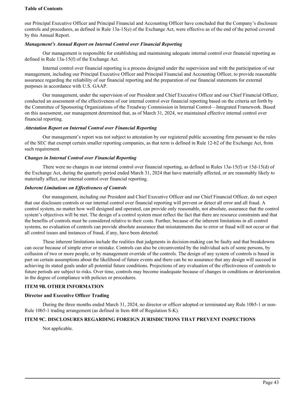 our Principal Executive Officer and Principal Financial and Accounting Officer have concluded that the Company’s disclosure controls and procedures, as defined in Rule 13a-15(e) of the Exchange Act, were effective as of the end of the period covered by this Annual Report. Management’s Annual Report on Internal Control over Financial Reporting Our management is responsible for establishing and maintaining adequate internal control over financial reporting as defined in Rule 13a-15(f) of the Exchange Act. Internal control over financial reporting is a process designed under the supervision and with the participation of our management, including our Principal Executive Officer and Principal Financial and Accounting Officer, to provide reasonable assurance regarding the reliability of our financial reporting and the preparation of our financial statements for external purposes in accordance with U.S. GAAP. Our management, under the supervision of our President and Chief Executive Officer and our Chief Financial Officer, conducted an assessment of the effectiveness of our internal control over financial reporting based on the criteria set forth by the Committee of Sponsoring Organizations of the Treadway Commission in Internal Control—Integrated Framework. Based on this assessment, our management determined that, as of March 31, 2024, we maintained effective internal control over financial reporting. Attestation Report on Internal Control over Financial Reporting Our management’s report was not subject to attestation by our registered public accounting firm pursuant to the rules of the SEC that exempt certain smaller reporting companies, as that term is defined in Rule 12-b2 of the Exchange Act, from such requirement. Changes in Internal Control over Financial Reporting There were no changes in our internal control over financial reporting, as defined in Rules 13a-15(f) or 15d-15(d) of the Exchange Act, during the quarterly period ended March 31, 2024 that have materially affected, or are reasonably likely to materially affect, our internal control over financial reporting. Inherent Limitations on Effectiveness of Controls Our management, including our President and Chief Executive Officer and our Chief Financial Officer, do not expect that our disclosure controls or our internal control over financial reporting will prevent or detect all error and all fraud. A control system, no matter how well designed and operated, can provide only reasonable, not absolute, assurance that the control system’s objectives will be met. The design of a control system must reflect the fact that there are resource constraints and that the benefits of controls must be considered relative to their costs. Further, because of the inherent limitations in all control systems, no evaluation of controls can provide absolute assurance that misstatements due to error or fraud will not occur or that all control issues and instances of fraud, if any, have been detected. These inherent limitations include the realities that judgments in decision-making can be faulty and that breakdowns can occur because of simple error or mistake. Controls can also be circumvented by the individual acts of some persons, by collusion of two or more people, or by management override of the controls. The design of any system of controls is based in part on certain assumptions about the likelihood of future events and there can be no assurance that any design will succeed in achieving its stated goals under all potential future conditions. Projections of any evaluation of the effectiveness of controls to future periods are subject to risks. Over time, controls may become inadequate because of changes in conditions or deterioration in the degree of compliance with policies or procedures. ITEM 9B. OTHER INFORMATION Director and Executive Officer Trading During the three months ended March 31, 2024, no director or officer adopted or terminated any Rule 10b5-1 or non- Rule 10b5-1 trading arrangement (as defined in Item 408 of Regulation S-K). ITEM 9C. DISCLOSURES REGARDING FOREIGN JURISDICTIONS THAT PREVENT INSPECTIONS Not applicable. Table of Contents Page 43