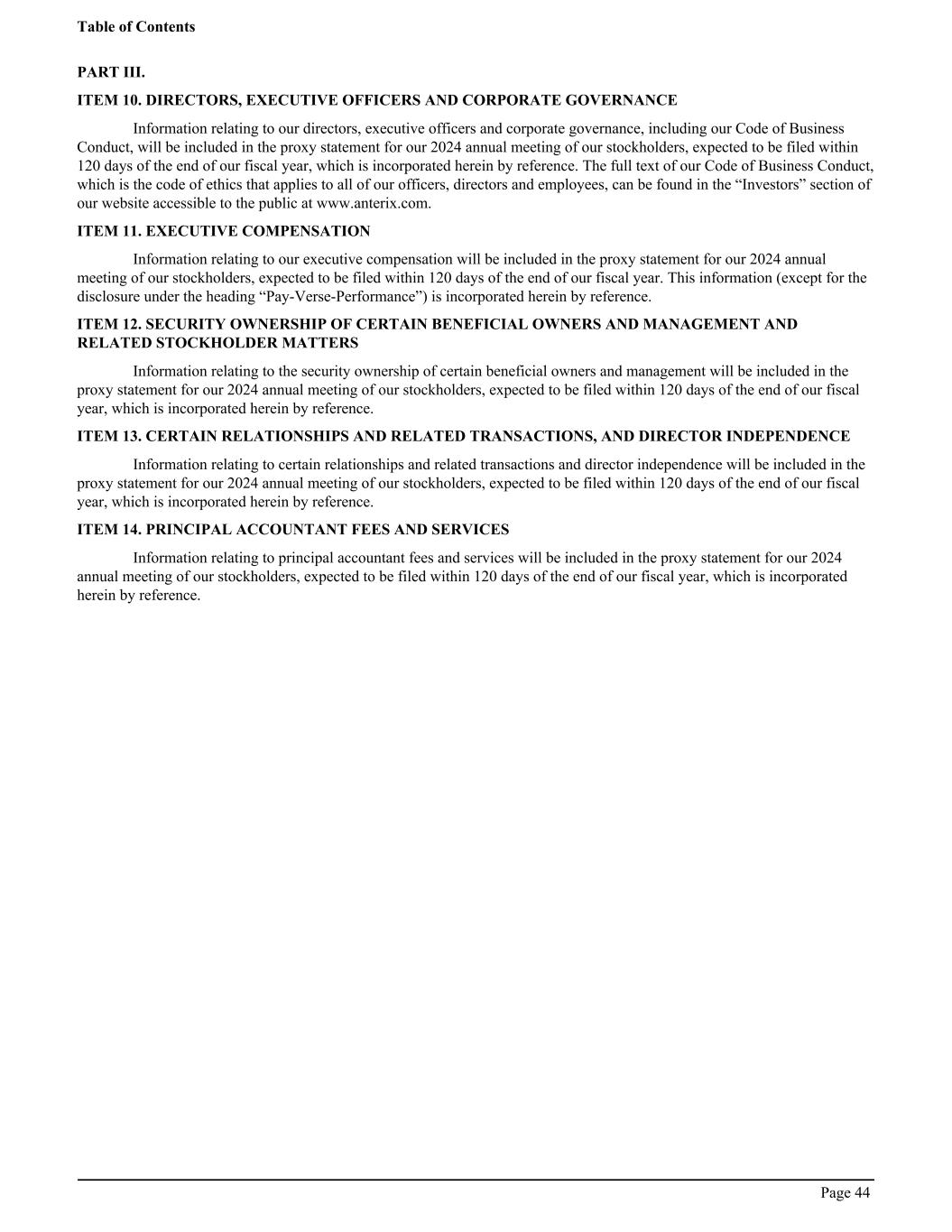 PART III. ITEM 10. DIRECTORS, EXECUTIVE OFFICERS AND CORPORATE GOVERNANCE Information relating to our directors, executive officers and corporate governance, including our Code of Business Conduct, will be included in the proxy statement for our 2024 annual meeting of our stockholders, expected to be filed within 120 days of the end of our fiscal year, which is incorporated herein by reference. The full text of our Code of Business Conduct, which is the code of ethics that applies to all of our officers, directors and employees, can be found in the “Investors” section of our website accessible to the public at www.anterix.com. ITEM 11. EXECUTIVE COMPENSATION Information relating to our executive compensation will be included in the proxy statement for our 2024 annual meeting of our stockholders, expected to be filed within 120 days of the end of our fiscal year. This information (except for the disclosure under the heading “Pay-Verse-Performance”) is incorporated herein by reference. ITEM 12. SECURITY OWNERSHIP OF CERTAIN BENEFICIAL OWNERS AND MANAGEMENT AND RELATED STOCKHOLDER MATTERS Information relating to the security ownership of certain beneficial owners and management will be included in the proxy statement for our 2024 annual meeting of our stockholders, expected to be filed within 120 days of the end of our fiscal year, which is incorporated herein by reference. ITEM 13. CERTAIN RELATIONSHIPS AND RELATED TRANSACTIONS, AND DIRECTOR INDEPENDENCE Information relating to certain relationships and related transactions and director independence will be included in the proxy statement for our 2024 annual meeting of our stockholders, expected to be filed within 120 days of the end of our fiscal year, which is incorporated herein by reference. ITEM 14. PRINCIPAL ACCOUNTANT FEES AND SERVICES Information relating to principal accountant fees and services will be included in the proxy statement for our 2024 annual meeting of our stockholders, expected to be filed within 120 days of the end of our fiscal year, which is incorporated herein by reference. Table of Contents Page 44