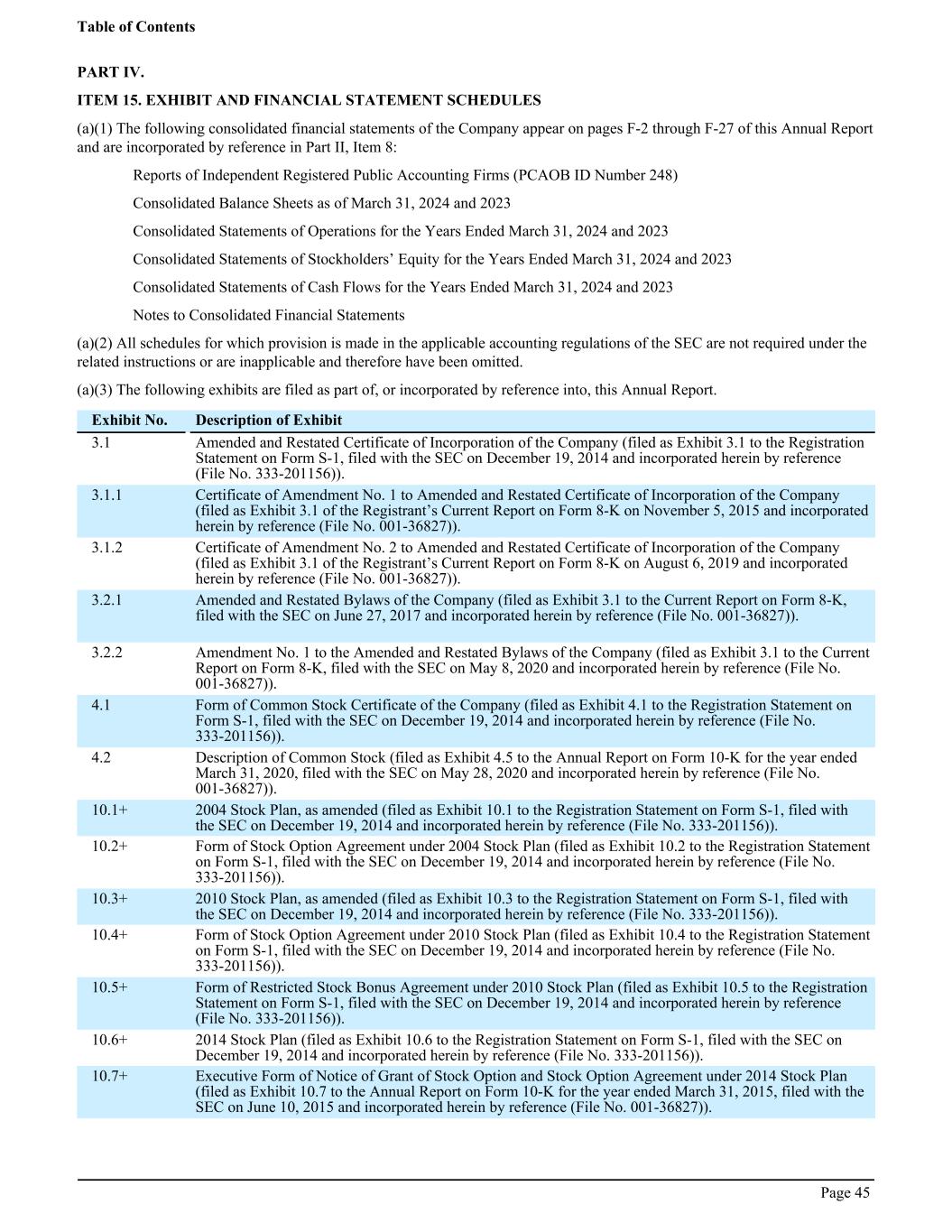 PART IV. ITEM 15. EXHIBIT AND FINANCIAL STATEMENT SCHEDULES (a)(1) The following consolidated financial statements of the Company appear on pages F-2 through F-27 of this Annual Report and are incorporated by reference in Part II, Item 8: Reports of Independent Registered Public Accounting Firms (PCAOB ID Number 248) Consolidated Balance Sheets as of March 31, 2024 and 2023 Consolidated Statements of Operations for the Years Ended March 31, 2024 and 2023 Consolidated Statements of Stockholders’ Equity for the Years Ended March 31, 2024 and 2023 Consolidated Statements of Cash Flows for the Years Ended March 31, 2024 and 2023 Notes to Consolidated Financial Statements (a)(2) All schedules for which provision is made in the applicable accounting regulations of the SEC are not required under the related instructions or are inapplicable and therefore have been omitted. (a)(3) The following exhibits are filed as part of, or incorporated by reference into, this Annual Report. Exhibit No. Description of Exhibit 3.1 Amended and Restated Certificate of Incorporation of the Company (filed as Exhibit 3.1 to the Registration Statement on Form S-1, filed with the SEC on December 19, 2014 and incorporated herein by reference (File No. 333-201156)). 3.1.1 Certificate of Amendment No. 1 to Amended and Restated Certificate of Incorporation of the Company (filed as Exhibit 3.1 of the Registrant’s Current Report on Form 8-K on November 5, 2015 and incorporated herein by reference (File No. 001-36827)). 3.1.2 Certificate of Amendment No. 2 to Amended and Restated Certificate of Incorporation of the Company (filed as Exhibit 3.1 of the Registrant’s Current Report on Form 8-K on August 6, 2019 and incorporated herein by reference (File No. 001-36827)). 3.2.1 Amended and Restated Bylaws of the Company (filed as Exhibit 3.1 to the Current Report on Form 8-K, filed with the SEC on June 27, 2017 and incorporated herein by reference (File No. 001-36827)). 3.2.2 Amendment No. 1 to the Amended and Restated Bylaws of the Company (filed as Exhibit 3.1 to the Current Report on Form 8-K, filed with the SEC on May 8, 2020 and incorporated herein by reference (File No. 001-36827)). 4.1 Form of Common Stock Certificate of the Company (filed as Exhibit 4.1 to the Registration Statement on Form S-1, filed with the SEC on December 19, 2014 and incorporated herein by reference (File No. 333-201156)). 4.2 Description of Common Stock (filed as Exhibit 4.5 to the Annual Report on Form 10-K for the year ended March 31, 2020, filed with the SEC on May 28, 2020 and incorporated herein by reference (File No. 001-36827)). 10.1+ 2004 Stock Plan, as amended (filed as Exhibit 10.1 to the Registration Statement on Form S-1, filed with the SEC on December 19, 2014 and incorporated herein by reference (File No. 333-201156)). 10.2+ Form of Stock Option Agreement under 2004 Stock Plan (filed as Exhibit 10.2 to the Registration Statement on Form S-1, filed with the SEC on December 19, 2014 and incorporated herein by reference (File No. 333-201156)). 10.3+ 2010 Stock Plan, as amended (filed as Exhibit 10.3 to the Registration Statement on Form S-1, filed with the SEC on December 19, 2014 and incorporated herein by reference (File No. 333-201156)). 10.4+ Form of Stock Option Agreement under 2010 Stock Plan (filed as Exhibit 10.4 to the Registration Statement on Form S-1, filed with the SEC on December 19, 2014 and incorporated herein by reference (File No. 333-201156)). 10.5+ Form of Restricted Stock Bonus Agreement under 2010 Stock Plan (filed as Exhibit 10.5 to the Registration Statement on Form S-1, filed with the SEC on December 19, 2014 and incorporated herein by reference (File No. 333-201156)). 10.6+ 2014 Stock Plan (filed as Exhibit 10.6 to the Registration Statement on Form S-1, filed with the SEC on December 19, 2014 and incorporated herein by reference (File No. 333-201156)). 10.7+ Executive Form of Notice of Grant of Stock Option and Stock Option Agreement under 2014 Stock Plan (filed as Exhibit 10.7 to the Annual Report on Form 10-K for the year ended March 31, 2015, filed with the SEC on June 10, 2015 and incorporated herein by reference (File No. 001-36827)). Table of Contents Page 45