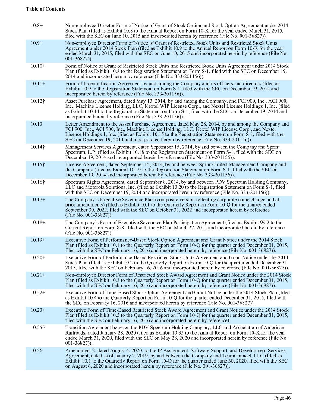 10.8+ Non-employee Director Form of Notice of Grant of Stock Option and Stock Option Agreement under 2014 Stock Plan (filed as Exhibit 10.8 to the Annual Report on Form 10-K for the year ended March 31, 2015, filed with the SEC on June 10, 2015 and incorporated herein by reference (File No. 001-36827)). 10.9+ Non-employee Director Form of Notice of Grant of Restricted Stock Units and Restricted Stock Units Agreement under 2014 Stock Plan (filed as Exhibit 10.9 to the Annual Report on Form 10-K for the year ended March 31, 2015, filed with the SEC on June 10, 2015 and incorporated herein by reference (File No. 001-36827)). 10.10+ Form of Notice of Grant of Restricted Stock Units and Restricted Stock Units Agreement under 2014 Stock Plan (filed as Exhibit 10.8 to the Registration Statement on Form S-1, filed with the SEC on December 19, 2014 and incorporated herein by reference (File No. 333-201156)). 10.11+ Form of Indemnification Agreement by and among the Company and its officers and directors (filed as Exhibit 10.9 to the Registration Statement on Form S-1, filed with the SEC on December 19, 2014 and incorporated herein by reference (File No. 333-201156)). 10.12† Asset Purchase Agreement, dated May 13, 2014, by and among the Company, and FCI 900, Inc., ACI 900, Inc., Machine License Holding, LLC, Nextel WIP License Corp., and Nextel License Holdings 1, Inc. (filed as Exhibit 10.14 to the Registration Statement on Form S-1, filed with the SEC on December 19, 2014 and incorporated herein by reference (File No. 333-201156)). 10.13 Letter Amendment to the Asset Purchase Agreement, dated May 28, 2014, by and among the Company and FCI 900, Inc., ACI 900, Inc., Machine License Holding, LLC, Nextel WIP License Corp., and Nextel License Holdings 1, Inc. (filed as Exhibit 10.15 to the Registration Statement on Form S-1, filed with the SEC on December 19, 2014 and incorporated herein by reference (File No. 333-201156)). 10.14† Management Services Agreement, dated September 15, 2014, by and between the Company and Sprint Spectrum, L.P. (filed as Exhibit 10.18 to the Registration Statement on Form S-1, filed with the SEC on December 19, 2014 and incorporated herein by reference (File No. 333-201156)). 10.15† License Agreement, dated September 15, 2014, by and between Sprint/United Management Company and the Company (filed as Exhibit 10.19 to the Registration Statement on Form S-1, filed with the SEC on December 19, 2014 and incorporated herein by reference (File No. 333-201156)). 10.16† Spectrum Rights Agreement, dated September 8, 2014, by and between PDV Spectrum Holding Company, LLC and Motorola Solutions, Inc. (filed as Exhibit 10.20 to the Registration Statement on Form S-1, filed with the SEC on December 19, 2014 and incorporated herein by reference (File No. 333-201156)). 10.17+ The Company’s Executive Severance Plan (composite version reflecting corporate name change and all prior amendments) (filed as Exhibit 10.1 to the Quarterly Report on Form 10-Q for the quarter ended September 30, 2022, filed with the SEC on October 31, 2022 and incorporated herein by reference (File No. 001-36827)). 10.18+ The Company’s Form of Executive Severance Plan Participation Agreement (filed as Exhibit 99.2 to the Current Report on Form 8-K, filed with the SEC on March 27, 2015 and incorporated herein by reference (File No. 001-36827)). 10.19+ Executive Form of Performance-Based Stock Option Agreement and Grant Notice under the 2014 Stock Plan (filed as Exhibit 10.1 to the Quarterly Report on Form 10-Q for the quarter ended December 31, 2015, filed with the SEC on February 16, 2016 and incorporated herein by reference (File No. 001-36827)). 10.20+ Executive Form of Performance-Based Restricted Stock Units Agreement and Grant Notice under the 2014 Stock Plan (filed as Exhibit 10.2 to the Quarterly Report on Form 10-Q for the quarter ended December 31, 2015, filed with the SEC on February 16, 2016 and incorporated herein by reference (File No. 001-36827)). 10.21+ Non-employee Director Form of Restricted Stock Award Agreement and Grant Notice under the 2014 Stock Plan (filed as Exhibit 10.3 to the Quarterly Report on Form 10-Q for the quarter ended December 31, 2015, filed with the SEC on February 16, 2016 and incorporated herein by reference (File No. 001-36827)). 10.22+ Executive Form of Time-Based Stock Option Agreement and Grant Notice under the 2014 Stock Plan (filed as Exhibit 10.4 to the Quarterly Report on Form 10-Q for the quarter ended December 31, 2015, filed with the SEC on February 16, 2016 and incorporated herein by reference (File No. 001-36827)). 10.23+ Executive Form of Time-Based Restricted Stock Award Agreement and Grant Notice under the 2014 Stock Plan (filed as Exhibit 10.5 to the Quarterly Report on Form 10-Q for the quarter ended December 31, 2015, filed with the SEC on February 16, 2016 and incorporated herein by reference). 10.25^ Transition Agreement between the PDV Spectrum Holding Company, LLC and Association of American Railroads, dated January 28, 2020 (filed as Exhibit 10.35 to the Annual Report on Form 10-K for the year ended March 31, 2020, filed with the SEC on May 28, 2020 and incorporated herein by reference (File No. 001-36827)). 10.26 Amendment 2, dated August 4, 2020, to the IP Assignment, Software Support, and Development Services Agreement, dated as of January 7, 2019, by and between the Company and TeamConnect, LLC (filed as Exhibit 10.1 to the Quarterly Report on Form 10-Q for the quarter ended June 30, 2020, filed with the SEC on August 6, 2020 and incorporated herein by reference (File No. 001-36827)). Table of Contents Page 46