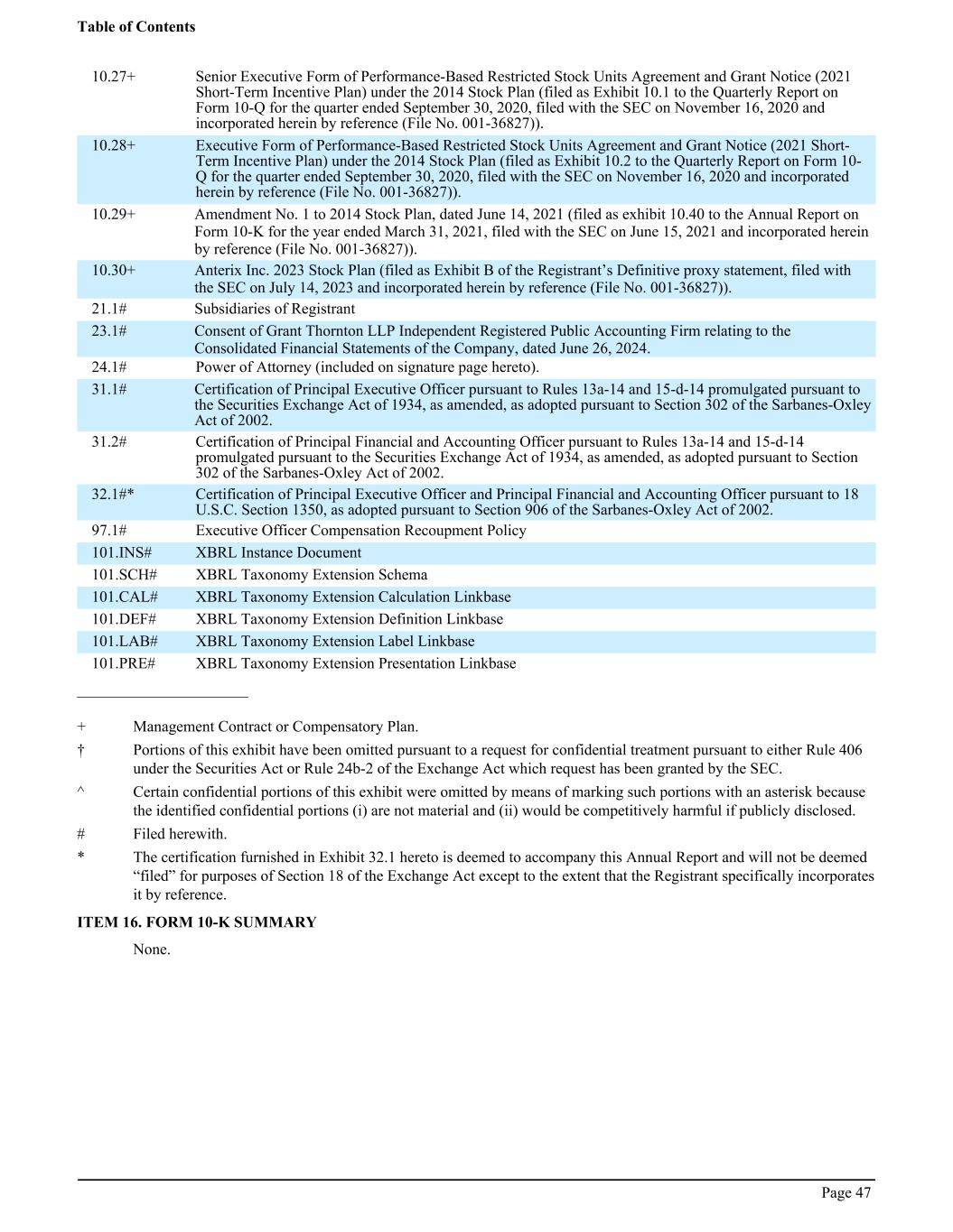 10.27+ Senior Executive Form of Performance-Based Restricted Stock Units Agreement and Grant Notice (2021 Short-Term Incentive Plan) under the 2014 Stock Plan (filed as Exhibit 10.1 to the Quarterly Report on Form 10-Q for the quarter ended September 30, 2020, filed with the SEC on November 16, 2020 and incorporated herein by reference (File No. 001-36827)). 10.28+ Executive Form of Performance-Based Restricted Stock Units Agreement and Grant Notice (2021 Short- Term Incentive Plan) under the 2014 Stock Plan (filed as Exhibit 10.2 to the Quarterly Report on Form 10- Q for the quarter ended September 30, 2020, filed with the SEC on November 16, 2020 and incorporated herein by reference (File No. 001-36827)). 10.29+ Amendment No. 1 to 2014 Stock Plan, dated June 14, 2021 (filed as exhibit 10.40 to the Annual Report on Form 10-K for the year ended March 31, 2021, filed with the SEC on June 15, 2021 and incorporated herein by reference (File No. 001-36827)). 10.30+ Anterix Inc. 2023 Stock Plan (filed as Exhibit B of the Registrant’s Definitive proxy statement, filed with the SEC on July 14, 2023 and incorporated herein by reference (File No. 001-36827)). 21.1# Subsidiaries of Registrant 23.1# Consent of Grant Thornton LLP Independent Registered Public Accounting Firm relating to the Consolidated Financial Statements of the Company, dated June 26, 2024. 24.1# Power of Attorney (included on signature page hereto). 31.1# Certification of Principal Executive Officer pursuant to Rules 13a-14 and 15-d-14 promulgated pursuant to the Securities Exchange Act of 1934, as amended, as adopted pursuant to Section 302 of the Sarbanes-Oxley Act of 2002. 31.2# Certification of Principal Financial and Accounting Officer pursuant to Rules 13a-14 and 15-d-14 promulgated pursuant to the Securities Exchange Act of 1934, as amended, as adopted pursuant to Section 302 of the Sarbanes-Oxley Act of 2002. 32.1#* Certification of Principal Executive Officer and Principal Financial and Accounting Officer pursuant to 18 U.S.C. Section 1350, as adopted pursuant to Section 906 of the Sarbanes-Oxley Act of 2002. 97.1# Executive Officer Compensation Recoupment Policy 101.INS# XBRL Instance Document 101.SCH# XBRL Taxonomy Extension Schema 101.CAL# XBRL Taxonomy Extension Calculation Linkbase 101.DEF# XBRL Taxonomy Extension Definition Linkbase 101.LAB# XBRL Taxonomy Extension Label Linkbase 101.PRE# XBRL Taxonomy Extension Presentation Linkbase ______________________ + Management Contract or Compensatory Plan. † Portions of this exhibit have been omitted pursuant to a request for confidential treatment pursuant to either Rule 406 under the Securities Act or Rule 24b-2 of the Exchange Act which request has been granted by the SEC. ^ Certain confidential portions of this exhibit were omitted by means of marking such portions with an asterisk because the identified confidential portions (i) are not material and (ii) would be competitively harmful if publicly disclosed. # Filed herewith. * The certification furnished in Exhibit 32.1 hereto is deemed to accompany this Annual Report and will not be deemed “filed” for purposes of Section 18 of the Exchange Act except to the extent that the Registrant specifically incorporates it by reference. ITEM 16. FORM 10-K SUMMARY None. Table of Contents Page 47