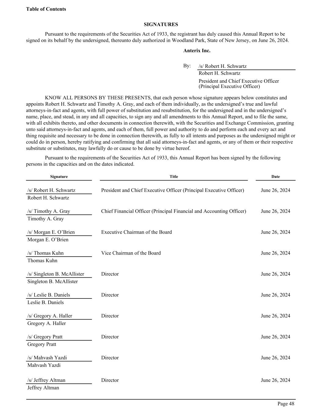 SIGNATURES Pursuant to the requirements of the Securities Act of 1933, the registrant has duly caused this Annual Report to be signed on its behalf by the undersigned, thereunto duly authorized in Woodland Park, State of New Jersey, on June 26, 2024. ͏ Anterix Inc. ͏ ͏ By: /s/ Robert H. Schwartz ͏ Robert H. Schwartz ͏ President and Chief Executive Officer (Principal Executive Officer) KNOW ALL PERSONS BY THESE PRESENTS, that each person whose signature appears below constitutes and appoints Robert H. Schwartz and Timothy A. Gray, and each of them individually, as the undersigned’s true and lawful attorneys-in-fact and agents, with full power of substitution and resubstitution, for the undersigned and in the undersigned’s name, place, and stead, in any and all capacities, to sign any and all amendments to this Annual Report, and to file the same, with all exhibits thereto, and other documents in connection therewith, with the Securities and Exchange Commission, granting unto said attorneys-in-fact and agents, and each of them, full power and authority to do and perform each and every act and thing requisite and necessary to be done in connection therewith, as fully to all intents and purposes as the undersigned might or could do in person, hereby ratifying and confirming that all said attorneys-in-fact and agents, or any of them or their respective substitute or substitutes, may lawfully do or cause to be done by virtue hereof. Pursuant to the requirements of the Securities Act of 1933, this Annual Report has been signed by the following persons in the capacities and on the dates indicated. Signature Title Date ͏ /s/ Robert H. Schwartz President and Chief Executive Officer (Principal Executive Officer) June 26, 2024 Robert H. Schwartz ͏ /s/ Timothy A. Gray Chief Financial Officer (Principal Financial and Accounting Officer) June 26, 2024 Timothy A. Gray ͏ /s/ Morgan E. O’Brien Executive Chairman of the Board June 26, 2024 Morgan E. O’Brien /s/ Thomas Kuhn Vice Chairman of the Board June 26, 2024 Thomas Kuhn /s/ Singleton B. McAllister Director June 26, 2024 Singleton B. McAllister ͏ /s/ Leslie B. Daniels Director June 26, 2024 Leslie B. Daniels ͏ /s/ Gregory A. Haller Director June 26, 2024 Gregory A. Haller ͏ /s/ Gregory Pratt Director June 26, 2024 Gregory Pratt ͏ /s/ Mahvash Yazdi Director June 26, 2024 Mahvash Yazdi /s/ Jeffrey Altman Director June 26, 2024 Jeffrey Altman Table of Contents Page 48