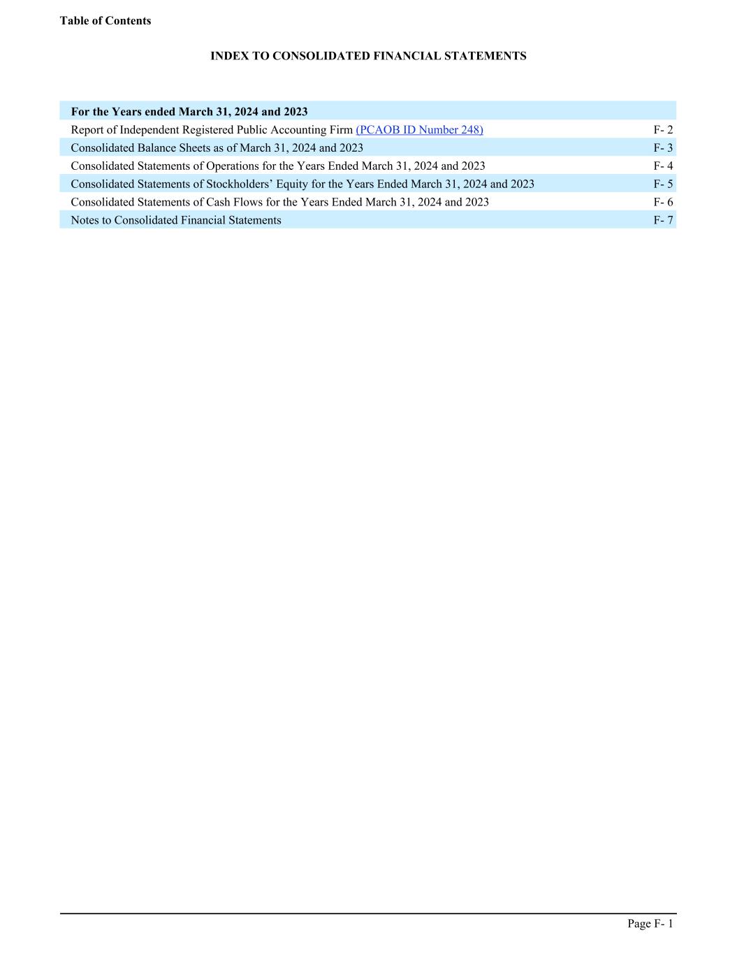 INDEX TO CONSOLIDATED FINANCIAL STATEMENTS For the Years ended March 31, 2024 and 2023 Report of Independent Registered Public Accounting Firm (PCAOB ID Number 248) F- 2 Consolidated Balance Sheets as of March 31, 2024 and 2023 F- 3 Consolidated Statements of Operations for the Years Ended March 31, 2024 and 2023 F- 4 Consolidated Statements of Stockholders’ Equity for the Years Ended March 31, 2024 and 2023 F- 5 Consolidated Statements of Cash Flows for the Years Ended March 31, 2024 and 2023 F- 6 Notes to Consolidated Financial Statements F- 7 Table of Contents Page F- 1