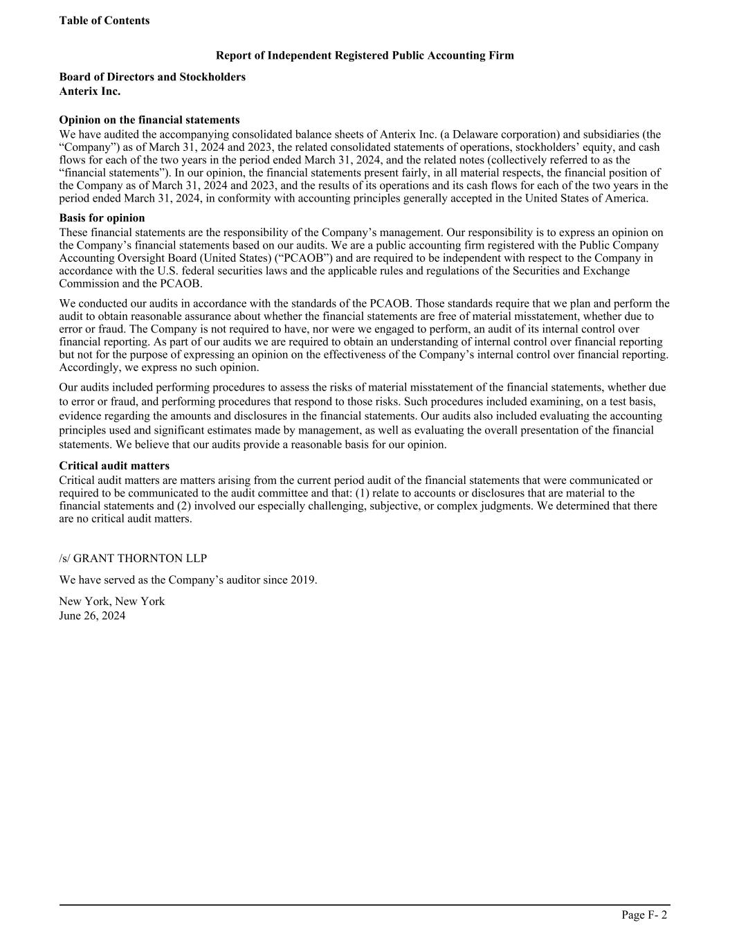 Report of Independent Registered Public Accounting Firm Board of Directors and Stockholders Anterix Inc. Opinion on the financial statements We have audited the accompanying consolidated balance sheets of Anterix Inc. (a Delaware corporation) and subsidiaries (the “Company”) as of March 31, 2024 and 2023, the related consolidated statements of operations, stockholders’ equity, and cash flows for each of the two years in the period ended March 31, 2024, and the related notes (collectively referred to as the “financial statements”). In our opinion, the financial statements present fairly, in all material respects, the financial position of the Company as of March 31, 2024 and 2023, and the results of its operations and its cash flows for each of the two years in the period ended March 31, 2024, in conformity with accounting principles generally accepted in the United States of America. Basis for opinion These financial statements are the responsibility of the Company’s management. Our responsibility is to express an opinion on the Company’s financial statements based on our audits. We are a public accounting firm registered with the Public Company Accounting Oversight Board (United States) (“PCAOB”) and are required to be independent with respect to the Company in accordance with the U.S. federal securities laws and the applicable rules and regulations of the Securities and Exchange Commission and the PCAOB. We conducted our audits in accordance with the standards of the PCAOB. Those standards require that we plan and perform the audit to obtain reasonable assurance about whether the financial statements are free of material misstatement, whether due to error or fraud. The Company is not required to have, nor were we engaged to perform, an audit of its internal control over financial reporting. As part of our audits we are required to obtain an understanding of internal control over financial reporting but not for the purpose of expressing an opinion on the effectiveness of the Company’s internal control over financial reporting. Accordingly, we express no such opinion. Our audits included performing procedures to assess the risks of material misstatement of the financial statements, whether due to error or fraud, and performing procedures that respond to those risks. Such procedures included examining, on a test basis, evidence regarding the amounts and disclosures in the financial statements. Our audits also included evaluating the accounting principles used and significant estimates made by management, as well as evaluating the overall presentation of the financial statements. We believe that our audits provide a reasonable basis for our opinion. Critical audit matters Critical audit matters are matters arising from the current period audit of the financial statements that were communicated or required to be communicated to the audit committee and that: (1) relate to accounts or disclosures that are material to the financial statements and (2) involved our especially challenging, subjective, or complex judgments. We determined that there are no critical audit matters. /s/ GRANT THORNTON LLP We have served as the Company’s auditor since 2019. New York, New York June 26, 2024 Table of Contents Page F- 2
