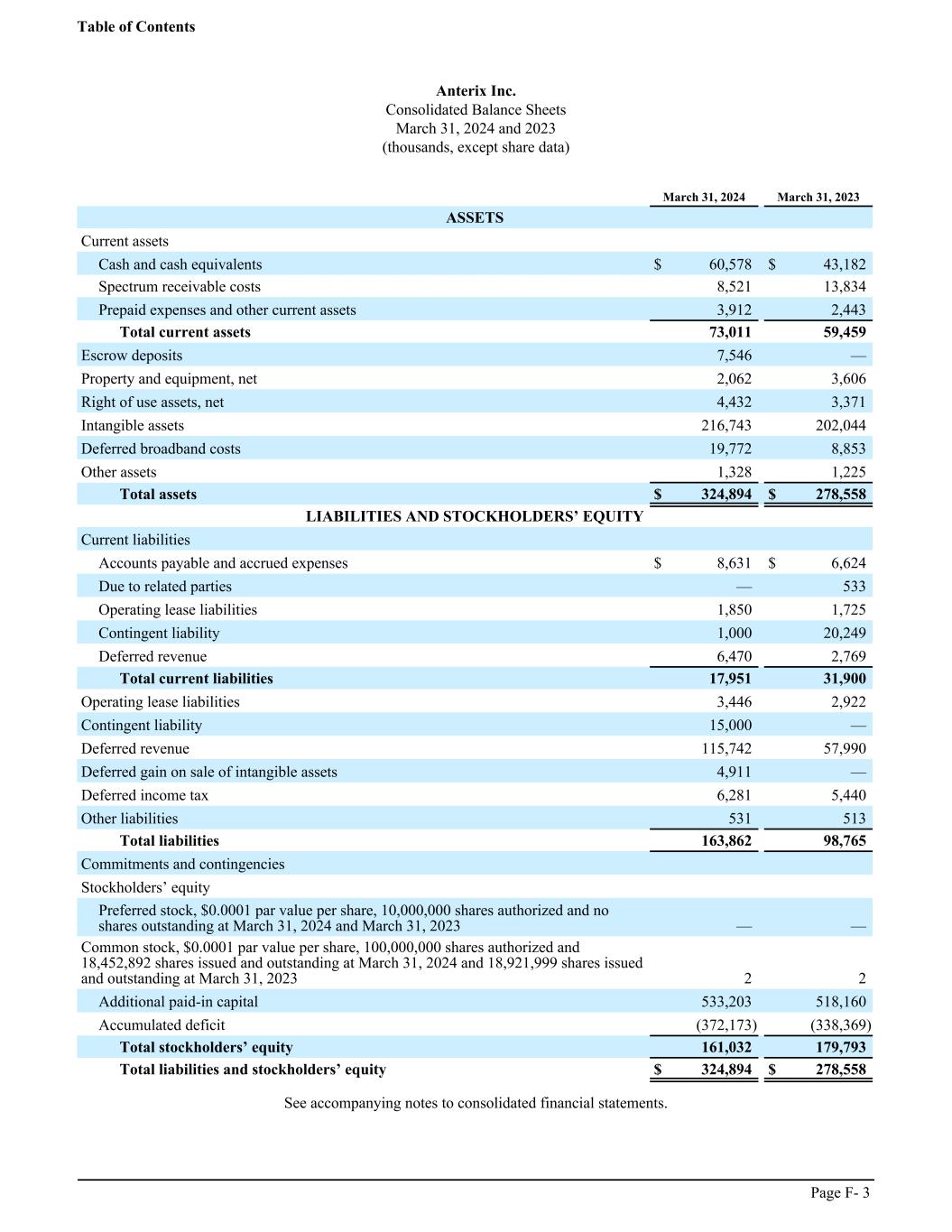 Anterix Inc. Consolidated Balance Sheets March 31, 2024 and 2023 (thousands, except share data) ͏ March 31, 2024 March 31, 2023 ASSETS Current assets Cash and cash equivalents $ 60,578 $ 43,182 Spectrum receivable costs 8,521 13,834 Prepaid expenses and other current assets 3,912 2,443 Total current assets 73,011 59,459 Escrow deposits 7,546 — Property and equipment, net 2,062 3,606 Right of use assets, net 4,432 3,371 Intangible assets 216,743 202,044 Deferred broadband costs 19,772 8,853 Other assets 1,328 1,225 Total assets $ 324,894 $ 278,558 LIABILITIES AND STOCKHOLDERS’ EQUITY Current liabilities Accounts payable and accrued expenses $ 8,631 $ 6,624 Due to related parties — 533 Operating lease liabilities 1,850 1,725 Contingent liability 1,000 20,249 Deferred revenue 6,470 2,769 Total current liabilities 17,951 31,900 Operating lease liabilities 3,446 2,922 Contingent liability 15,000 — Deferred revenue 115,742 57,990 Deferred gain on sale of intangible assets 4,911 — Deferred income tax 6,281 5,440 Other liabilities 531 513 Total liabilities 163,862 98,765 Commitments and contingencies Stockholders’ equity Preferred stock, $0.0001 par value per share, 10,000,000 shares authorized and no shares outstanding at March 31, 2024 and March 31, 2023 — — Common stock, $0.0001 par value per share, 100,000,000 shares authorized and 18,452,892 shares issued and outstanding at March 31, 2024 and 18,921,999 shares issued and outstanding at March 31, 2023 2 2 Additional paid-in capital 533,203 518,160 Accumulated deficit (372,173) (338,369) Total stockholders’ equity 161,032 179,793 Total liabilities and stockholders’ equity $ 324,894 $ 278,558 See accompanying notes to consolidated financial statements. Table of Contents Page F- 3