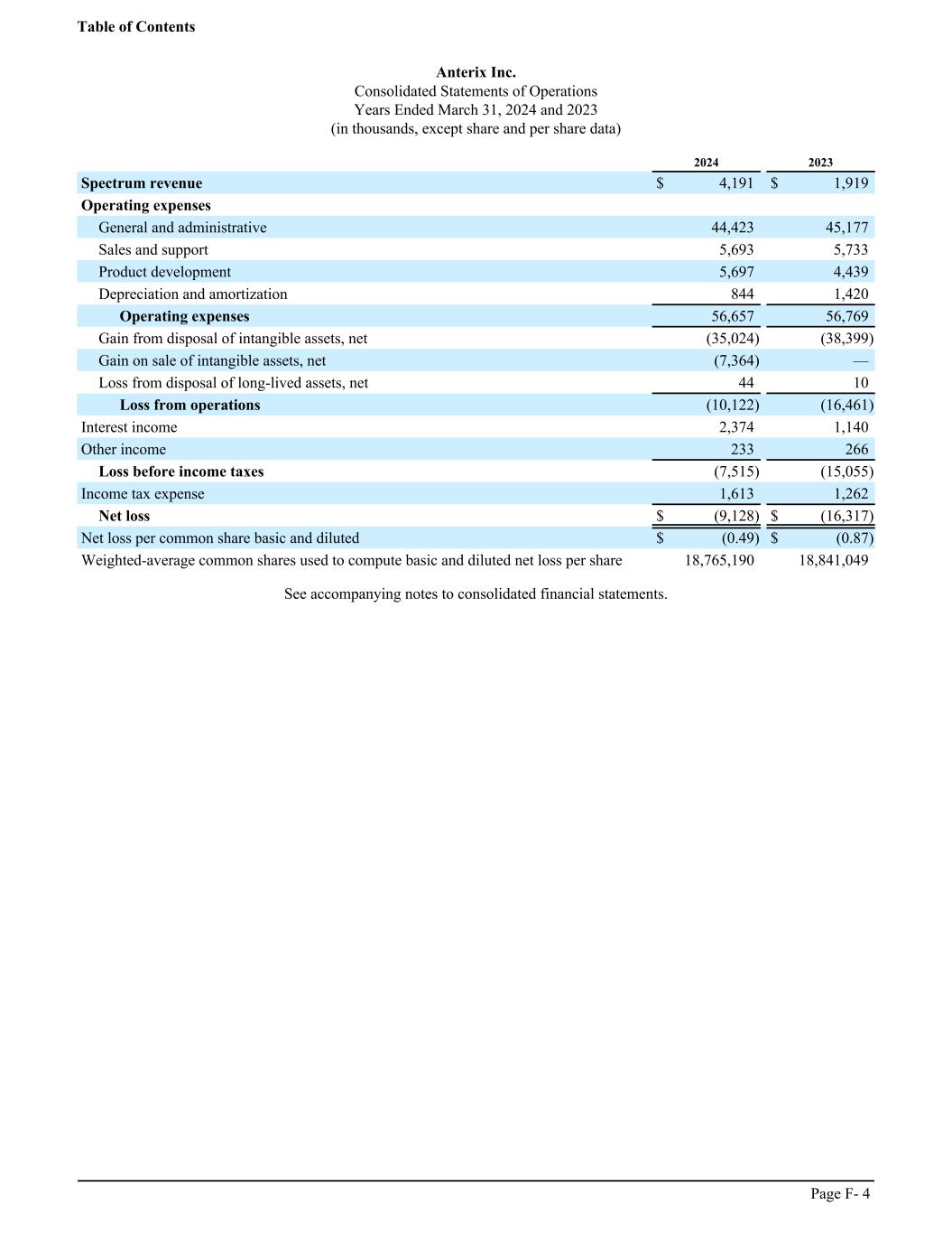Anterix Inc. Consolidated Statements of Operations Years Ended March 31, 2024 and 2023 (in thousands, except share and per share data) ͏ 2024 2023 Spectrum revenue $ 4,191 $ 1,919 Operating expenses General and administrative 44,423 45,177 Sales and support 5,693 5,733 Product development 5,697 4,439 Depreciation and amortization 844 1,420 Operating expenses 56,657 56,769 Gain from disposal of intangible assets, net (35,024) (38,399) Gain on sale of intangible assets, net (7,364) — Loss from disposal of long-lived assets, net 44 10 Loss from operations (10,122) (16,461) Interest income 2,374 1,140 Other income 233 266 Loss before income taxes (7,515) (15,055) Income tax expense 1,613 1,262 Net loss $ (9,128) $ (16,317) Net loss per common share basic and diluted $ (0.49) $ (0.87) Weighted-average common shares used to compute basic and diluted net loss per share 18,765,190 18,841,049 See accompanying notes to consolidated financial statements. Table of Contents Page F- 4