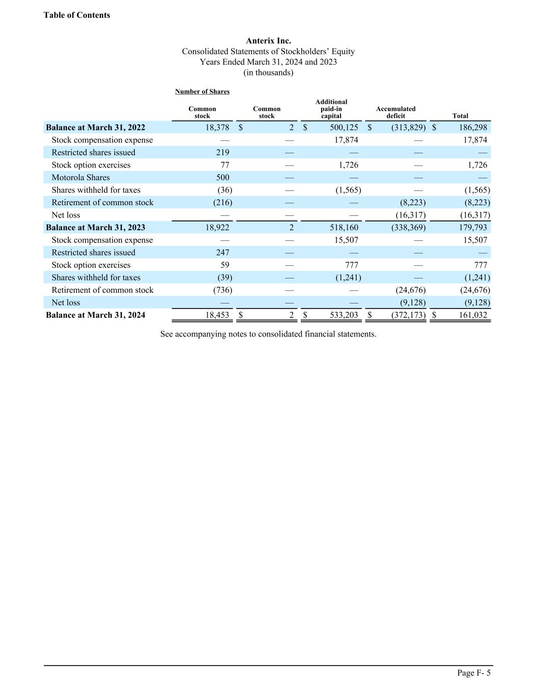 Anterix Inc. Consolidated Statements of Stockholders’ Equity Years Ended March 31, 2024 and 2023 (in thousands) ͏ Number of Shares ͏ Common stock Common stock Additional paid-in capital Accumulated deficit Total Balance at March 31, 2022 18,378 $ 2 $ 500,125 $ (313,829) $ 186,298 Stock compensation expense — — 17,874 — 17,874 Restricted shares issued 219 — — — — Stock option exercises 77 — 1,726 — 1,726 Motorola Shares 500 — — — — Shares withheld for taxes (36) — (1,565) — (1,565) Retirement of common stock (216) — — (8,223) (8,223) Net loss — — — (16,317) (16,317) Balance at March 31, 2023 18,922 2 518,160 (338,369) 179,793 Stock compensation expense — — 15,507 — 15,507 Restricted shares issued 247 — — — — Stock option exercises 59 — 777 — 777 Shares withheld for taxes (39) — (1,241) — (1,241) Retirement of common stock (736) — — (24,676) (24,676) Net loss — — — (9,128) (9,128) Balance at March 31, 2024 18,453 $ 2 $ 533,203 $ (372,173) $ 161,032 See accompanying notes to consolidated financial statements. Table of Contents Page F- 5
