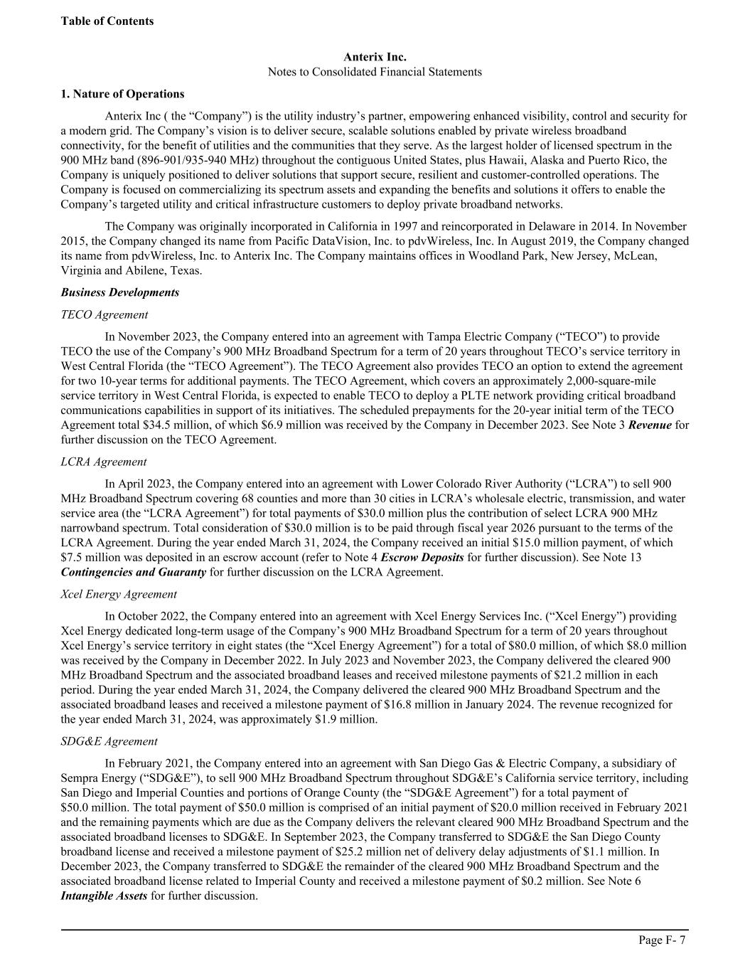 Anterix Inc. Notes to Consolidated Financial Statements 1. Nature of Operations Anterix Inc ( the “Company”) is the utility industry’s partner, empowering enhanced visibility, control and security for a modern grid. The Company’s vision is to deliver secure, scalable solutions enabled by private wireless broadband connectivity, for the benefit of utilities and the communities that they serve. As the largest holder of licensed spectrum in the 900 MHz band (896-901/935-940 MHz) throughout the contiguous United States, plus Hawaii, Alaska and Puerto Rico, the Company is uniquely positioned to deliver solutions that support secure, resilient and customer-controlled operations. The Company is focused on commercializing its spectrum assets and expanding the benefits and solutions it offers to enable the Company’s targeted utility and critical infrastructure customers to deploy private broadband networks. The Company was originally incorporated in California in 1997 and reincorporated in Delaware in 2014. In November 2015, the Company changed its name from Pacific DataVision, Inc. to pdvWireless, Inc. In August 2019, the Company changed its name from pdvWireless, Inc. to Anterix Inc. The Company maintains offices in Woodland Park, New Jersey, McLean, Virginia and Abilene, Texas. Business Developments TECO Agreement In November 2023, the Company entered into an agreement with Tampa Electric Company (“TECO”) to provide TECO the use of the Company’s 900 MHz Broadband Spectrum for a term of 20 years throughout TECO’s service territory in West Central Florida (the “TECO Agreement”). The TECO Agreement also provides TECO an option to extend the agreement for two 10-year terms for additional payments. The TECO Agreement, which covers an approximately 2,000-square-mile service territory in West Central Florida, is expected to enable TECO to deploy a PLTE network providing critical broadband communications capabilities in support of its initiatives. The scheduled prepayments for the 20-year initial term of the TECO Agreement total $34.5 million, of which $6.9 million was received by the Company in December 2023. See Note 3 Revenue for further discussion on the TECO Agreement. LCRA Agreement In April 2023, the Company entered into an agreement with Lower Colorado River Authority (“LCRA”) to sell 900 MHz Broadband Spectrum covering 68 counties and more than 30 cities in LCRA’s wholesale electric, transmission, and water service area (the “LCRA Agreement”) for total payments of $30.0 million plus the contribution of select LCRA 900 MHz narrowband spectrum. Total consideration of $30.0 million is to be paid through fiscal year 2026 pursuant to the terms of the LCRA Agreement. During the year ended March 31, 2024, the Company received an initial $15.0 million payment, of which $7.5 million was deposited in an escrow account (refer to Note 4 Escrow Deposits for further discussion). See Note 13 Contingencies and Guaranty for further discussion on the LCRA Agreement. Xcel Energy Agreement In October 2022, the Company entered into an agreement with Xcel Energy Services Inc. (“Xcel Energy”) providing Xcel Energy dedicated long-term usage of the Company’s 900 MHz Broadband Spectrum for a term of 20 years throughout Xcel Energy’s service territory in eight states (the “Xcel Energy Agreement”) for a total of $80.0 million, of which $8.0 million was received by the Company in December 2022. In July 2023 and November 2023, the Company delivered the cleared 900 MHz Broadband Spectrum and the associated broadband leases and received milestone payments of $21.2 million in each period. During the year ended March 31, 2024, the Company delivered the cleared 900 MHz Broadband Spectrum and the associated broadband leases and received a milestone payment of $16.8 million in January 2024. The revenue recognized for the year ended March 31, 2024, was approximately $1.9 million. SDG&E Agreement In February 2021, the Company entered into an agreement with San Diego Gas & Electric Company, a subsidiary of Sempra Energy (“SDG&E”), to sell 900 MHz Broadband Spectrum throughout SDG&E’s California service territory, including San Diego and Imperial Counties and portions of Orange County (the “SDG&E Agreement”) for a total payment of $50.0 million. The total payment of $50.0 million is comprised of an initial payment of $20.0 million received in February 2021 and the remaining payments which are due as the Company delivers the relevant cleared 900 MHz Broadband Spectrum and the associated broadband licenses to SDG&E. In September 2023, the Company transferred to SDG&E the San Diego County broadband license and received a milestone payment of $25.2 million net of delivery delay adjustments of $1.1 million. In December 2023, the Company transferred to SDG&E the remainder of the cleared 900 MHz Broadband Spectrum and the associated broadband license related to Imperial County and received a milestone payment of $0.2 million. See Note 6 Intangible Assets for further discussion. Table of Contents Page F- 7