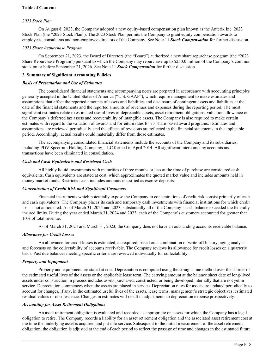 2023 Stock Plan On August 8, 2023, the Company adopted a new equity-based compensation plan known as the Anterix Inc. 2023 Stock Plan (the “2023 Stock Plan”). The 2023 Stock Plan permits the Company to grant equity compensation awards to employees, consultants and non-employee directors of the Company. See Note 11 Stock Compensation for further discussion. 2023 Share Repurchase Program On September 21, 2023, the Board of Directors (the “Board”) authorized a new share repurchase program (the “2023 Share Repurchase Program”) pursuant to which the Company may repurchase up to $250.0 million of the Company’s common stock on or before September 21, 2026. See Note 11 Stock Compensation for further discussion. 2. Summary of Significant Accounting Policies Basis of Presentation and Use of Estimates The consolidated financial statements and accompanying notes are prepared in accordance with accounting principles generally accepted in the United States of America (“U.S. GAAP”), which require management to make estimates and assumptions that affect the reported amounts of assets and liabilities and disclosure of contingent assets and liabilities at the date of the financial statements and the reported amounts of revenues and expenses during the reporting period. The most significant estimates relate to estimated useful lives of depreciable assets, asset retirement obligations, valuation allowance on the Company’s deferred tax assets and recoverability of intangible assets. The Company is also required to make certain estimates with regard to the valuation of awards and forfeiture rates for its share-based award programs. Estimates and assumptions are reviewed periodically, and the effects of revisions are reflected in the financial statements in the applicable period. Accordingly, actual results could materially differ from those estimates. The accompanying consolidated financial statements include the accounts of the Company and its subsidiaries, including PDV Spectrum Holding Company, LLC formed in April 2014. All significant intercompany accounts and transactions have been eliminated in consolidation. Cash and Cash Equivalents and Restricted Cash All highly liquid investments with maturities of three months or less at the time of purchase are considered cash equivalents. Cash equivalents are stated at cost, which approximates the quoted market value and includes amounts held in money market funds. Restricted cash includes amounts classified as escrow deposits. Concentration of Credit Risk and Significant Customers Financial instruments which potentially expose the Company to concentrations of credit risk consist primarily of cash and cash equivalents. The Company places its cash and temporary cash investments with financial institutions for which credit loss is not anticipated. As of March 31, 2024 and 2023, substantially all of the Company’s cash balance exceeded the federally insured limits. During the year ended March 31, 2024 and 2023, each of the Company’s customers accounted for greater than 10% of total revenue. As of March 31, 2024 and March 31, 2023, the Company does not have an outstanding accounts receivable balance. Allowance for Credit Losses An allowance for credit losses is estimated, as required, based on a combination of write-off history, aging analysis and forecasts on the collectability of accounts receivable. The Company reviews its allowance for credit losses on a quarterly basis. Past due balances meeting specific criteria are reviewed individually for collectability. Property and Equipment Property and equipment are stated at cost. Depreciation is computed using the straight-line method over the shorter of the estimated useful lives of the assets or the applicable lease term. The carrying amount at the balance sheet date of long-lived assets under construction in process includes assets purchased, constructed, or being developed internally that are not yet in service. Depreciation commences when the assets are placed in service. Depreciation rates for assets are updated periodically to account for changes, if any, in the estimated useful lives of the assets, lease terms, management’s strategic objectives, estimated residual values or obsolescence. Changes in estimates will result in adjustments to depreciation expense prospectively. Accounting for Asset Retirement Obligations An asset retirement obligation is evaluated and recorded as appropriate on assets for which the Company has a legal obligation to retire. The Company records a liability for an asset retirement obligation and the associated asset retirement cost at the time the underlying asset is acquired and put into service. Subsequent to the initial measurement of the asset retirement obligation, the obligation is adjusted at the end of each period to reflect the passage of time and changes in the estimated future Table of Contents Page F- 8