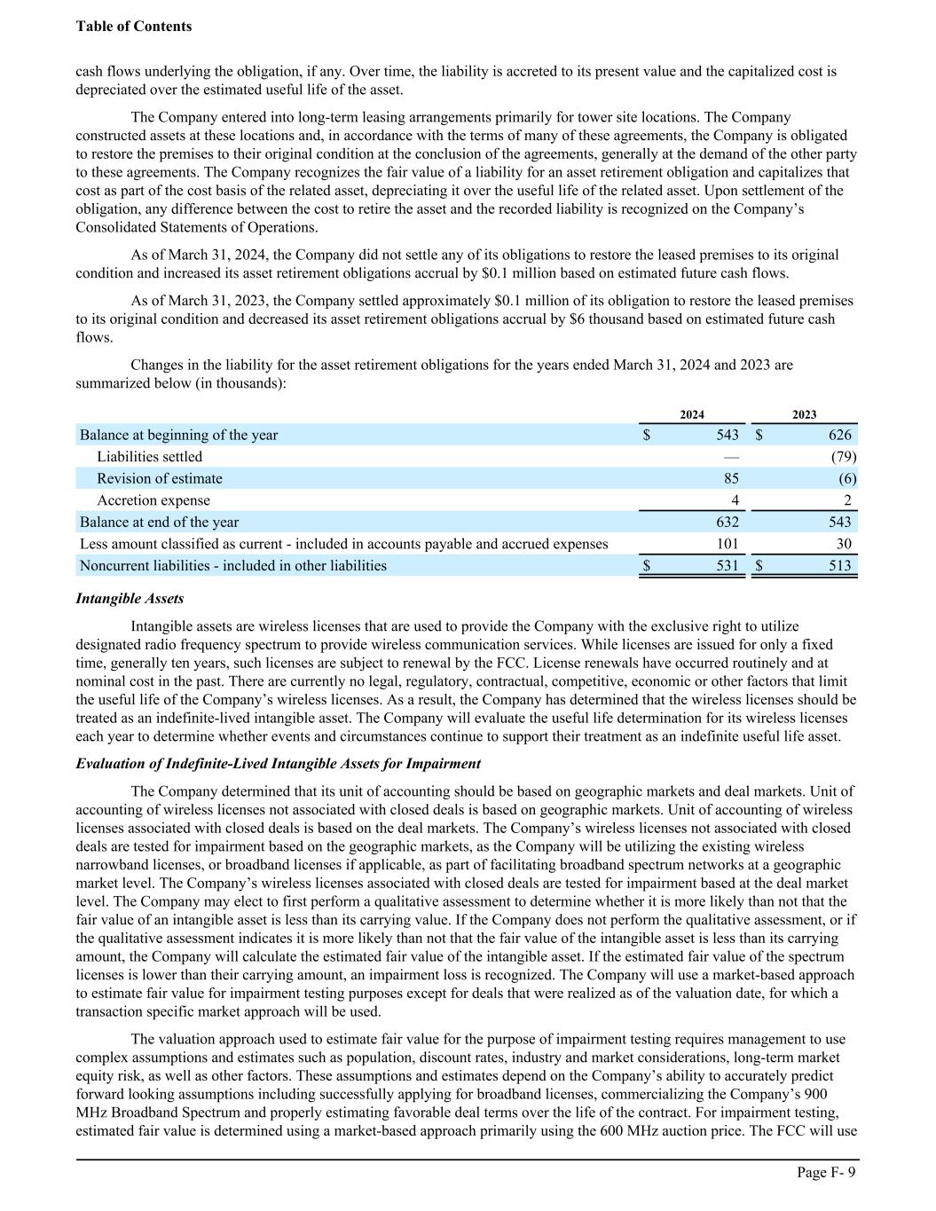 cash flows underlying the obligation, if any. Over time, the liability is accreted to its present value and the capitalized cost is depreciated over the estimated useful life of the asset. The Company entered into long-term leasing arrangements primarily for tower site locations. The Company constructed assets at these locations and, in accordance with the terms of many of these agreements, the Company is obligated to restore the premises to their original condition at the conclusion of the agreements, generally at the demand of the other party to these agreements. The Company recognizes the fair value of a liability for an asset retirement obligation and capitalizes that cost as part of the cost basis of the related asset, depreciating it over the useful life of the related asset. Upon settlement of the obligation, any difference between the cost to retire the asset and the recorded liability is recognized on the Company’s Consolidated Statements of Operations. As of March 31, 2024, the Company did not settle any of its obligations to restore the leased premises to its original condition and increased its asset retirement obligations accrual by $0.1 million based on estimated future cash flows. As of March 31, 2023, the Company settled approximately $0.1 million of its obligation to restore the leased premises to its original condition and decreased its asset retirement obligations accrual by $6 thousand based on estimated future cash flows. Changes in the liability for the asset retirement obligations for the years ended March 31, 2024 and 2023 are summarized below (in thousands): ͏ 2024 2023 Balance at beginning of the year $ 543 $ 626 Liabilities settled — (79) Revision of estimate 85 (6) Accretion expense 4 2 Balance at end of the year 632 543 Less amount classified as current - included in accounts payable and accrued expenses 101 30 Noncurrent liabilities - included in other liabilities $ 531 $ 513 Intangible Assets Intangible assets are wireless licenses that are used to provide the Company with the exclusive right to utilize designated radio frequency spectrum to provide wireless communication services. While licenses are issued for only a fixed time, generally ten years, such licenses are subject to renewal by the FCC. License renewals have occurred routinely and at nominal cost in the past. There are currently no legal, regulatory, contractual, competitive, economic or other factors that limit the useful life of the Company’s wireless licenses. As a result, the Company has determined that the wireless licenses should be treated as an indefinite-lived intangible asset. The Company will evaluate the useful life determination for its wireless licenses each year to determine whether events and circumstances continue to support their treatment as an indefinite useful life asset. Evaluation of Indefinite-Lived Intangible Assets for Impairment The Company determined that its unit of accounting should be based on geographic markets and deal markets. Unit of accounting of wireless licenses not associated with closed deals is based on geographic markets. Unit of accounting of wireless licenses associated with closed deals is based on the deal markets. The Company’s wireless licenses not associated with closed deals are tested for impairment based on the geographic markets, as the Company will be utilizing the existing wireless narrowband licenses, or broadband licenses if applicable, as part of facilitating broadband spectrum networks at a geographic market level. The Company’s wireless licenses associated with closed deals are tested for impairment based at the deal market level. The Company may elect to first perform a qualitative assessment to determine whether it is more likely than not that the fair value of an intangible asset is less than its carrying value. If the Company does not perform the qualitative assessment, or if the qualitative assessment indicates it is more likely than not that the fair value of the intangible asset is less than its carrying amount, the Company will calculate the estimated fair value of the intangible asset. If the estimated fair value of the spectrum licenses is lower than their carrying amount, an impairment loss is recognized. The Company will use a market-based approach to estimate fair value for impairment testing purposes except for deals that were realized as of the valuation date, for which a transaction specific market approach will be used. The valuation approach used to estimate fair value for the purpose of impairment testing requires management to use complex assumptions and estimates such as population, discount rates, industry and market considerations, long-term market equity risk, as well as other factors. These assumptions and estimates depend on the Company’s ability to accurately predict forward looking assumptions including successfully applying for broadband licenses, commercializing the Company’s 900 MHz Broadband Spectrum and properly estimating favorable deal terms over the life of the contract. For impairment testing, estimated fair value is determined using a market-based approach primarily using the 600 MHz auction price. The FCC will use Table of Contents Page F- 9