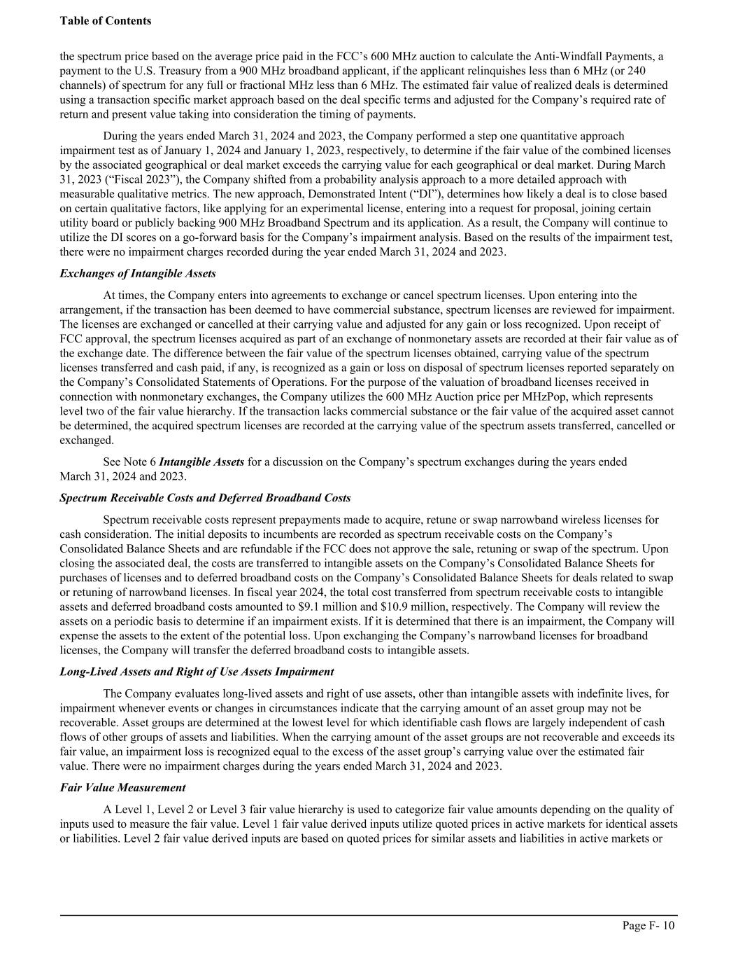 the spectrum price based on the average price paid in the FCC’s 600 MHz auction to calculate the Anti-Windfall Payments, a payment to the U.S. Treasury from a 900 MHz broadband applicant, if the applicant relinquishes less than 6 MHz (or 240 channels) of spectrum for any full or fractional MHz less than 6 MHz. The estimated fair value of realized deals is determined using a transaction specific market approach based on the deal specific terms and adjusted for the Company’s required rate of return and present value taking into consideration the timing of payments. During the years ended March 31, 2024 and 2023, the Company performed a step one quantitative approach impairment test as of January 1, 2024 and January 1, 2023, respectively, to determine if the fair value of the combined licenses by the associated geographical or deal market exceeds the carrying value for each geographical or deal market. During March 31, 2023 (“Fiscal 2023”), the Company shifted from a probability analysis approach to a more detailed approach with measurable qualitative metrics. The new approach, Demonstrated Intent (“DI”), determines how likely a deal is to close based on certain qualitative factors, like applying for an experimental license, entering into a request for proposal, joining certain utility board or publicly backing 900 MHz Broadband Spectrum and its application. As a result, the Company will continue to utilize the DI scores on a go-forward basis for the Company’s impairment analysis. Based on the results of the impairment test, there were no impairment charges recorded during the year ended March 31, 2024 and 2023. Exchanges of Intangible Assets At times, the Company enters into agreements to exchange or cancel spectrum licenses. Upon entering into the arrangement, if the transaction has been deemed to have commercial substance, spectrum licenses are reviewed for impairment. The licenses are exchanged or cancelled at their carrying value and adjusted for any gain or loss recognized. Upon receipt of FCC approval, the spectrum licenses acquired as part of an exchange of nonmonetary assets are recorded at their fair value as of the exchange date. The difference between the fair value of the spectrum licenses obtained, carrying value of the spectrum licenses transferred and cash paid, if any, is recognized as a gain or loss on disposal of spectrum licenses reported separately on the Company’s Consolidated Statements of Operations. For the purpose of the valuation of broadband licenses received in connection with nonmonetary exchanges, the Company utilizes the 600 MHz Auction price per MHzPop, which represents level two of the fair value hierarchy. If the transaction lacks commercial substance or the fair value of the acquired asset cannot be determined, the acquired spectrum licenses are recorded at the carrying value of the spectrum assets transferred, cancelled or exchanged. See Note 6 Intangible Assets for a discussion on the Company’s spectrum exchanges during the years ended March 31, 2024 and 2023. Spectrum Receivable Costs and Deferred Broadband Costs Spectrum receivable costs represent prepayments made to acquire, retune or swap narrowband wireless licenses for cash consideration. The initial deposits to incumbents are recorded as spectrum receivable costs on the Company’s Consolidated Balance Sheets and are refundable if the FCC does not approve the sale, retuning or swap of the spectrum. Upon closing the associated deal, the costs are transferred to intangible assets on the Company’s Consolidated Balance Sheets for purchases of licenses and to deferred broadband costs on the Company’s Consolidated Balance Sheets for deals related to swap or retuning of narrowband licenses. In fiscal year 2024, the total cost transferred from spectrum receivable costs to intangible assets and deferred broadband costs amounted to $9.1 million and $10.9 million, respectively. The Company will review the assets on a periodic basis to determine if an impairment exists. If it is determined that there is an impairment, the Company will expense the assets to the extent of the potential loss. Upon exchanging the Company’s narrowband licenses for broadband licenses, the Company will transfer the deferred broadband costs to intangible assets. Long-Lived Assets and Right of Use Assets Impairment The Company evaluates long-lived assets and right of use assets, other than intangible assets with indefinite lives, for impairment whenever events or changes in circumstances indicate that the carrying amount of an asset group may not be recoverable. Asset groups are determined at the lowest level for which identifiable cash flows are largely independent of cash flows of other groups of assets and liabilities. When the carrying amount of the asset groups are not recoverable and exceeds its fair value, an impairment loss is recognized equal to the excess of the asset group’s carrying value over the estimated fair value. There were no impairment charges during the years ended March 31, 2024 and 2023. Fair Value Measurement A Level 1, Level 2 or Level 3 fair value hierarchy is used to categorize fair value amounts depending on the quality of inputs used to measure the fair value. Level 1 fair value derived inputs utilize quoted prices in active markets for identical assets or liabilities. Level 2 fair value derived inputs are based on quoted prices for similar assets and liabilities in active markets or Table of Contents Page F- 10