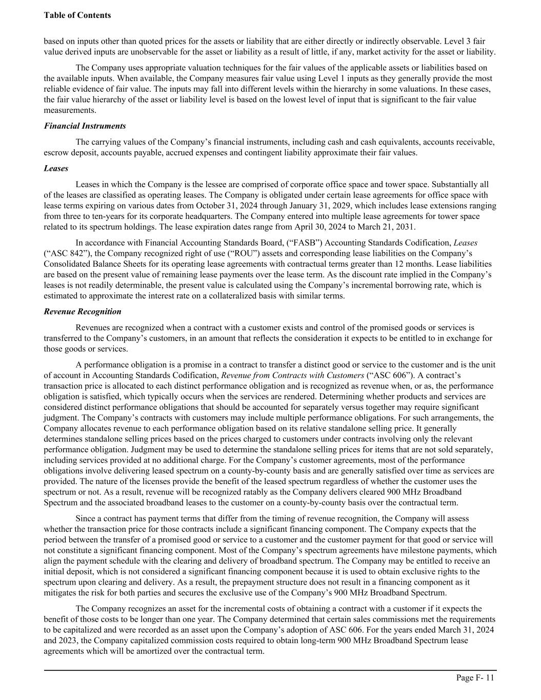 based on inputs other than quoted prices for the assets or liability that are either directly or indirectly observable. Level 3 fair value derived inputs are unobservable for the asset or liability as a result of little, if any, market activity for the asset or liability. The Company uses appropriate valuation techniques for the fair values of the applicable assets or liabilities based on the available inputs. When available, the Company measures fair value using Level 1 inputs as they generally provide the most reliable evidence of fair value. The inputs may fall into different levels within the hierarchy in some valuations. In these cases, the fair value hierarchy of the asset or liability level is based on the lowest level of input that is significant to the fair value measurements. Financial Instruments The carrying values of the Company’s financial instruments, including cash and cash equivalents, accounts receivable, escrow deposit, accounts payable, accrued expenses and contingent liability approximate their fair values. Leases Leases in which the Company is the lessee are comprised of corporate office space and tower space. Substantially all of the leases are classified as operating leases. The Company is obligated under certain lease agreements for office space with lease terms expiring on various dates from October 31, 2024 through January 31, 2029, which includes lease extensions ranging from three to ten-years for its corporate headquarters. The Company entered into multiple lease agreements for tower space related to its spectrum holdings. The lease expiration dates range from April 30, 2024 to March 21, 2031. In accordance with Financial Accounting Standards Board, (“FASB”) Accounting Standards Codification, Leases (“ASC 842”), the Company recognized right of use (“ROU”) assets and corresponding lease liabilities on the Company’s Consolidated Balance Sheets for its operating lease agreements with contractual terms greater than 12 months. Lease liabilities are based on the present value of remaining lease payments over the lease term. As the discount rate implied in the Company’s leases is not readily determinable, the present value is calculated using the Company’s incremental borrowing rate, which is estimated to approximate the interest rate on a collateralized basis with similar terms. Revenue Recognition Revenues are recognized when a contract with a customer exists and control of the promised goods or services is transferred to the Company’s customers, in an amount that reflects the consideration it expects to be entitled to in exchange for those goods or services. A performance obligation is a promise in a contract to transfer a distinct good or service to the customer and is the unit of account in Accounting Standards Codification, Revenue from Contracts with Customers (“ASC 606”). A contract’s transaction price is allocated to each distinct performance obligation and is recognized as revenue when, or as, the performance obligation is satisfied, which typically occurs when the services are rendered. Determining whether products and services are considered distinct performance obligations that should be accounted for separately versus together may require significant judgment. The Company’s contracts with customers may include multiple performance obligations. For such arrangements, the Company allocates revenue to each performance obligation based on its relative standalone selling price. It generally determines standalone selling prices based on the prices charged to customers under contracts involving only the relevant performance obligation. Judgment may be used to determine the standalone selling prices for items that are not sold separately, including services provided at no additional charge. For the Company’s customer agreements, most of the performance obligations involve delivering leased spectrum on a county-by-county basis and are generally satisfied over time as services are provided. The nature of the licenses provide the benefit of the leased spectrum regardless of whether the customer uses the spectrum or not. As a result, revenue will be recognized ratably as the Company delivers cleared 900 MHz Broadband Spectrum and the associated broadband leases to the customer on a county-by-county basis over the contractual term. Since a contract has payment terms that differ from the timing of revenue recognition, the Company will assess whether the transaction price for those contracts include a significant financing component. The Company expects that the period between the transfer of a promised good or service to a customer and the customer payment for that good or service will not constitute a significant financing component. Most of the Company’s spectrum agreements have milestone payments, which align the payment schedule with the clearing and delivery of broadband spectrum. The Company may be entitled to receive an initial deposit, which is not considered a significant financing component because it is used to obtain exclusive rights to the spectrum upon clearing and delivery. As a result, the prepayment structure does not result in a financing component as it mitigates the risk for both parties and secures the exclusive use of the Company’s 900 MHz Broadband Spectrum. The Company recognizes an asset for the incremental costs of obtaining a contract with a customer if it expects the benefit of those costs to be longer than one year. The Company determined that certain sales commissions met the requirements to be capitalized and were recorded as an asset upon the Company’s adoption of ASC 606. For the years ended March 31, 2024 and 2023, the Company capitalized commission costs required to obtain long-term 900 MHz Broadband Spectrum lease agreements which will be amortized over the contractual term. Table of Contents Page F- 11