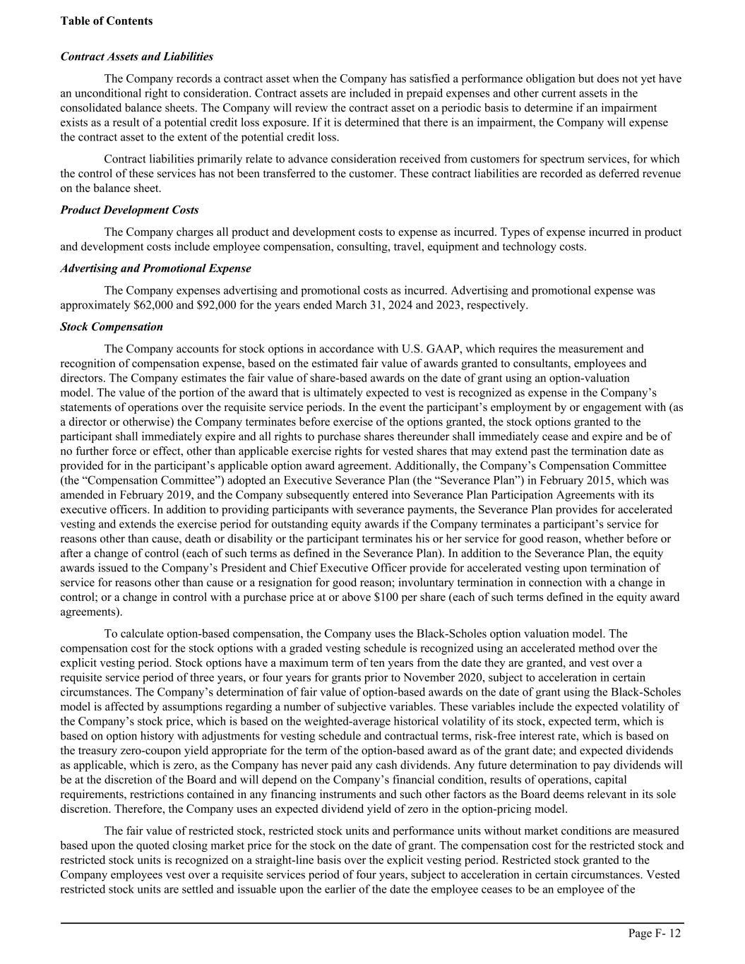 Contract Assets and Liabilities The Company records a contract asset when the Company has satisfied a performance obligation but does not yet have an unconditional right to consideration. Contract assets are included in prepaid expenses and other current assets in the consolidated balance sheets. The Company will review the contract asset on a periodic basis to determine if an impairment exists as a result of a potential credit loss exposure. If it is determined that there is an impairment, the Company will expense the contract asset to the extent of the potential credit loss. Contract liabilities primarily relate to advance consideration received from customers for spectrum services, for which the control of these services has not been transferred to the customer. These contract liabilities are recorded as deferred revenue on the balance sheet. Product Development Costs The Company charges all product and development costs to expense as incurred. Types of expense incurred in product and development costs include employee compensation, consulting, travel, equipment and technology costs. Advertising and Promotional Expense The Company expenses advertising and promotional costs as incurred. Advertising and promotional expense was approximately $62,000 and $92,000 for the years ended March 31, 2024 and 2023, respectively. Stock Compensation The Company accounts for stock options in accordance with U.S. GAAP, which requires the measurement and recognition of compensation expense, based on the estimated fair value of awards granted to consultants, employees and directors. The Company estimates the fair value of share-based awards on the date of grant using an option-valuation model. The value of the portion of the award that is ultimately expected to vest is recognized as expense in the Company’s statements of operations over the requisite service periods. In the event the participant’s employment by or engagement with (as a director or otherwise) the Company terminates before exercise of the options granted, the stock options granted to the participant shall immediately expire and all rights to purchase shares thereunder shall immediately cease and expire and be of no further force or effect, other than applicable exercise rights for vested shares that may extend past the termination date as provided for in the participant’s applicable option award agreement. Additionally, the Company’s Compensation Committee (the “Compensation Committee”) adopted an Executive Severance Plan (the “Severance Plan”) in February 2015, which was amended in February 2019, and the Company subsequently entered into Severance Plan Participation Agreements with its executive officers. In addition to providing participants with severance payments, the Severance Plan provides for accelerated vesting and extends the exercise period for outstanding equity awards if the Company terminates a participant’s service for reasons other than cause, death or disability or the participant terminates his or her service for good reason, whether before or after a change of control (each of such terms as defined in the Severance Plan). In addition to the Severance Plan, the equity awards issued to the Company’s President and Chief Executive Officer provide for accelerated vesting upon termination of service for reasons other than cause or a resignation for good reason; involuntary termination in connection with a change in control; or a change in control with a purchase price at or above $100 per share (each of such terms defined in the equity award agreements). To calculate option-based compensation, the Company uses the Black-Scholes option valuation model. The compensation cost for the stock options with a graded vesting schedule is recognized using an accelerated method over the explicit vesting period. Stock options have a maximum term of ten years from the date they are granted, and vest over a requisite service period of three years, or four years for grants prior to November 2020, subject to acceleration in certain circumstances. The Company’s determination of fair value of option-based awards on the date of grant using the Black-Scholes model is affected by assumptions regarding a number of subjective variables. These variables include the expected volatility of the Company’s stock price, which is based on the weighted-average historical volatility of its stock, expected term, which is based on option history with adjustments for vesting schedule and contractual terms, risk-free interest rate, which is based on the treasury zero-coupon yield appropriate for the term of the option-based award as of the grant date; and expected dividends as applicable, which is zero, as the Company has never paid any cash dividends. Any future determination to pay dividends will be at the discretion of the Board and will depend on the Company’s financial condition, results of operations, capital requirements, restrictions contained in any financing instruments and such other factors as the Board deems relevant in its sole discretion. Therefore, the Company uses an expected dividend yield of zero in the option-pricing model. The fair value of restricted stock, restricted stock units and performance units without market conditions are measured based upon the quoted closing market price for the stock on the date of grant. The compensation cost for the restricted stock and restricted stock units is recognized on a straight-line basis over the explicit vesting period. Restricted stock granted to the Company employees vest over a requisite services period of four years, subject to acceleration in certain circumstances. Vested restricted stock units are settled and issuable upon the earlier of the date the employee ceases to be an employee of the Table of Contents Page F- 12