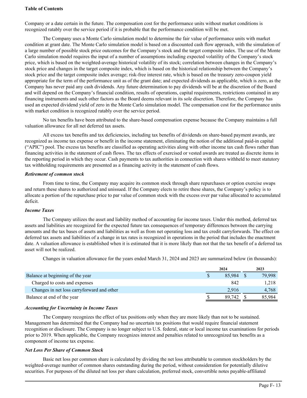 Company or a date certain in the future. The compensation cost for the performance units without market conditions is recognized ratably over the service period if it is probable that the performance condition will be met. The Company uses a Monte Carlo simulation model to determine the fair value of performance units with market condition at grant date. The Monte Carlo simulation model is based on a discounted cash flow approach, with the simulation of a large number of possible stock price outcomes for the Company’s stock and the target composite index. The use of the Monte Carlo simulation model requires the input of a number of assumptions including expected volatility of the Company’s stock price, which is based on the weighted-average historical volatility of its stock; correlation between changes in the Company’s stock price and changes in the target composite index, which is based on the historical relationship between the Company’s stock price and the target composite index average; risk-free interest rate, which is based on the treasury zero-coupon yield appropriate for the term of the performance unit as of the grant date; and expected dividends as applicable, which is zero, as the Company has never paid any cash dividends. Any future determination to pay dividends will be at the discretion of the Board and will depend on the Company’s financial condition, results of operations, capital requirements, restrictions contained in any financing instruments and such other factors as the Board deems relevant in its sole discretion. Therefore, the Company has used an expected dividend yield of zero in the Monte Carlo simulation model. The compensation cost for the performance units with market condition is recognized ratably over the service period. No tax benefits have been attributed to the share-based compensation expense because the Company maintains a full valuation allowance for all net deferred tax assets. All excess tax benefits and tax deficiencies, including tax benefits of dividends on share-based payment awards, are recognized as income tax expense or benefit in the income statement, eliminating the notion of the additional paid-in capital (“APIC”) pool. The excess tax benefits are classified as operating activities along with other income tax cash flows rather than financing activities in the statement of cash flows. The tax effects of exercised or vested awards are treated as discrete items in the reporting period in which they occur. Cash payments to tax authorities in connection with shares withheld to meet statutory tax withholding requirements are presented as a financing activity in the statement of cash flows. Retirement of common stock From time to time, the Company may acquire its common stock through share repurchases or option exercise swaps and return these shares to authorized and unissued. If the Company elects to retire these shares, the Company’s policy is to allocate a portion of the repurchase price to par value of common stock with the excess over par value allocated to accumulated deficit. Income Taxes The Company utilizes the asset and liability method of accounting for income taxes. Under this method, deferred tax assets and liabilities are recognized for the expected future tax consequences of temporary differences between the carrying amounts and the tax bases of assets and liabilities as well as from net operating loss and tax credit carryforwards. The effect on deferred tax assets and liabilities of a change in tax rates is recognized in operations in the period that includes the enactment date. A valuation allowance is established when it is estimated that it is more likely than not that the tax benefit of a deferred tax asset will not be realized. Changes in valuation allowance for the years ended March 31, 2024 and 2023 are summarized below (in thousands): ͏ 2024 2023 Balance at beginning of the year $ 85,984 $ 79,998 Charged to costs and expenses 842 1,218 Changes in net loss carryforward and other 2,916 4,768 Balance at end of the year $ 89,742 $ 85,984 Accounting for Uncertainty in Income Taxes The Company recognizes the effect of tax positions only when they are more likely than not to be sustained. Management has determined that the Company had no uncertain tax positions that would require financial statement recognition or disclosure. The Company is no longer subject to U.S. federal, state or local income tax examinations for periods prior to 2019. When applicable, the Company recognizes interest and penalties related to unrecognized tax benefits as a component of income tax expense. Net Loss Per Share of Common Stock Basic net loss per common share is calculated by dividing the net loss attributable to common stockholders by the weighted-average number of common shares outstanding during the period, without consideration for potentially dilutive securities. For purposes of the diluted net loss per share calculation, preferred stock, convertible notes payable-affiliated Table of Contents Page F- 13