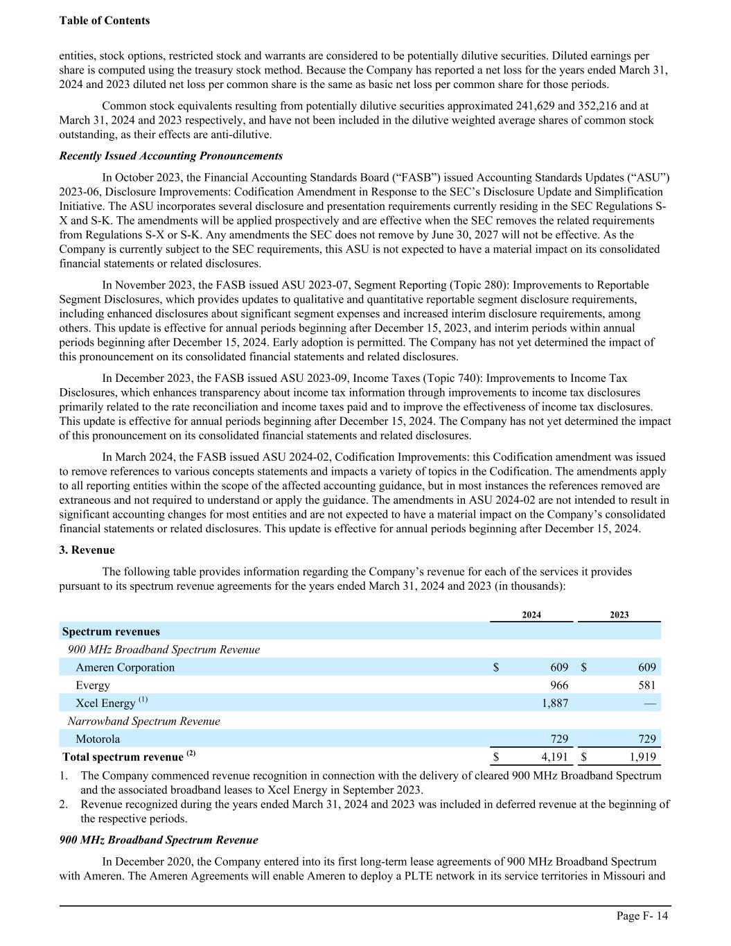 entities, stock options, restricted stock and warrants are considered to be potentially dilutive securities. Diluted earnings per share is computed using the treasury stock method. Because the Company has reported a net loss for the years ended March 31, 2024 and 2023 diluted net loss per common share is the same as basic net loss per common share for those periods. Common stock equivalents resulting from potentially dilutive securities approximated 241,629 and 352,216 and at March 31, 2024 and 2023 respectively, and have not been included in the dilutive weighted average shares of common stock outstanding, as their effects are anti-dilutive. Recently Issued Accounting Pronouncements In October 2023, the Financial Accounting Standards Board (“FASB”) issued Accounting Standards Updates (“ASU”) 2023-06, Disclosure Improvements: Codification Amendment in Response to the SEC’s Disclosure Update and Simplification Initiative. The ASU incorporates several disclosure and presentation requirements currently residing in the SEC Regulations S- X and S-K. The amendments will be applied prospectively and are effective when the SEC removes the related requirements from Regulations S-X or S-K. Any amendments the SEC does not remove by June 30, 2027 will not be effective. As the Company is currently subject to the SEC requirements, this ASU is not expected to have a material impact on its consolidated financial statements or related disclosures. In November 2023, the FASB issued ASU 2023-07, Segment Reporting (Topic 280): Improvements to Reportable Segment Disclosures, which provides updates to qualitative and quantitative reportable segment disclosure requirements, including enhanced disclosures about significant segment expenses and increased interim disclosure requirements, among others. This update is effective for annual periods beginning after December 15, 2023, and interim periods within annual periods beginning after December 15, 2024. Early adoption is permitted. The Company has not yet determined the impact of this pronouncement on its consolidated financial statements and related disclosures. In December 2023, the FASB issued ASU 2023-09, Income Taxes (Topic 740): Improvements to Income Tax Disclosures, which enhances transparency about income tax information through improvements to income tax disclosures primarily related to the rate reconciliation and income taxes paid and to improve the effectiveness of income tax disclosures. This update is effective for annual periods beginning after December 15, 2024. The Company has not yet determined the impact of this pronouncement on its consolidated financial statements and related disclosures. In March 2024, the FASB issued ASU 2024-02, Codification Improvements: this Codification amendment was issued to remove references to various concepts statements and impacts a variety of topics in the Codification. The amendments apply to all reporting entities within the scope of the affected accounting guidance, but in most instances the references removed are extraneous and not required to understand or apply the guidance. The amendments in ASU 2024-02 are not intended to result in significant accounting changes for most entities and are not expected to have a material impact on the Company’s consolidated financial statements or related disclosures. This update is effective for annual periods beginning after December 15, 2024. 3. Revenue The following table provides information regarding the Company’s revenue for each of the services it provides pursuant to its spectrum revenue agreements for the years ended March 31, 2024 and 2023 (in thousands): ͏ 2024 2023 Spectrum revenues 900 MHz Broadband Spectrum Revenue Ameren Corporation $ 609 $ 609 Evergy 966 581 Xcel Energy (1) 1,887 — Narrowband Spectrum Revenue Motorola 729 729 Total spectrum revenue (2) $ 4,191 $ 1,919 1. The Company commenced revenue recognition in connection with the delivery of cleared 900 MHz Broadband Spectrum and the associated broadband leases to Xcel Energy in September 2023. 2. Revenue recognized during the years ended March 31, 2024 and 2023 was included in deferred revenue at the beginning of the respective periods. 900 MHz Broadband Spectrum Revenue In December 2020, the Company entered into its first long-term lease agreements of 900 MHz Broadband Spectrum with Ameren. The Ameren Agreements will enable Ameren to deploy a PLTE network in its service territories in Missouri and Table of Contents Page F- 14