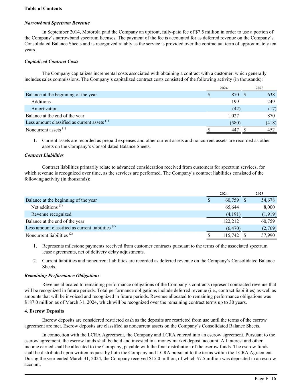Narrowband Spectrum Revenue In September 2014, Motorola paid the Company an upfront, fully-paid fee of $7.5 million in order to use a portion of the Company’s narrowband spectrum licenses. The payment of the fee is accounted for as deferred revenue on the Company’s Consolidated Balance Sheets and is recognized ratably as the service is provided over the contractual term of approximately ten years. Capitalized Contract Costs The Company capitalizes incremental costs associated with obtaining a contract with a customer, which generally includes sales commissions. The Company’s capitalized contract costs consisted of the following activity (in thousands): ͏ 2024 2023 Balance at the beginning of the year $ 870 $ 638 Additions 199 249 Amortization (42) (17) Balance at the end of the year 1,027 870 Less amount classified as current assets (1) (580) (418) Noncurrent assets (1) $ 447 $ 452 1. Current assets are recorded as prepaid expenses and other current assets and noncurrent assets are recorded as other assets on the Company’s Consolidated Balance Sheets. Contract Liabilities Contract liabilities primarily relate to advanced consideration received from customers for spectrum services, for which revenue is recognized over time, as the services are performed. The Company’s contract liabilities consisted of the following activity (in thousands): ͏ 2024 2023 Balance at the beginning of the year $ 60,759 $ 54,678 Net additions (1) 65,644 8,000 Revenue recognized (4,191) (1,919) Balance at the end of the year 122,212 60,759 Less amount classified as current liabilities (2) (6,470) (2,769) Noncurrent liabilities (2) $ 115,742 $ 57,990 1. Represents milestone payments received from customer contracts pursuant to the terms of the associated spectrum lease agreements, net of delivery delay adjustments. 2. Current liabilities and noncurrent liabilities are recorded as deferred revenue on the Company’s Consolidated Balance Sheets. Remaining Performance Obligations Revenue allocated to remaining performance obligations of the Company’s contracts represent contracted revenue that will be recognized in future periods. Total performance obligations include deferred revenue (i.e., contract liabilities) as well as amounts that will be invoiced and recognized in future periods. Revenue allocated to remaining performance obligations was $187.0 million as of March 31, 2024, which will be recognized over the remaining contract terms up to 30 years. 4. Escrow Deposits Escrow deposits are considered restricted cash as the deposits are restricted from use until the terms of the escrow agreement are met. Escrow deposits are classified as noncurrent assets on the Company’s Consolidated Balance Sheets. In connection with the LCRA Agreement, the Company and LCRA entered into an escrow agreement. Pursuant to the escrow agreement, the escrow funds shall be held and invested in a money market deposit account. All interest and other income earned shall be allocated to the Company, payable with the final distribution of the escrow funds. The escrow funds shall be distributed upon written request by both the Company and LCRA pursuant to the terms within the LCRA Agreement. During the year ended March 31, 2024, the Company received $15.0 million, of which $7.5 million was deposited in an escrow account. Table of Contents Page F- 16