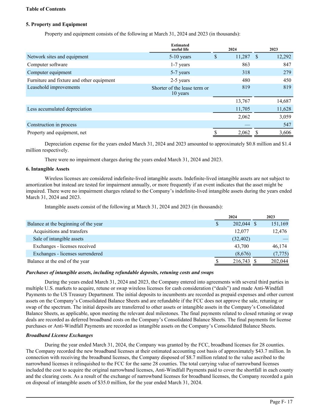 5. Property and Equipment Property and equipment consists of the following at March 31, 2024 and 2023 (in thousands): ͏ Estimated useful life 2024 2023 Network sites and equipment 5-10 years $ 11,287 $ 12,292 Computer software 1-7 years 863 847 Computer equipment 5-7 years 318 279 Furniture and fixture and other equipment 2-5 years 480 450 Leasehold improvements Shorter of the lease term or 10 years 819 819 ͏ 13,767 14,687 Less accumulated depreciation 11,705 11,628 ͏ 2,062 3,059 Construction in process — 547 Property and equipment, net $ 2,062 $ 3,606 Depreciation expense for the years ended March 31, 2024 and 2023 amounted to approximately $0.8 million and $1.4 million respectively. There were no impairment charges during the years ended March 31, 2024 and 2023. 6. Intangible Assets Wireless licenses are considered indefinite-lived intangible assets. Indefinite-lived intangible assets are not subject to amortization but instead are tested for impairment annually, or more frequently if an event indicates that the asset might be impaired. There were no impairment charges related to the Company’s indefinite-lived intangible assets during the years ended March 31, 2024 and 2023. Intangible assets consist of the following at March 31, 2024 and 2023 (in thousands): ͏ 2024 2023 Balance at the beginning of the year $ 202,044 $ 151,169 Acquisitions and transfers 12,077 12,476 Sale of intangible assets (32,402) — Exchanges - licenses received 43,700 46,174 Exchanges - licenses surrendered (8,676) (7,775) Balance at the end of the year $ 216,743 $ 202,044 Purchases of intangible assets, including refundable deposits, retuning costs and swaps During the years ended March 31, 2024 and 2023, the Company entered into agreements with several third parties in multiple U.S. markets to acquire, retune or swap wireless licenses for cash consideration (“deals”) and made Anti-Windfall Payments to the US Treasury Department. The initial deposits to incumbents are recorded as prepaid expenses and other current assets on the Company’s Consolidated Balance Sheets and are refundable if the FCC does not approve the sale, retuning or swap of the spectrum. The initial deposits are transferred to other assets or intangible assets in the Company’s Consolidated Balance Sheets, as applicable, upon meeting the relevant deal milestones. The final payments related to closed retuning or swap deals are recorded as deferred broadband costs on the Company’s Consolidated Balance Sheets. The final payments for license purchases or Anti-Windfall Payments are recorded as intangible assets on the Company’s Consolidated Balance Sheets. Broadband License Exchanges During the year ended March 31, 2024, the Company was granted by the FCC, broadband licenses for 28 counties. The Company recorded the new broadband licenses at their estimated accounting cost basis of approximately $43.7 million. In connection with receiving the broadband licenses, the Company disposed of $8.7 million related to the value ascribed to the narrowband licenses it relinquished to the FCC for the same 28 counties. The total carrying value of narrowband licenses included the cost to acquire the original narrowband licenses, Anti-Windfall Payments paid to cover the shortfall in each county and the clearing costs. As a result of the exchange of narrowband licenses for broadband licenses, the Company recorded a gain on disposal of intangible assets of $35.0 million, for the year ended March 31, 2024. Table of Contents Page F- 17