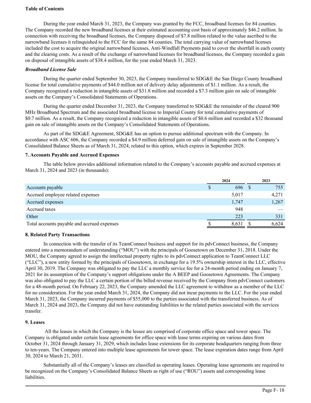During the year ended March 31, 2023, the Company was granted by the FCC, broadband licenses for 84 counties. The Company recorded the new broadband licenses at their estimated accounting cost basis of approximately $46.2 million. In connection with receiving the broadband licenses, the Company disposed of $7.8 million related to the value ascribed to the narrowband licenses it relinquished to the FCC for the same 84 counties. The total carrying value of narrowband licenses included the cost to acquire the original narrowband licenses, Anti-Windfall Payments paid to cover the shortfall in each county and the clearing costs. As a result of the exchange of narrowband licenses for broadband licenses, the Company recorded a gain on disposal of intangible assets of $38.4 million, for the year ended March 31, 2023. Broadband License Sale During the quarter ended September 30, 2023, the Company transferred to SDG&E the San Diego County broadband license for total cumulative payments of $44.0 million net of delivery delay adjustments of $1.1 million. As a result, the Company recognized a reduction in intangible assets of $31.8 million and recorded a $7.3 million gain on sale of intangible assets on the Company’s Consolidated Statements of Operations. During the quarter ended December 31, 2023, the Company transferred to SDG&E the remainder of the cleared 900 MHz Broadband Spectrum and the associated broadband license to Imperial County for total cumulative payments of $0.7 million. As a result, the Company recognized a reduction in intangible assets of $0.6 million and recorded a $32 thousand gain on sale of intangible assets on the Company’s Consolidated Statements of Operations. As part of the SDG&E Agreement, SDG&E has an option to pursue additional spectrum with the Company. In accordance with ASC 606, the Company recorded a $4.9 million deferred gain on sale of intangible assets on the Company’s Consolidated Balance Sheets as of March 31, 2024, related to this option, which expires in September 2028. 7. Accounts Payable and Accrued Expenses The table below provides additional information related to the Company’s accounts payable and accrued expenses at March 31, 2024 and 2023 (in thousands): ͏ 2024 2023 Accounts payable $ 696 $ 755 Accrued employee related expenses 5,017 4,271 Accrued expenses 1,747 1,267 Accrued taxes 948 — Other 223 331 Total accounts payable and accrued expenses $ 8,631 $ 6,624 8. Related Party Transactions In connection with the transfer of its TeamConnect business and support for its pdvConnect business, the Company entered into a memorandum of understanding (“MOU”) with the principals of Goosetown on December 31, 2018. Under the MOU, the Company agreed to assign the intellectual property rights to its pdvConnect application to TeamConnect LLC (“LLC”), a new entity formed by the principals of Goosetown, in exchange for a 19.5% ownership interest in the LLC, effective April 30, 2019. The Company was obligated to pay the LLC a monthly service fee for a 24-month period ending on January 7, 2021 for its assumption of the Company’s support obligations under the A BEEP and Goosetown Agreements. The Company was also obligated to pay the LLC a certain portion of the billed revenue received by the Company from pdvConnect customers for a 48-month period. On February 22, 2023, the Company amended the LLC agreement to withdraw as a member of the LLC for no consideration. For the year ended March 31, 2024, the Company did not incur payments to the LLC. For the year ended March 31, 2023, the Company incurred payments of $55,000 to the parties associated with the transferred business. As of March 31, 2024 and 2023, the Company did not have outstanding liabilities to the related parties associated with the services transfer. 9. Leases All the leases in which the Company is the lessee are comprised of corporate office space and tower space. The Company is obligated under certain lease agreements for office space with lease terms expiring on various dates from October 31, 2024 through January 31, 2029, which includes lease extensions for its corporate headquarters ranging from three to ten-years. The Company entered into multiple lease agreements for tower space. The lease expiration dates range from April 30, 2024 to March 21, 2031. Substantially all of the Company’s leases are classified as operating leases. Operating lease agreements are required to be recognized on the Company’s Consolidated Balance Sheets as right of use (“ROU”) assets and corresponding lease liabilities. Table of Contents Page F- 18