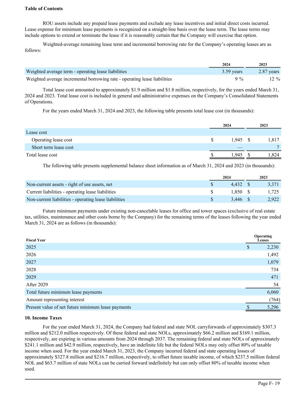 ROU assets include any prepaid lease payments and exclude any lease incentives and initial direct costs incurred. Lease expense for minimum lease payments is recognized on a straight-line basis over the lease term. The lease terms may include options to extend or terminate the lease if it is reasonably certain that the Company will exercise that option. Weighted-average remaining lease term and incremental borrowing rate for the Company’s operating leases are as follows: ͏ 2024 2023 Weighted average term - operating lease liabilities 3.59 years 2.87 years Weighted average incremental borrowing rate - operating lease liabilities 9 % 12 % Total lease cost amounted to approximately $1.9 million and $1.8 million, respectively, for the years ended March 31, 2024 and 2023. Total lease cost is included in general and administrative expenses on the Company’s Consolidated Statements of Operations. For the years ended March 31, 2024 and 2023, the following table presents total lease cost (in thousands): ͏ 2024 2023 Lease cost Operating lease cost $ 1,945 $ 1,817 Short term lease cost — 7 Total lease cost $ 1,945 $ 1,824 The following table presents supplemental balance sheet information as of March 31, 2024 and 2023 (in thousands): ͏ 2024 2023 Non-current assets - right of use assets, net $ 4,432 $ 3,371 Current liabilities - operating lease liabilities $ 1,850 $ 1,725 Non-current liabilities - operating lease liabilities $ 3,446 $ 2,922 Future minimum payments under existing non-cancelable leases for office and tower spaces (exclusive of real estate tax, utilities, maintenance and other costs borne by the Company) for the remaining terms of the leases following the year ended March 31, 2024 are as follows (in thousands): Fiscal Year Operating Leases 2025 $ 2,230 2026 1,492 2027 1,079 2028 734 2029 471 After 2029 54 Total future minimum lease payments 6,060 Amount representing interest (764) Present value of net future minimum lease payments $ 5,296 10. Income Taxes For the year ended March 31, 2024, the Company had federal and state NOL carryforwards of approximately $307.3 million and $212.0 million respectively. Of these federal and state NOLs, approximately $66.2 million and $169.1 million, respectively, are expiring in various amounts from 2024 through 2037. The remaining federal and state NOLs of approximately $241.1 million and $42.9 million, respectively, have an indefinite life but the federal NOLs may only offset 80% of taxable income when used. For the year ended March 31, 2023, the Company incurred federal and state operating losses of approximately $327.8 million and $216.7 million, respectively, to offset future taxable income, of which $237.5 million federal NOL and $63.7 million of state NOLs can be carried forward indefinitely but can only offset 80% of taxable income when used. Table of Contents Page F- 19
